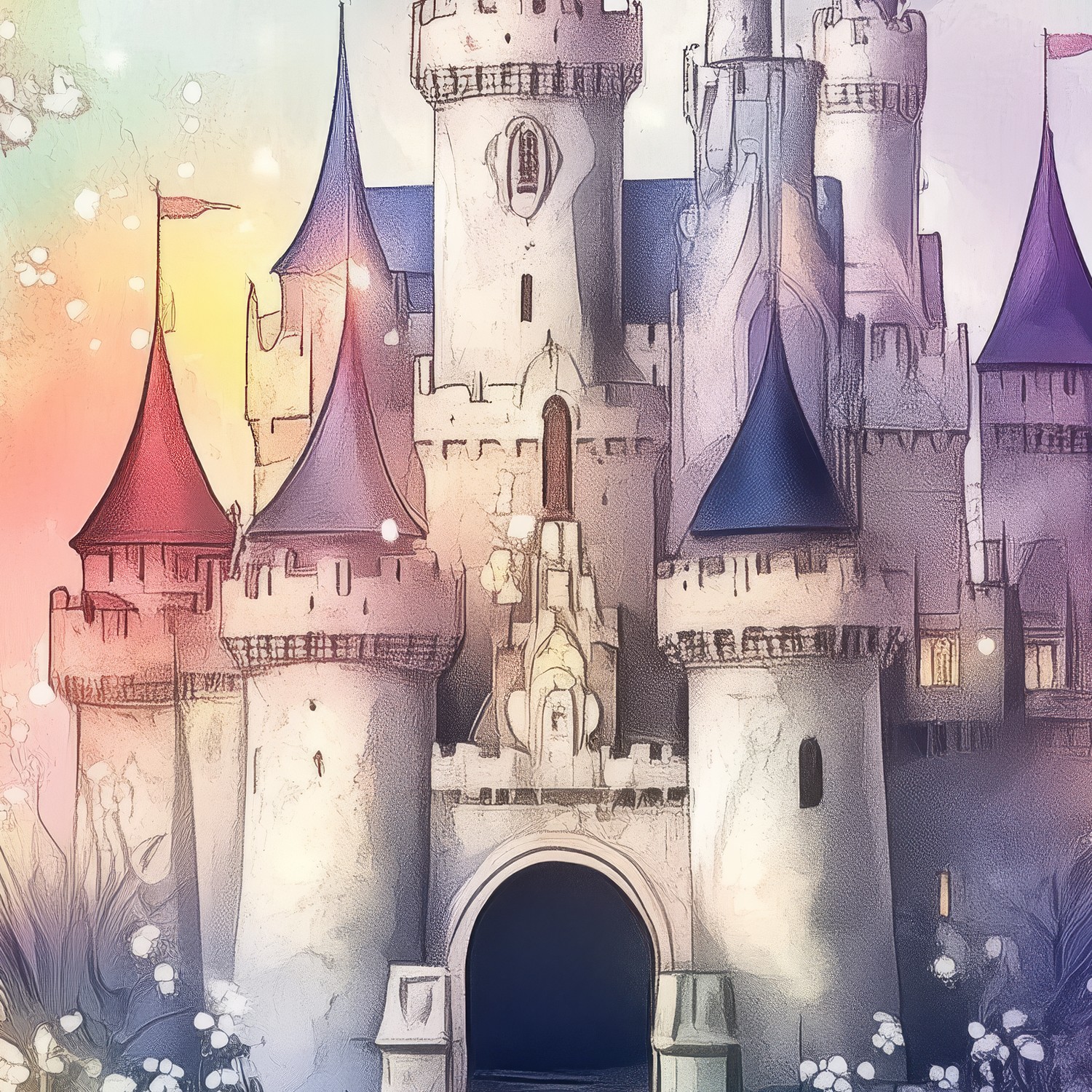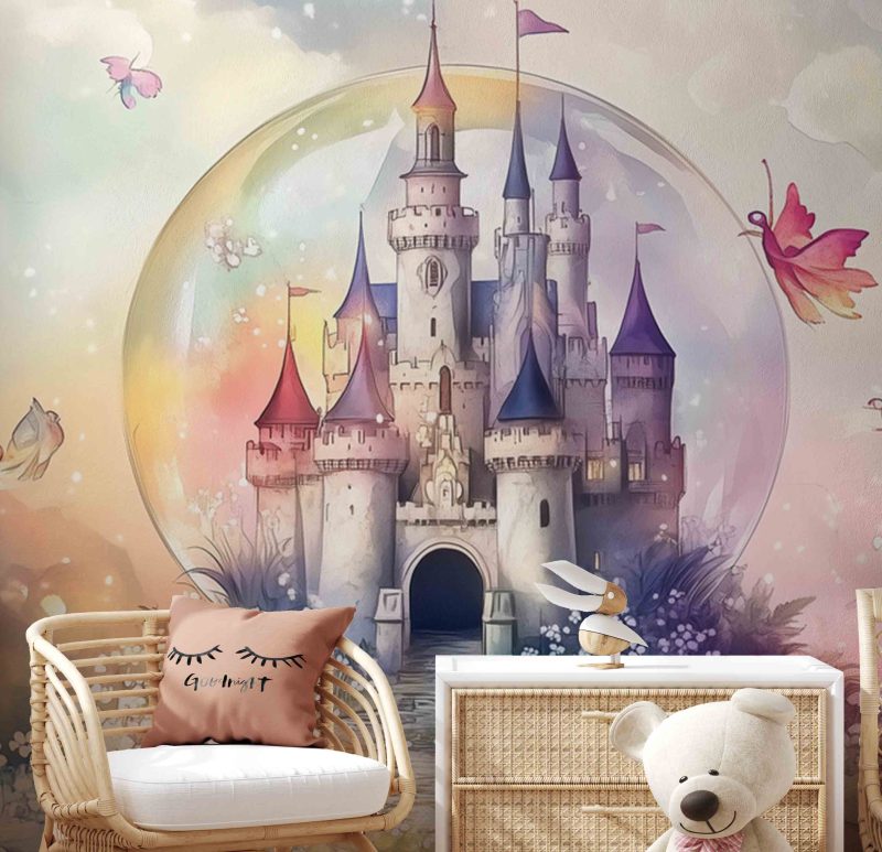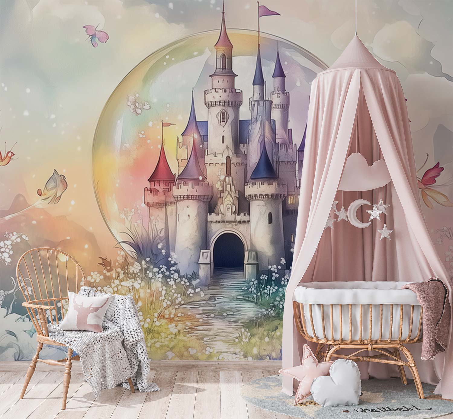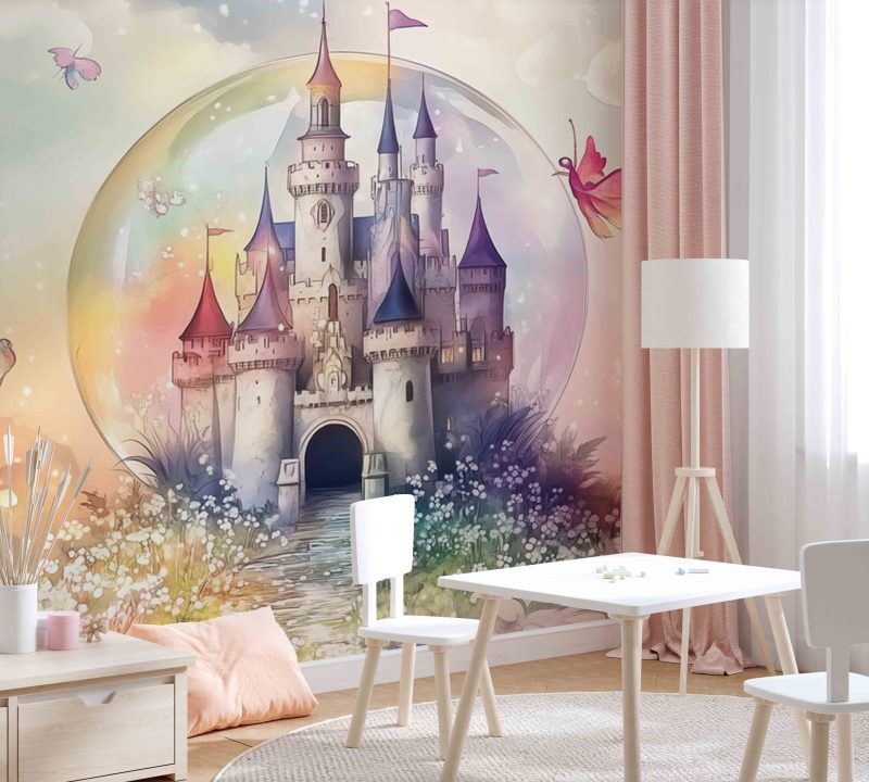 Betoverend kleurenpalet tovert een sprookjeskasteel omringd door een bruisende bloemenzee. Ranke torenspitsen dansen tussen kleurrijke wolken, terwijl geurige bloemenpracht de kamer vult met magie. Dit levendige tafereel voedt de verbeelding en creëert een vrolijke, veilige omgeving waar dromen tot leven komen – perfect voor urenlang speelplezier en zoete dromen in elke kinderkamer.