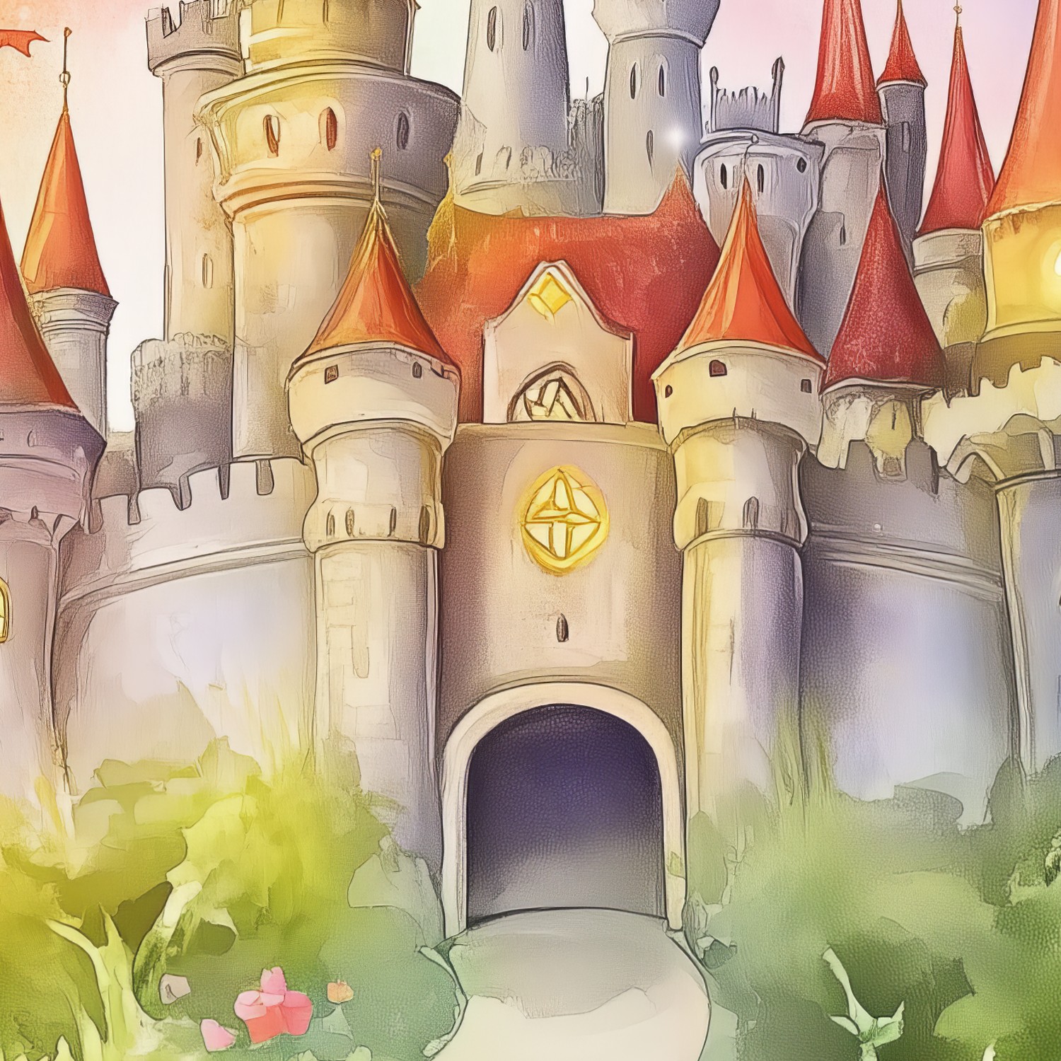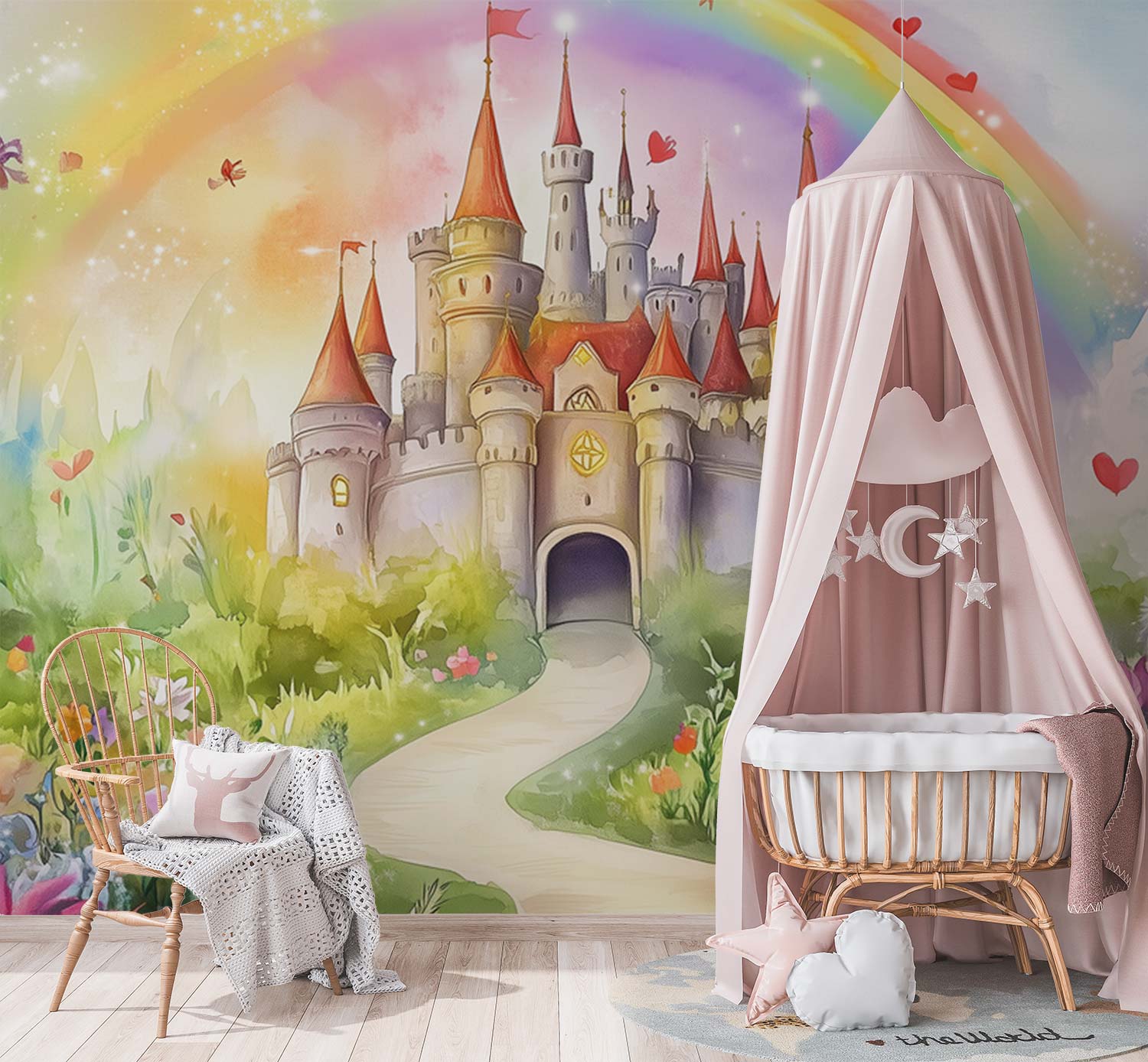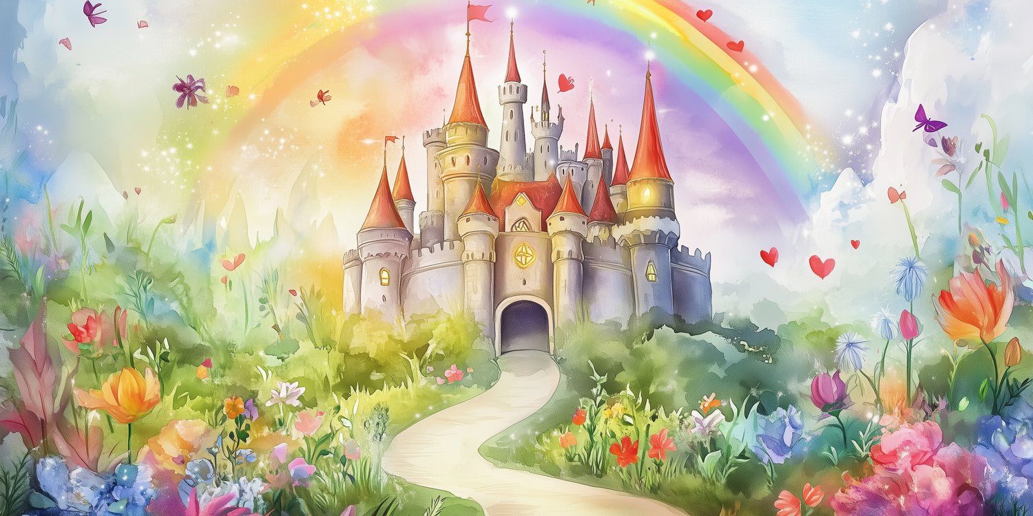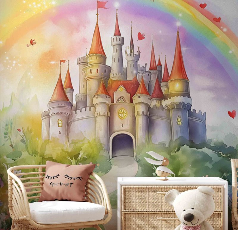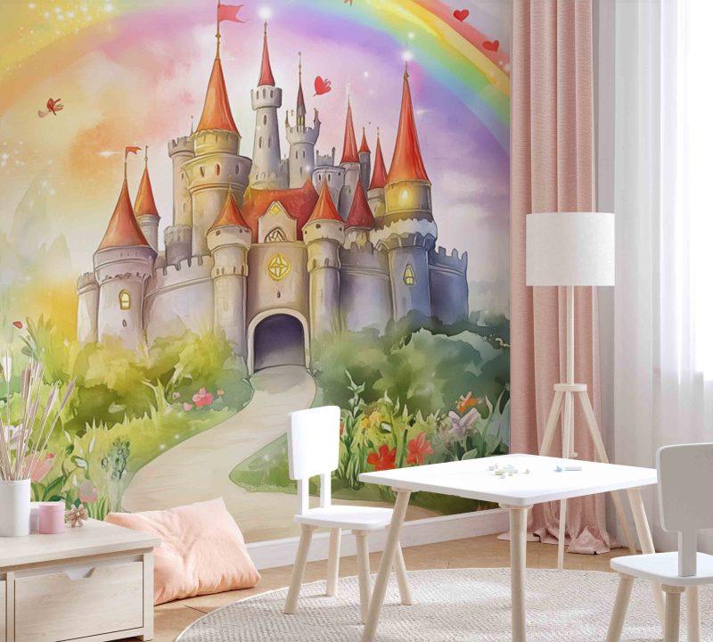 Betoverd kasteel sprankelt onder een regenboogboog! Roze torens reiken naar de lucht terwijl blauwe vlinders dansen tussen gele bloementapijten. Dit levendige tafereel brengt pure magie in de kinderkamer en voedt de verbeelding met eindeloze sprookjesavonturen.