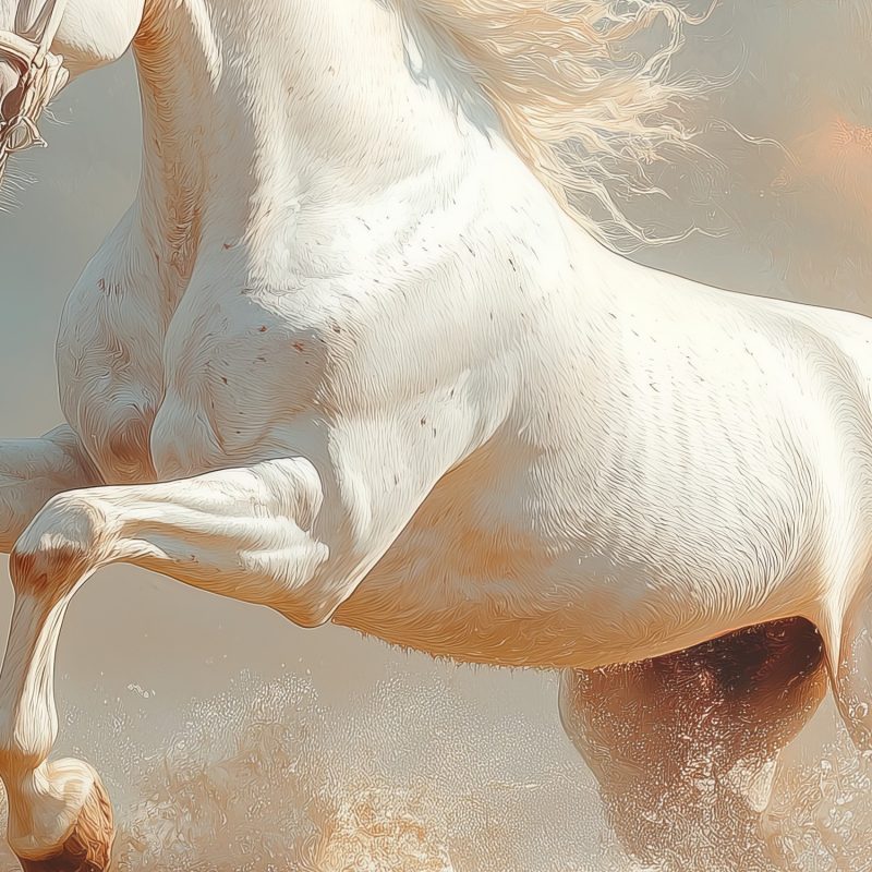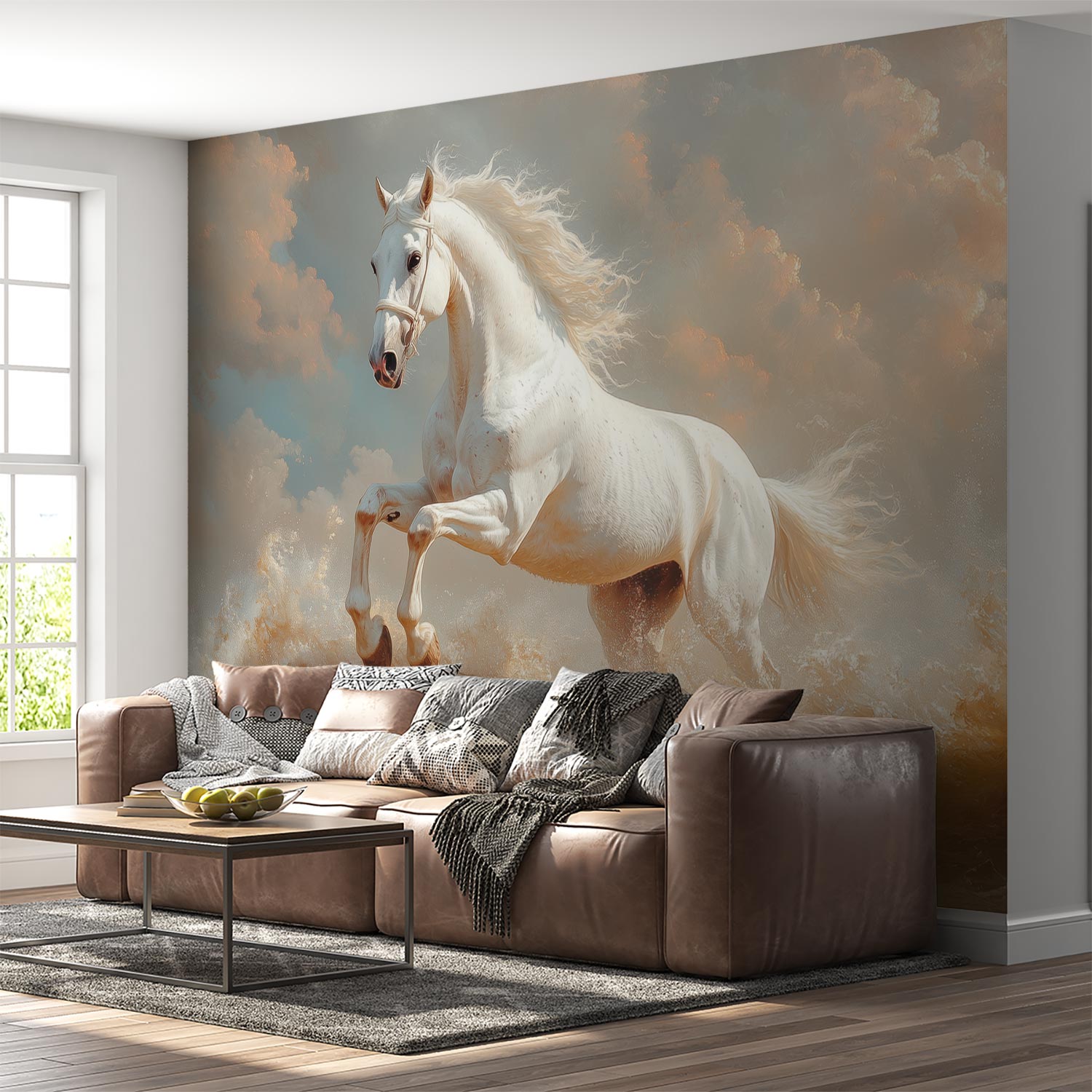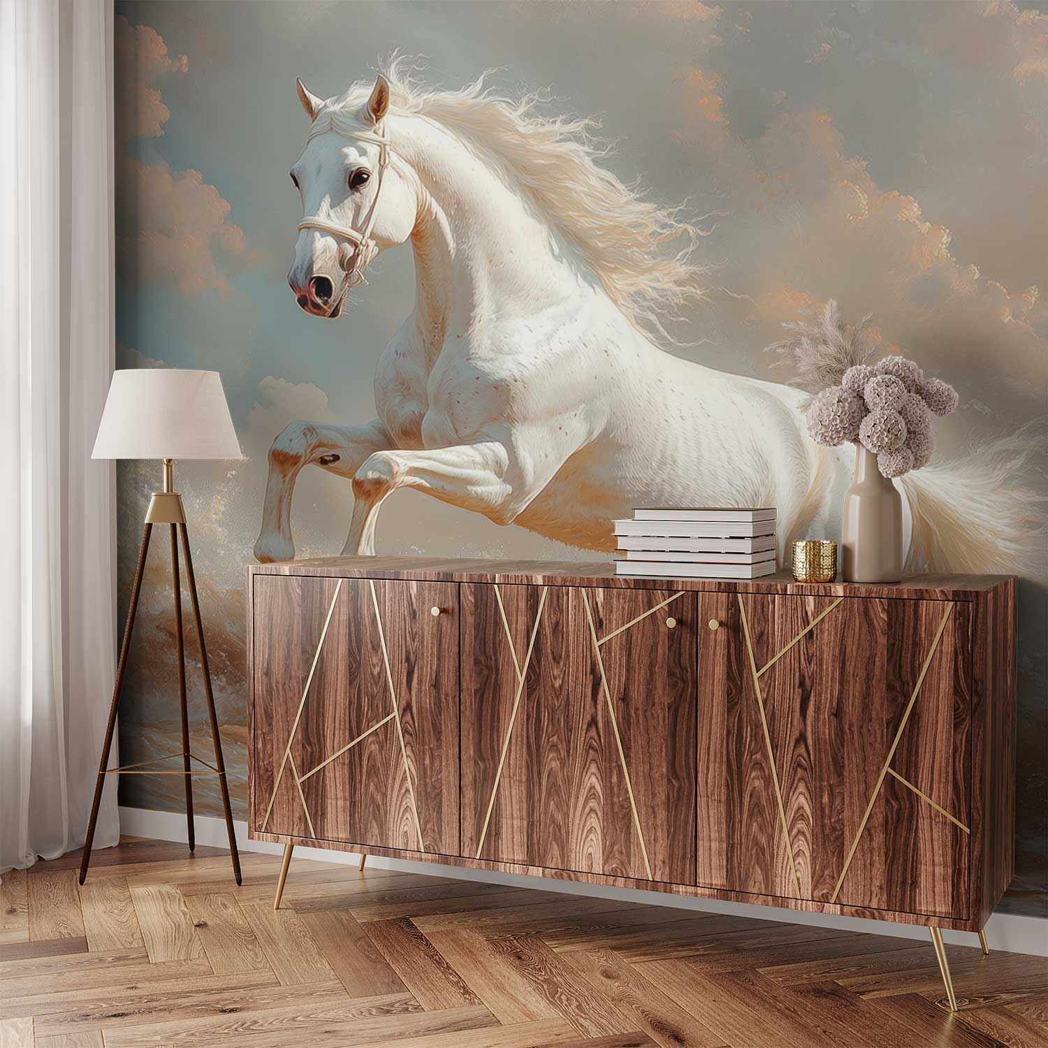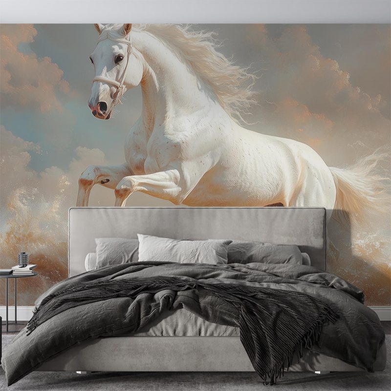 Vurige oranje tinten omarmen een majestueus wit paard dat krachtig door het water galoppeert. Wolken jagen langs de dynamische lucht terwijl zijn manen wapperen in volle vaart. Dit behang brengt pure energie en vrijheid in je ruimte, perfect voor wie verlangt naar een statement vol natuurlijke kracht en beweging.