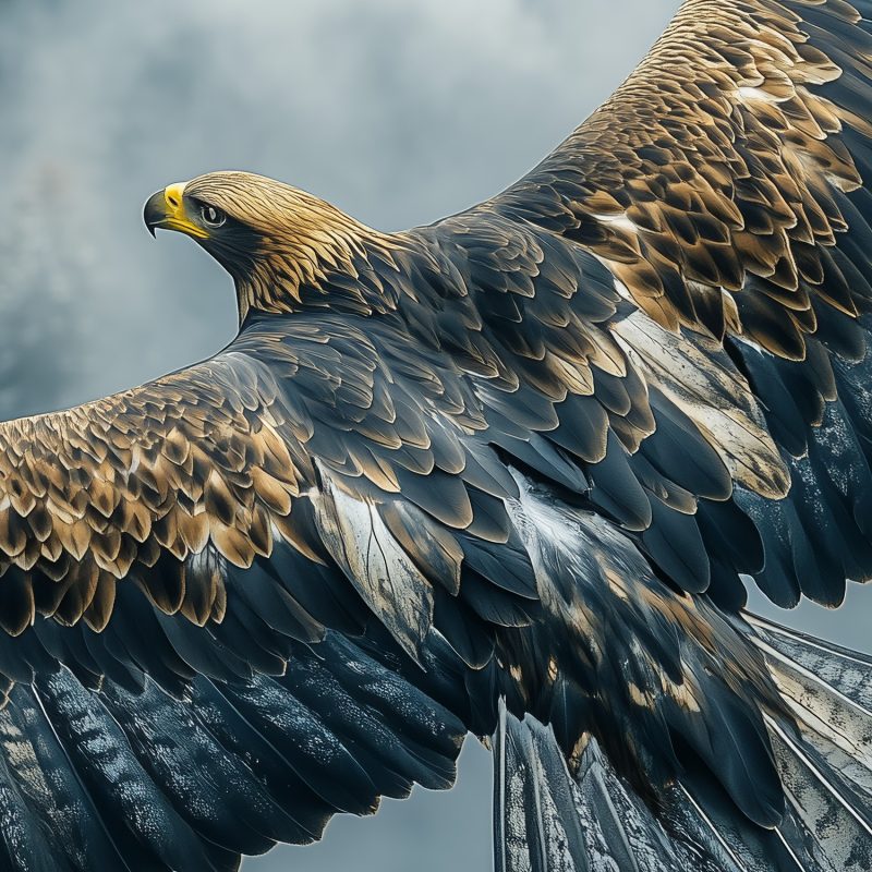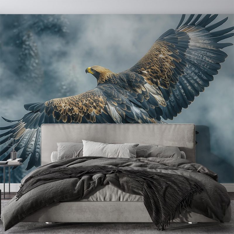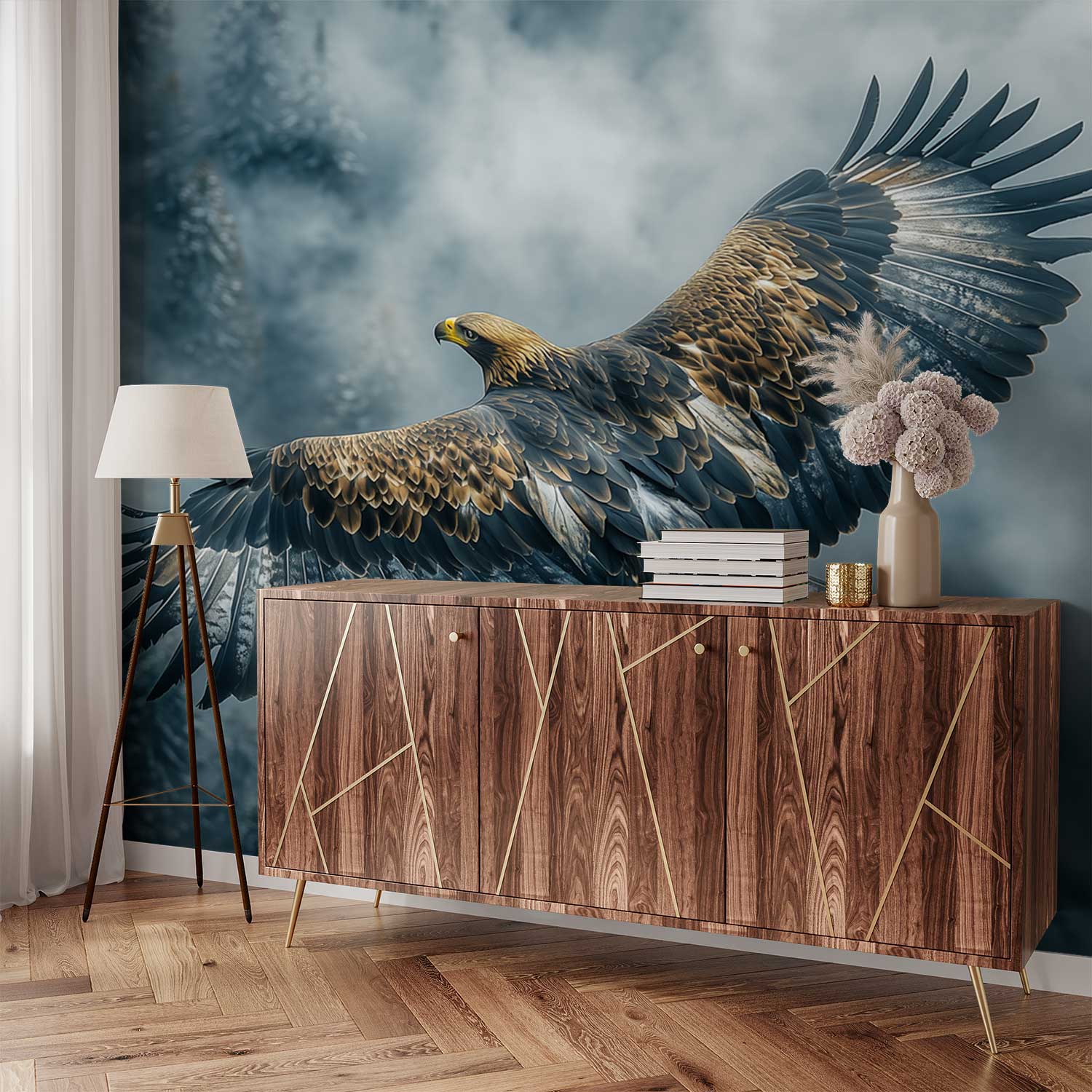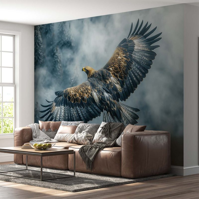 Zwevend door mistige luchten domineert een adelaar het tafereel met zijn imposante vleugels. Diepe bruinen en zwarten mengen zich met vage groentinten, omhuld door een serene sfeer van mysterie en vrijheid. Dit behang brengt de indrukwekkende grootsheid van de natuur naar uw muur, waar de majestueuze verschijning elke ruimte transformeert tot een statement van kracht en elegantie.