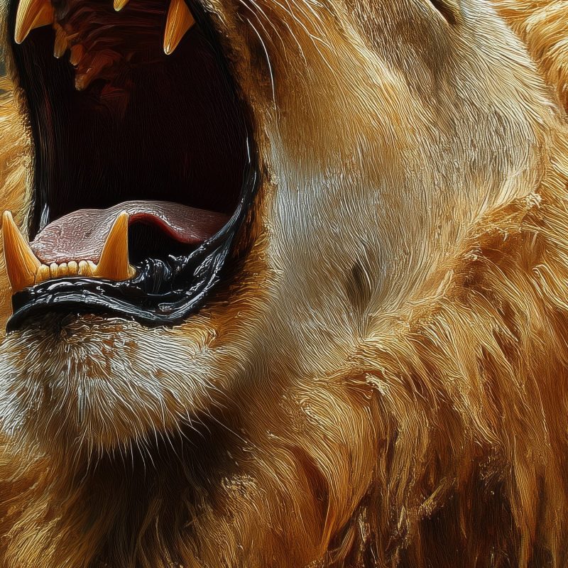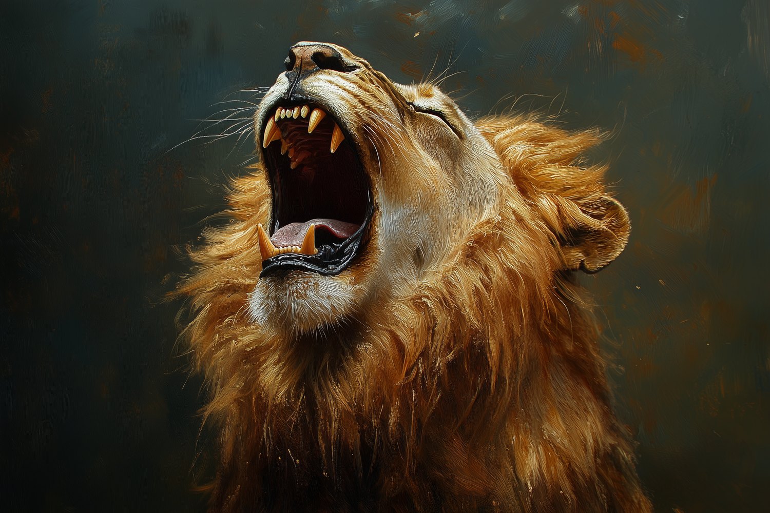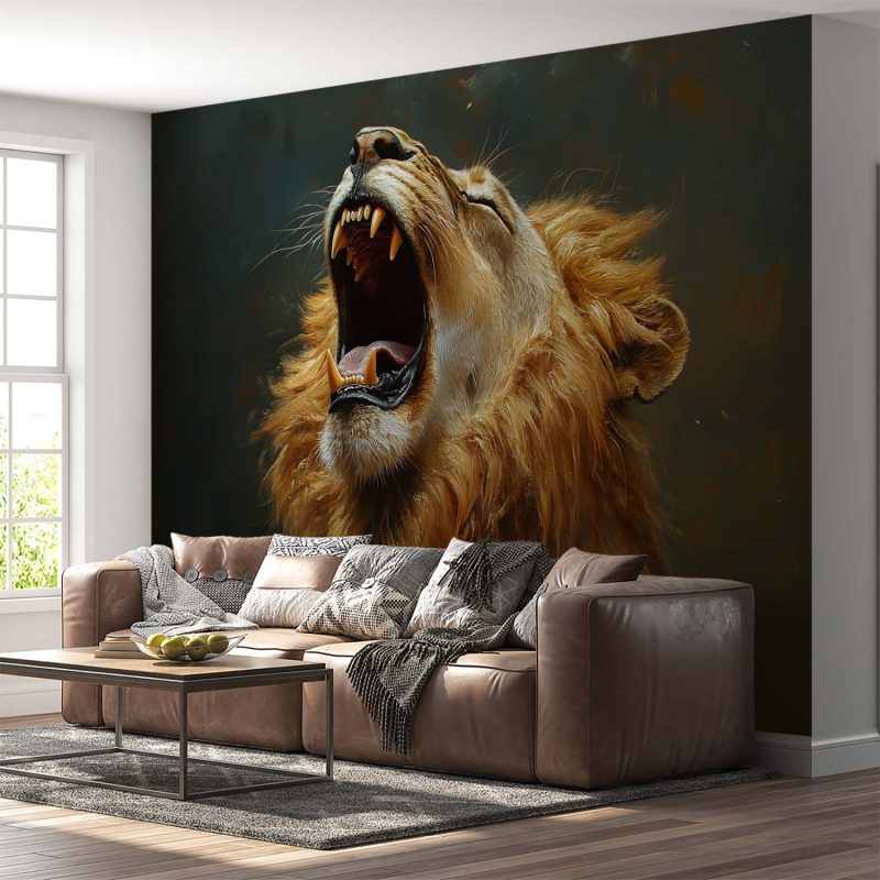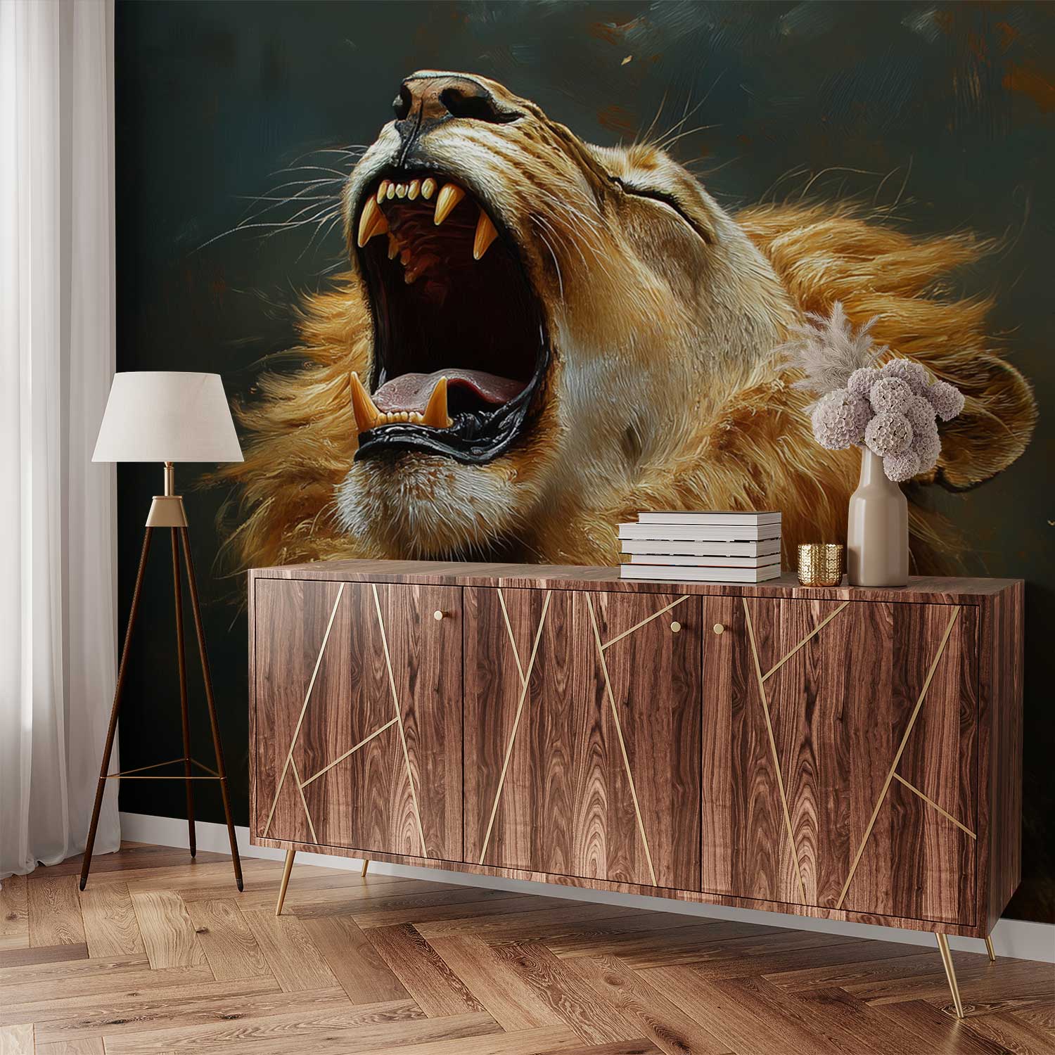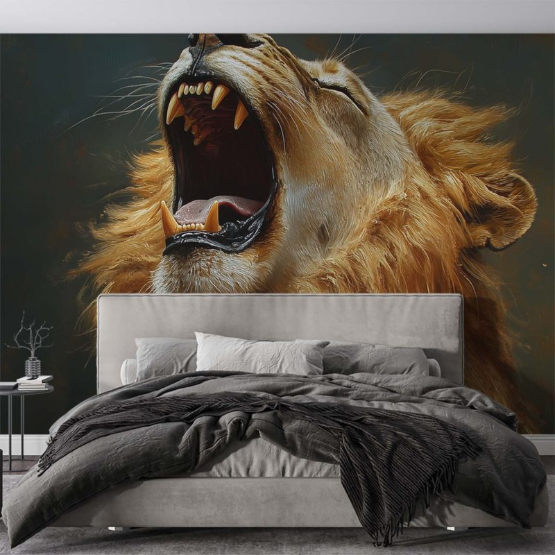 Gouden manen wervelen rond een machtige brul, scherpe tanden fonkelen in het donker. Dit portret straalt pure, rauwe kracht uit en brengt een gevoel van wild avontuur in je ruimte. De intense uitstraling en het contrasterende kleurenspel maken een gedurfd statement, perfect om een muur tot leven te wekken met onmiskenbare energie en karakter.