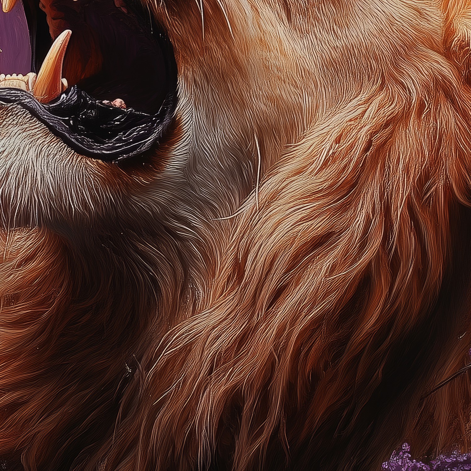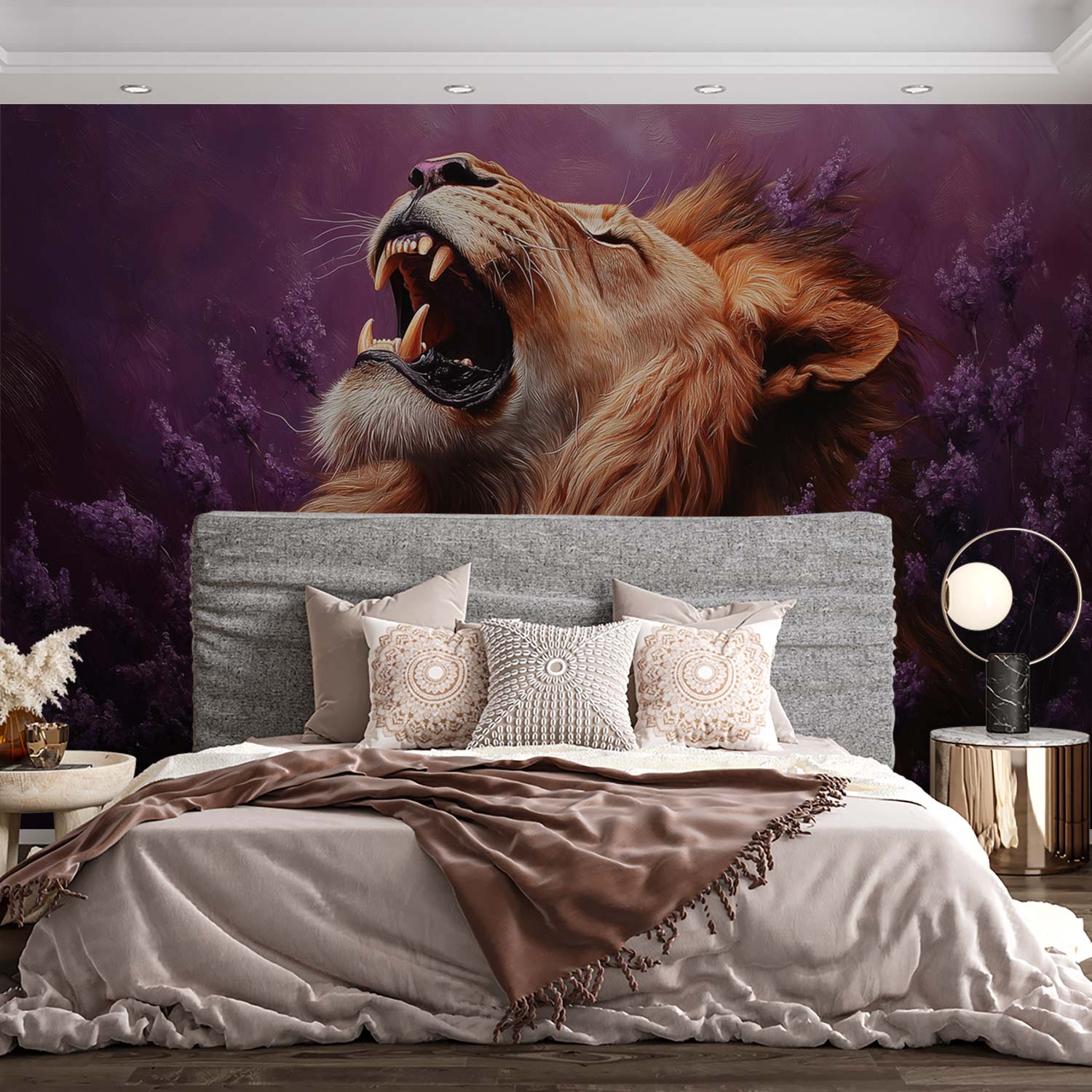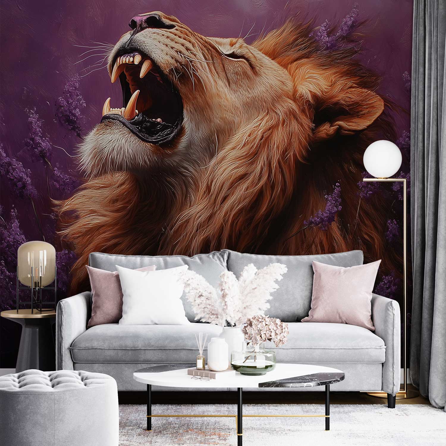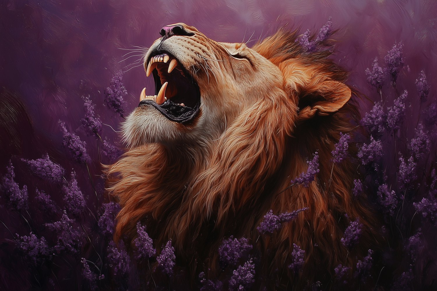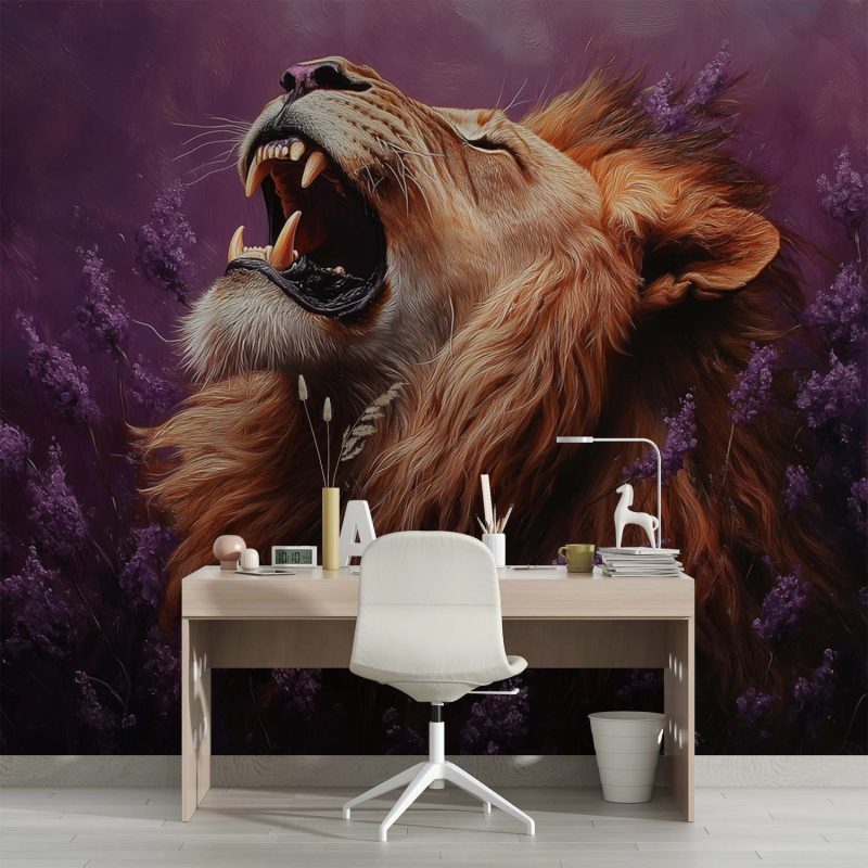 Een diep paarse achtergrond ontvouwt zich rond deze majestueuze leeuw, zijn gouden manen wuivend in een stille brul. Violette bloemen omkransen zijn krachtige verschijning terwijl zijn gesloten ogen sereniteit uitstralen. Deze levendige scène brengt wildernis en elegantie samen, perfect voor een statement muur die zowel avontuur als rust uitstraalt in je interieur.