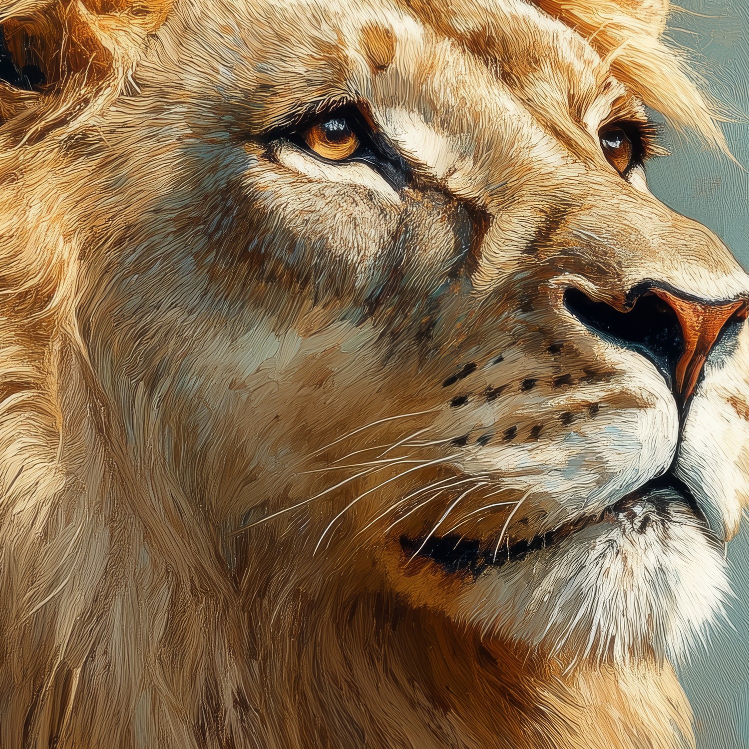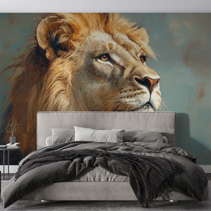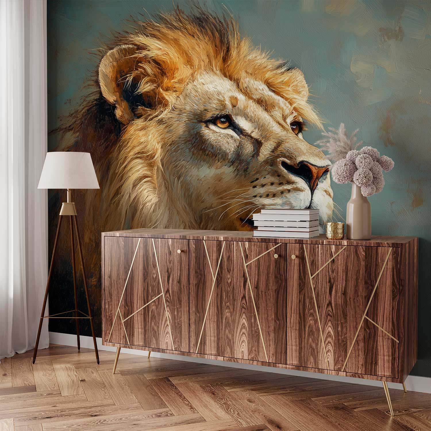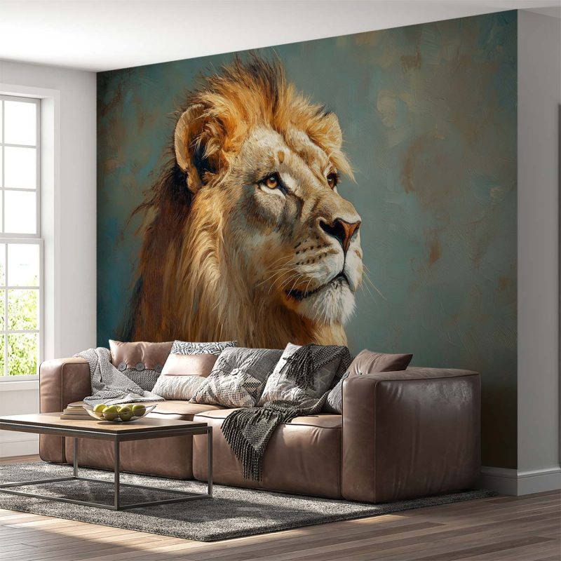 Gouden stralen schitteren in zijn weelderige manen, terwijl een koninklijke blik je uitnodigt in zijn wereld. Tegen een rustige blauwe achtergrond straalt deze leeuw kracht en warmte uit, alsof hij elk moment tot leven komt. Zijn realistische verschijning brengt majesteit en troost in je ruimte, een statement van wild elegance dat zowel energie als sereniteit toevoegt aan je interieur.