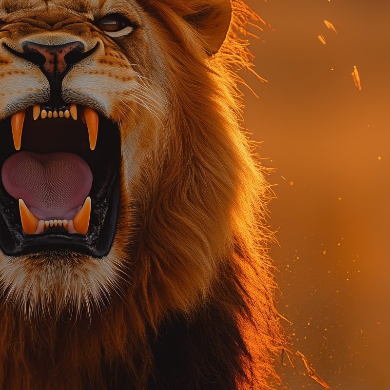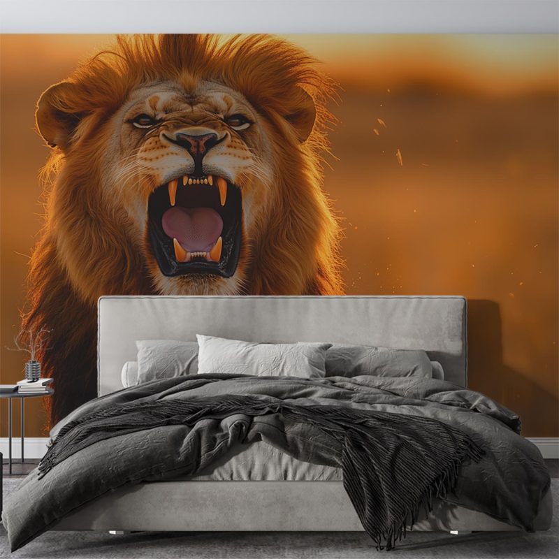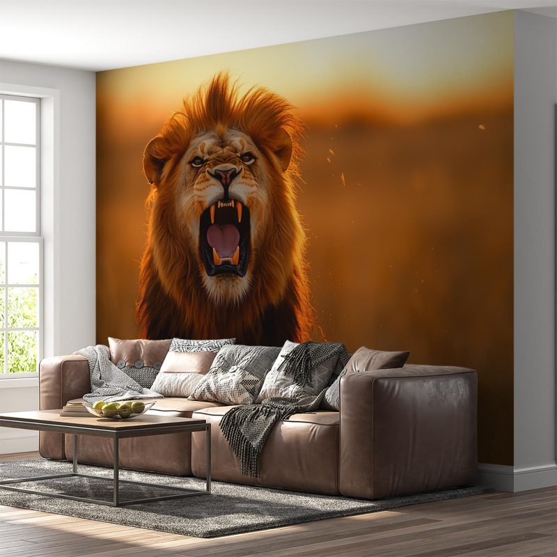 Gouden zonnestralen omkaderen een trotse leeuw, zijn oranje vacht gloeit tegen de ondergaande zon. Met geopende muil en doordringende blik eist hij alle aandacht op, klaar om te brullen. Deze muurdecoratie brengt wild, koninklijk drama in je interieur en transformeert elke ruimte met zijn rauwe, ongetemde energie.