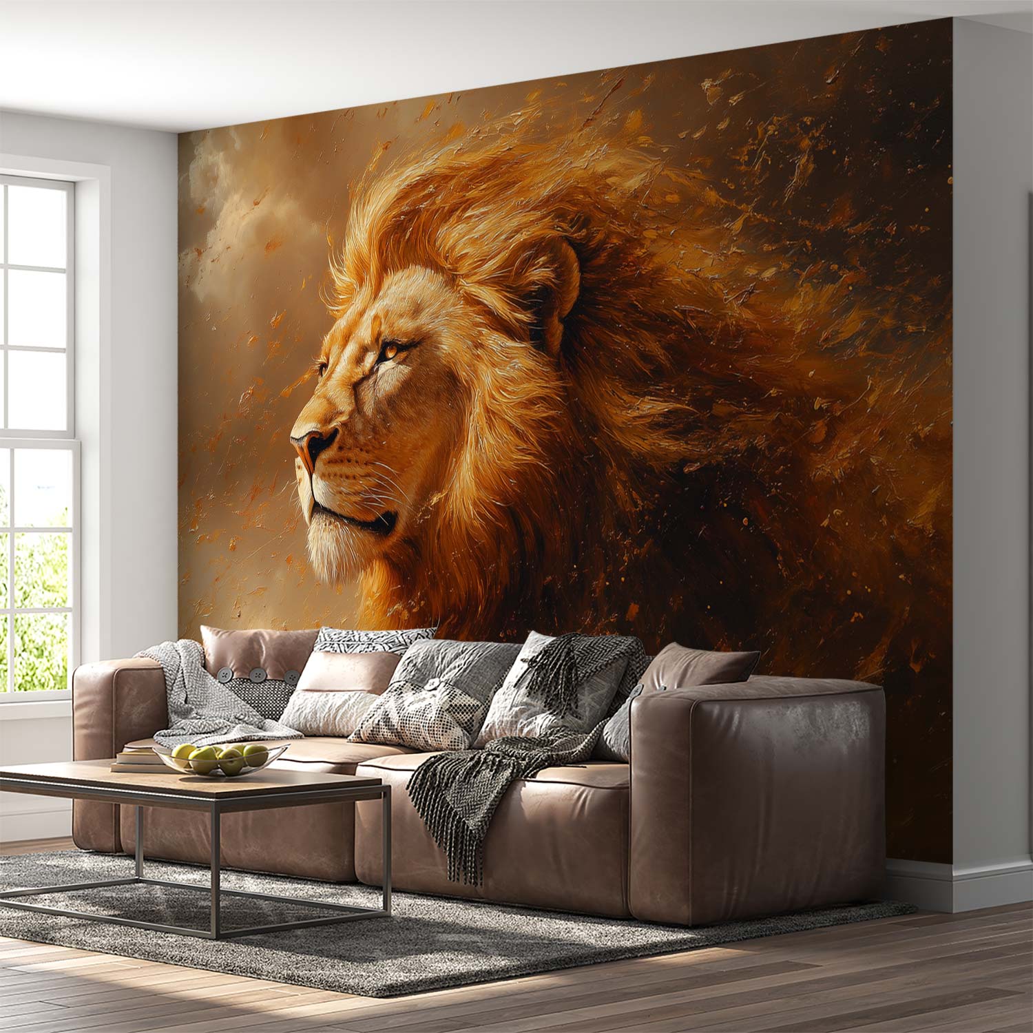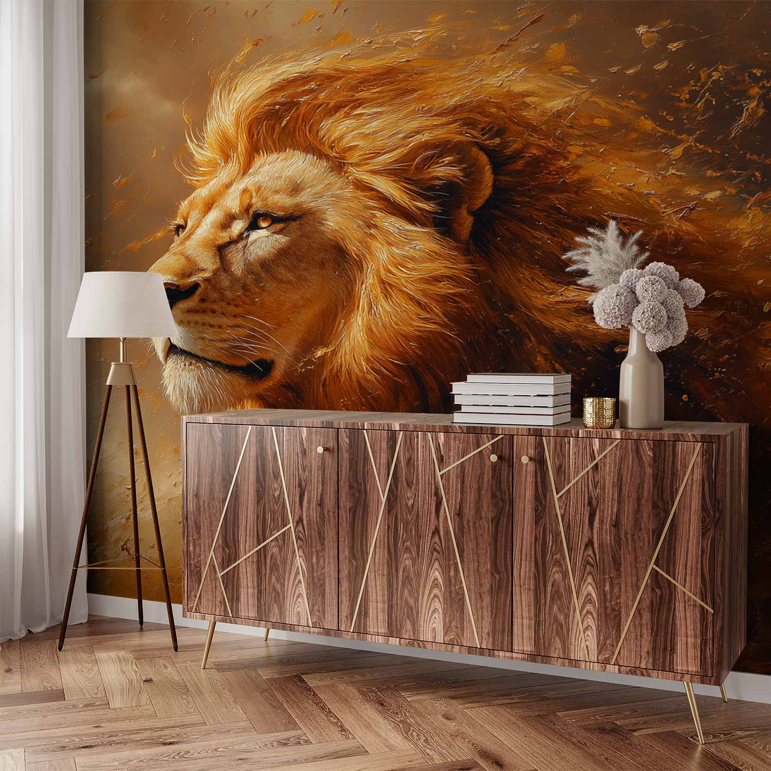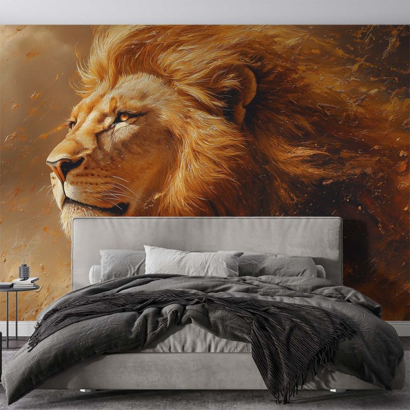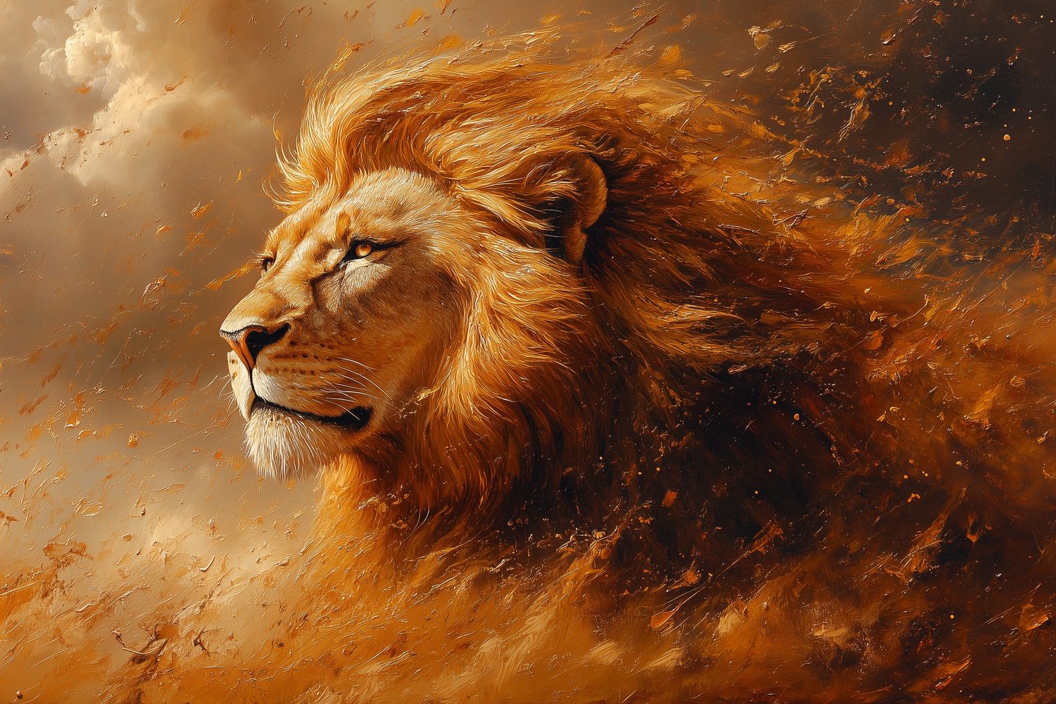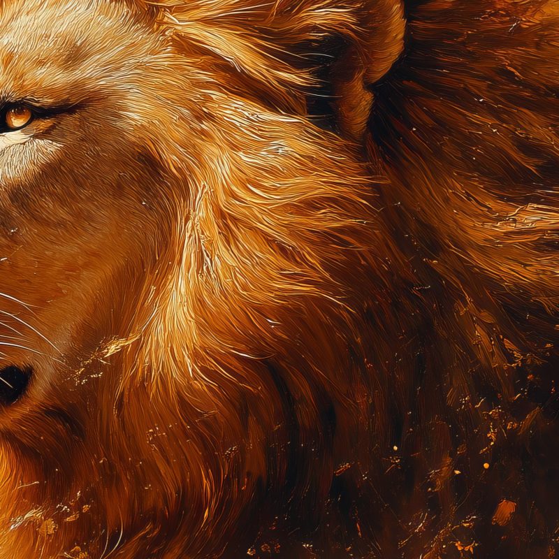 Manegevecht in oranje en bruin tinten, deze leeuw stormt met krachtige gratie door het beeld. Zijn trotse blik en wapperende manen stralen pure vrijheid uit. Levendige penseelstreken versterken de dynamiek. Breng deze koninklijke energie in huis voor een statement vol passie en karakter.