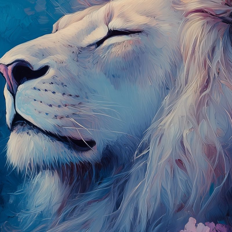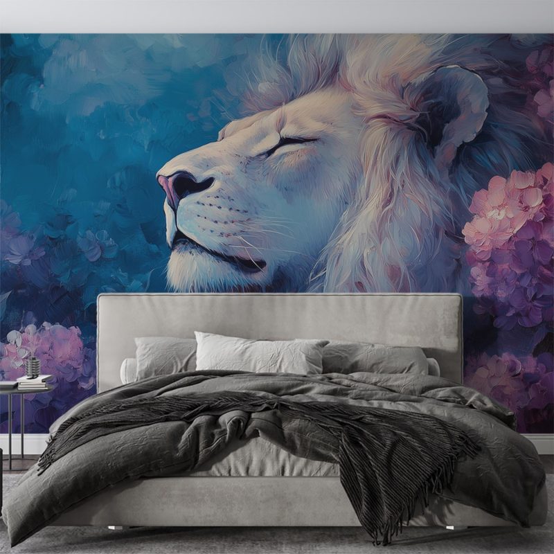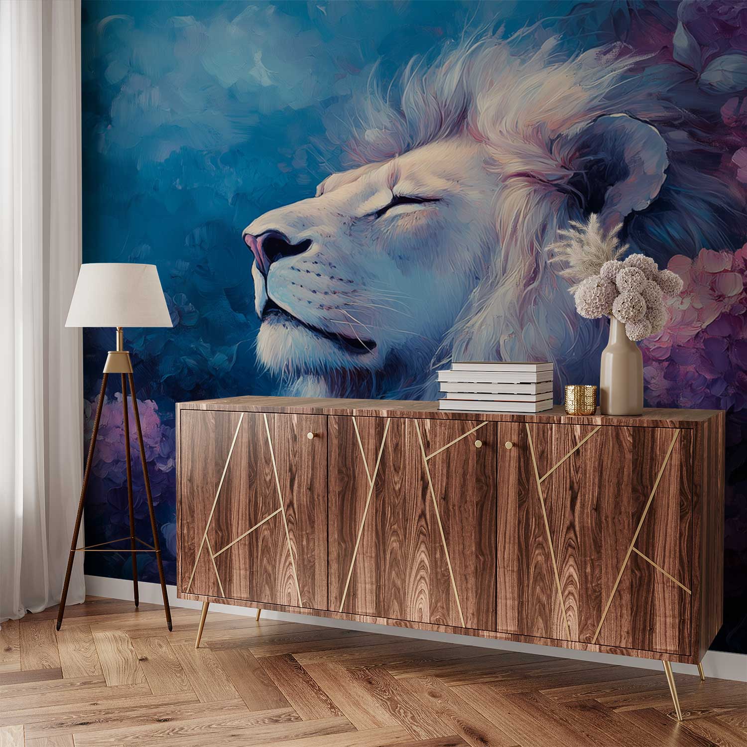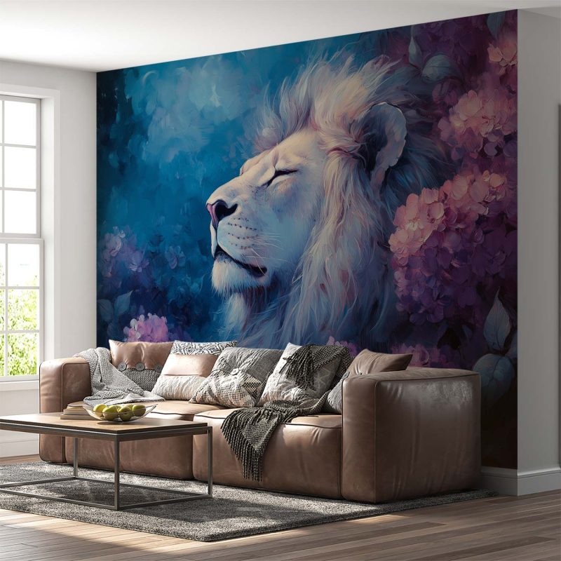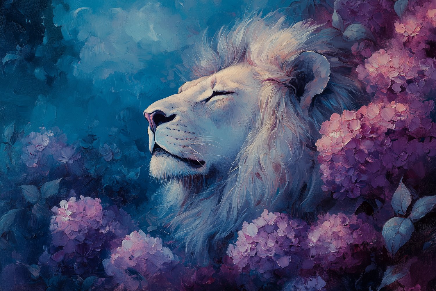 Zachte blauwe en paarse tinten omarmen een majestueuze leeuw temidden van een weelderige bloementuin. Zijn krachtige blik weerspiegelt de serene sfeer terwijl kleurrijke hortensia’s zachtjes om hem heen dansen. Dit levendige tafereel brengt harmonie en natuurlijke elegantie in uw ruimte, waardoor elke muur transformeert tot een rustgevend kunstwerk vol diepte en textuur.