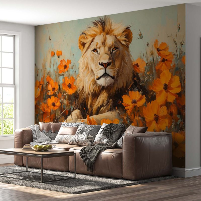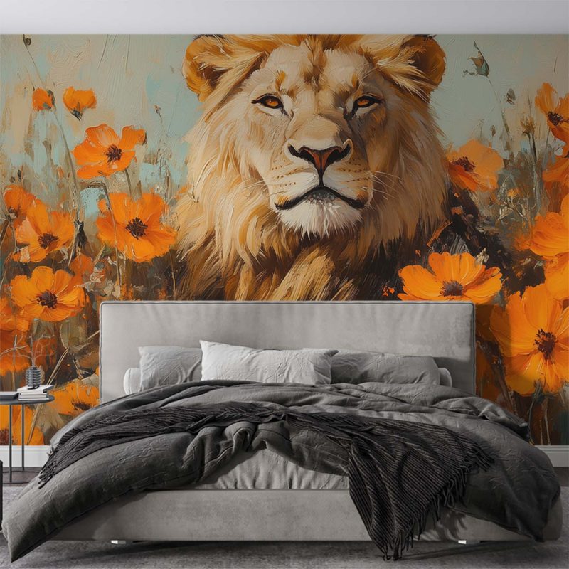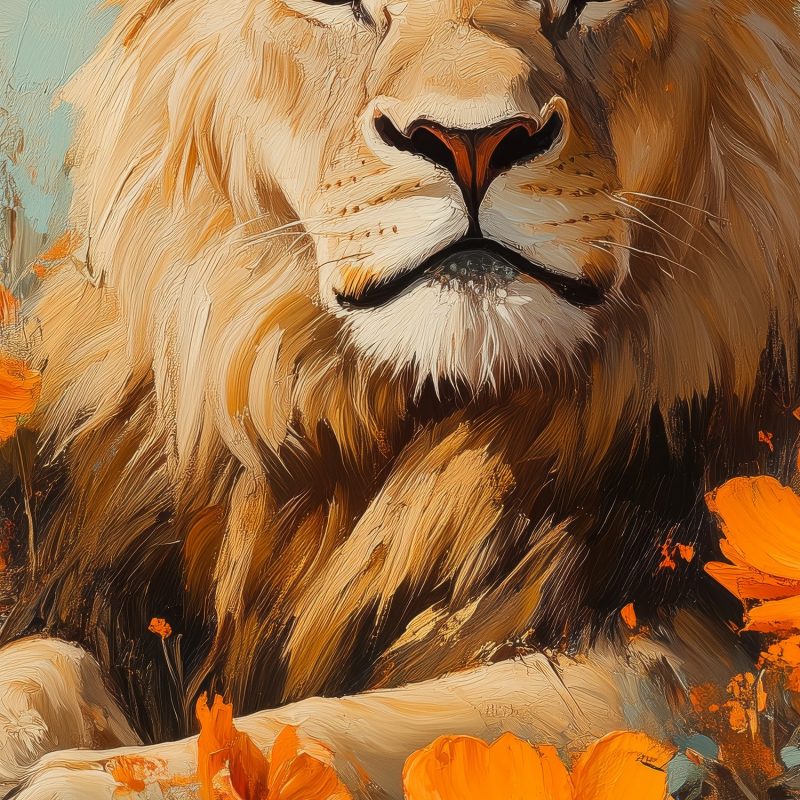 Zachte oranje en gele tinten dansen rond een rustende leeuw in een bloemenzee. Zijn serene blik straalt kalmte uit terwijl impressionistische penseelstreken een warme, levendige sfeer creëren. Dit harmonieuze tafereel brengt rust en natuurlijke elegantie in uw ruimte, perfect voor een accentmuur die zowel energie als geborgenheid uitstraalt.