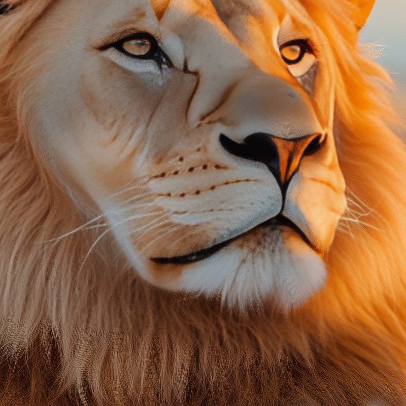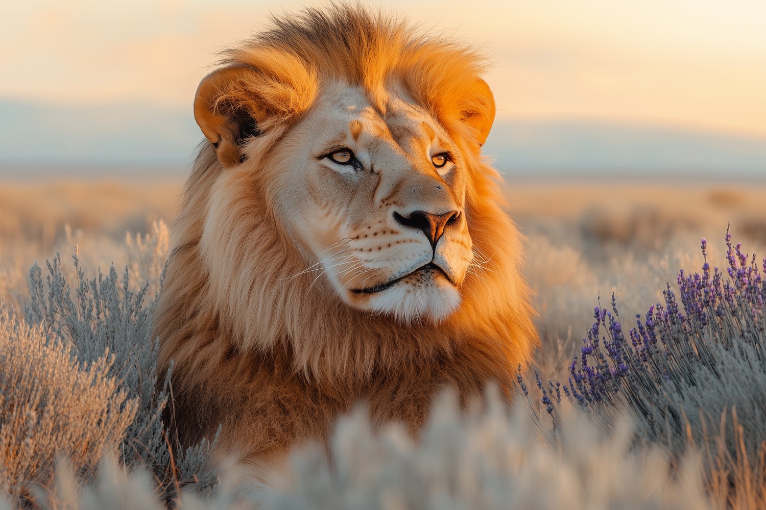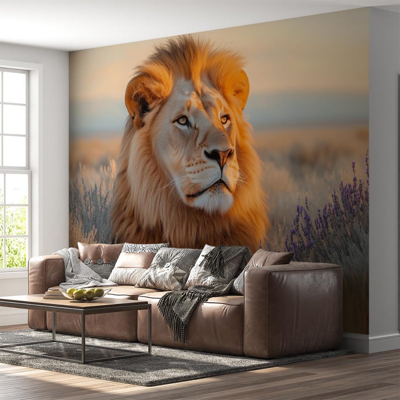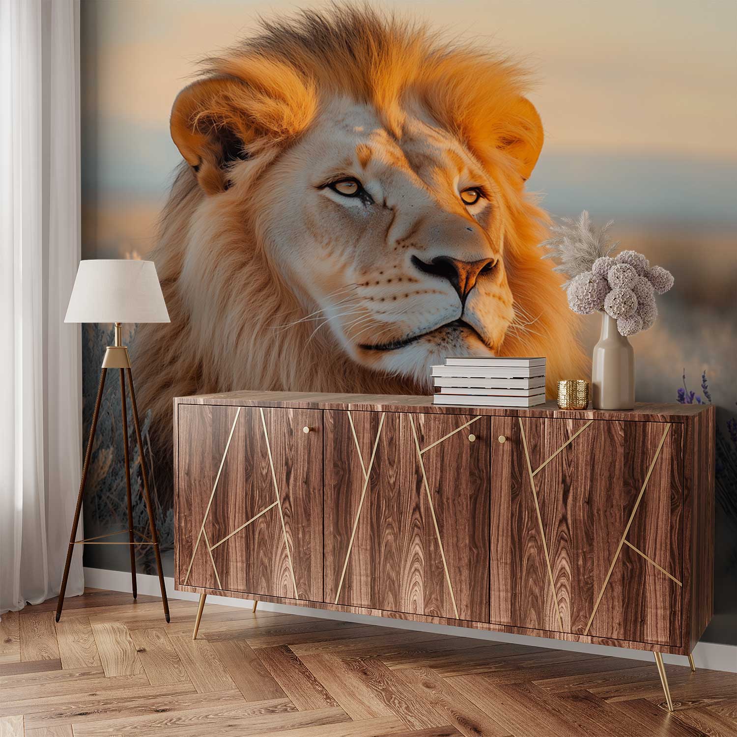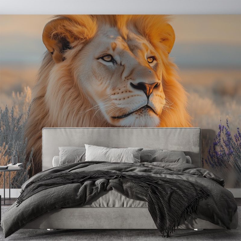 Gouden gloed van de ondergaande zon omhult de rustende leeuw in een zee van wuivend gras en paarse bloemen. Zijn intense blik weerspiegelt de warme sereniteit van dit wilde landschap. Dit behang brengt de kalme grootsheid van de natuur in huis en creëert een indrukwekkend rustpunt in elke ruimte.