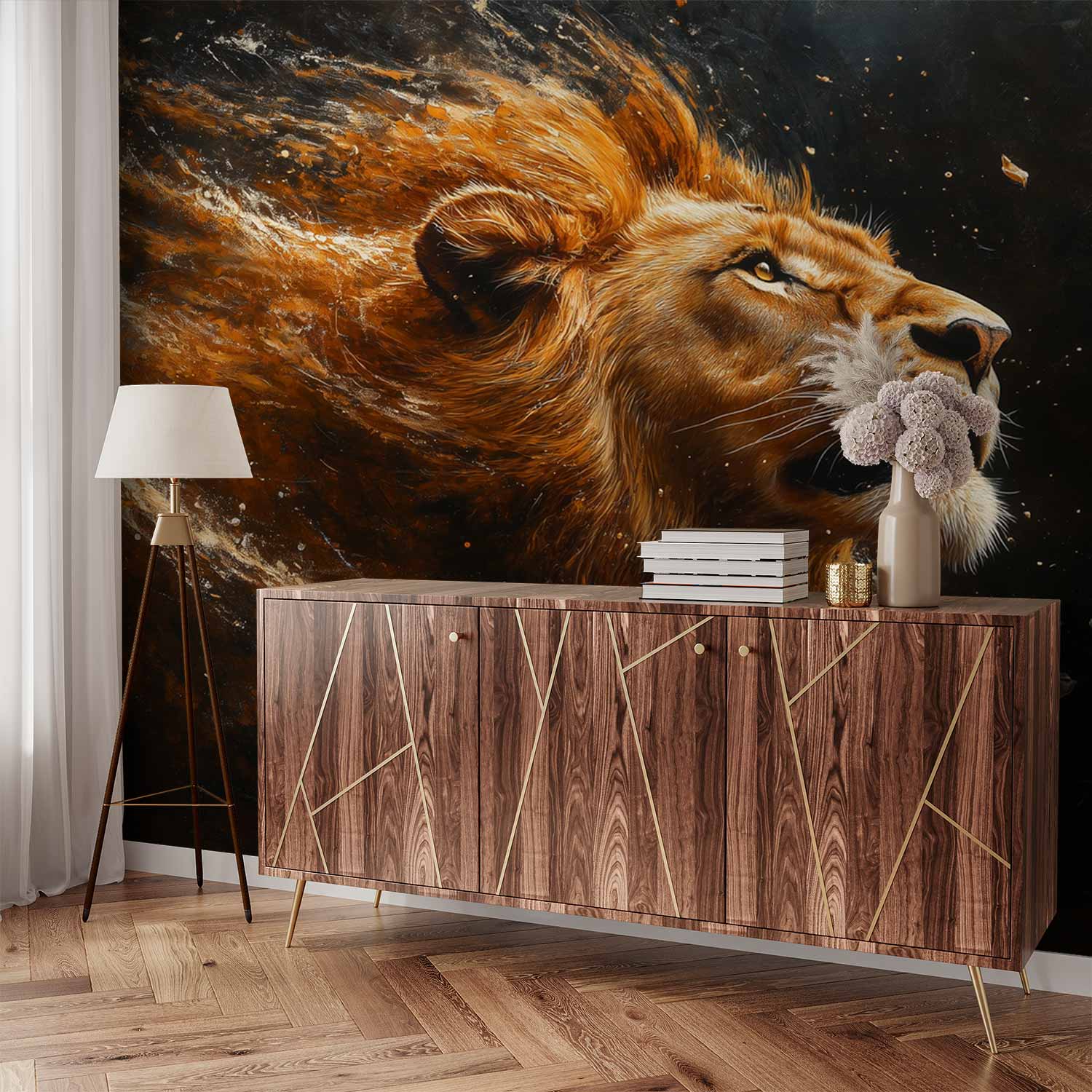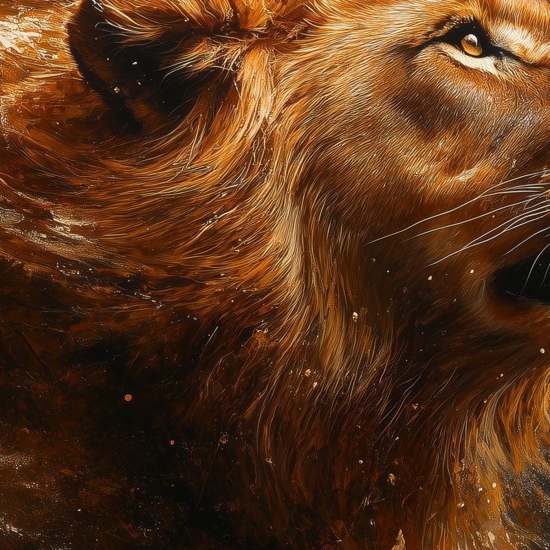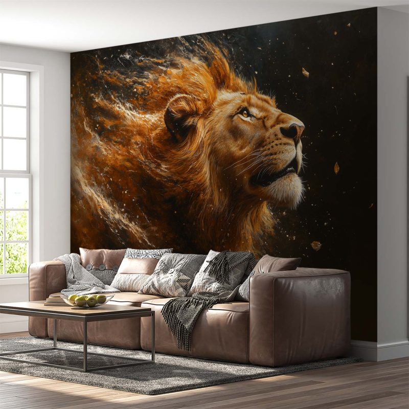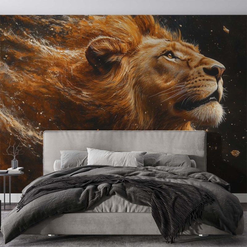 Krachtige oranje en bruine tinten vangen de koning der dieren in volle glorie. Zijn wapperende manen dansen in de wind tegen een donkere achtergrond die zijn majesteitelijke verschijning versterkt. Dit adembenemende behang brengt wildernis en karakter in je ruimte, perfect als statementwand in een moderne woonkamer of studeerruimte waar het direct de aandacht trekt.