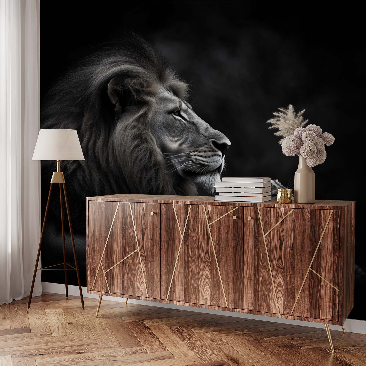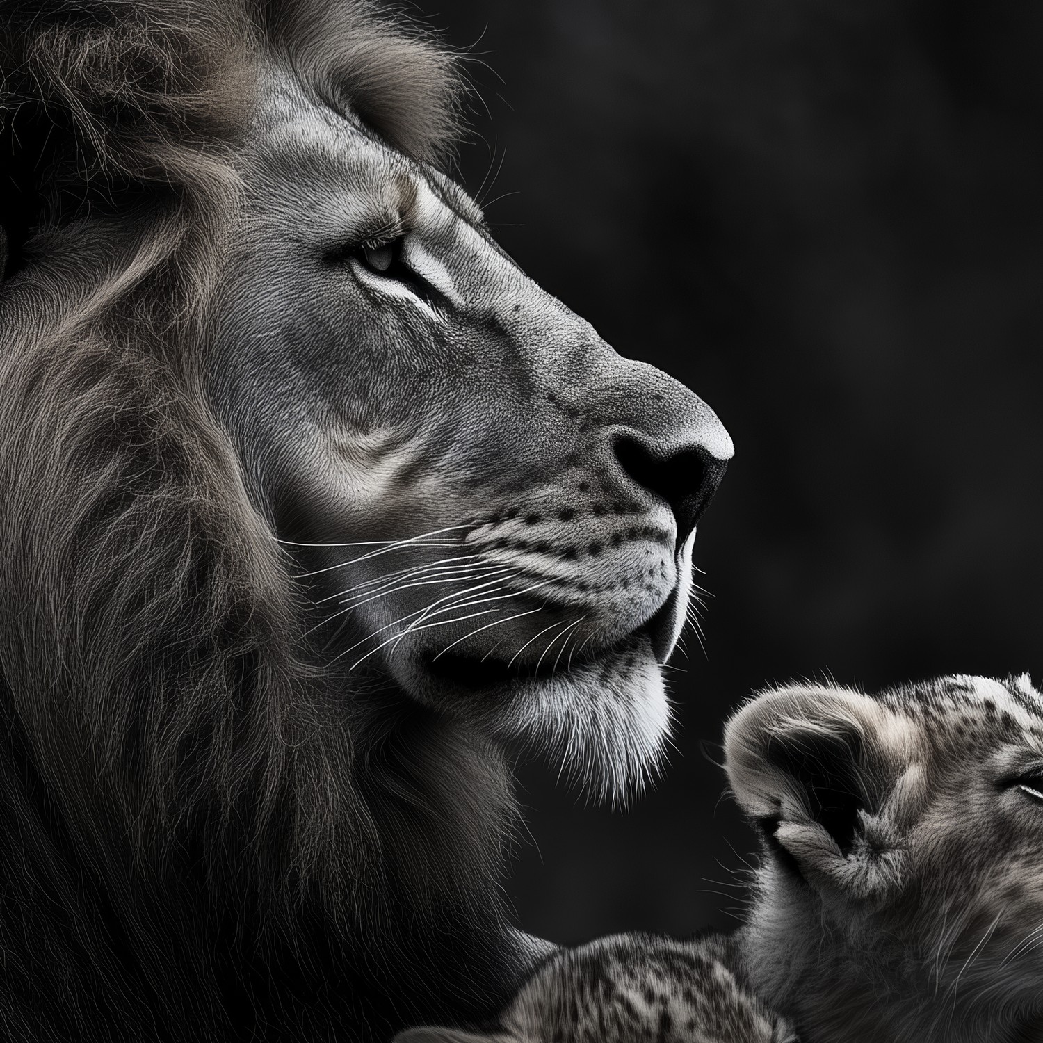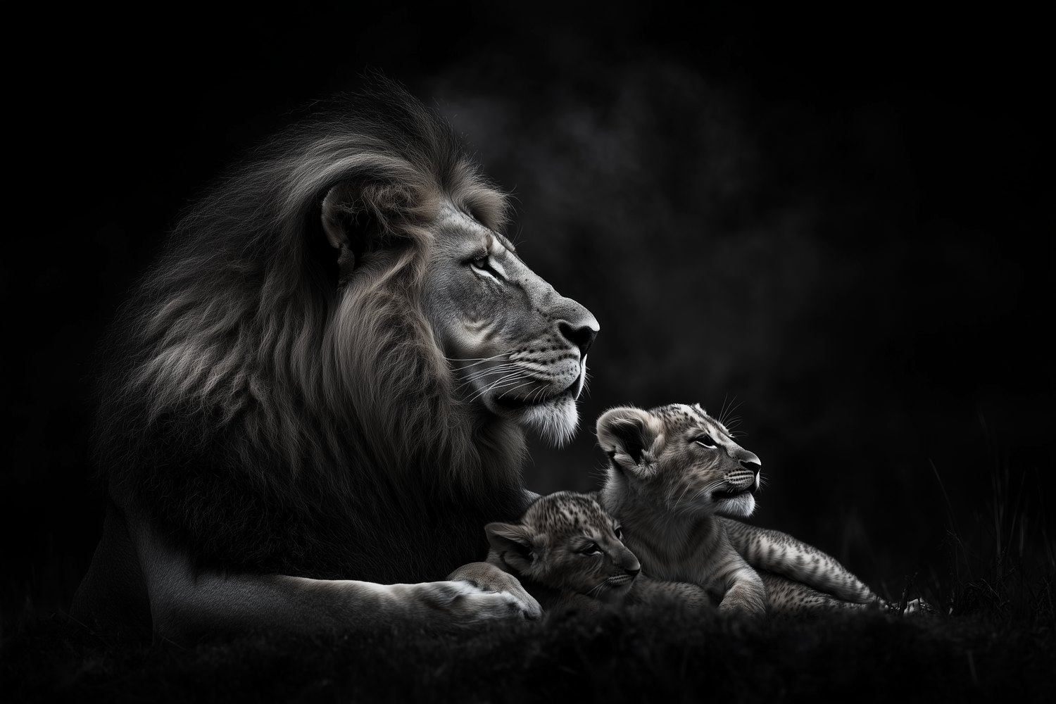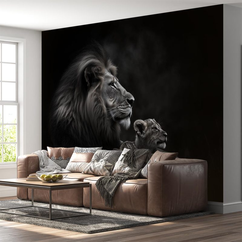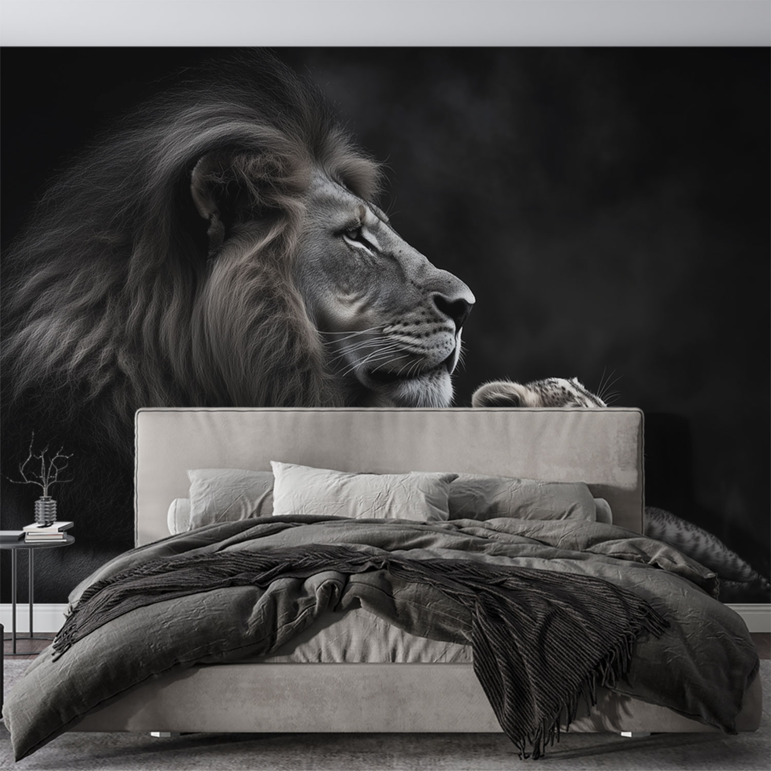 Majestueus zwart-wit behang waar een leeuwin haar welpen beschermt. Haar krachtige blik waakt over de spelende jongen, gevangen in tijdloze contrasten. Dit tafereel brengt rust en wild elegance in je interieur, ideaal voor een accentwand die zowel zachtheid als kracht uitstraalt. De monochrome uitstraling past bij elke stijl en creëert een indrukwekkend focuspunt in je ruimte.
