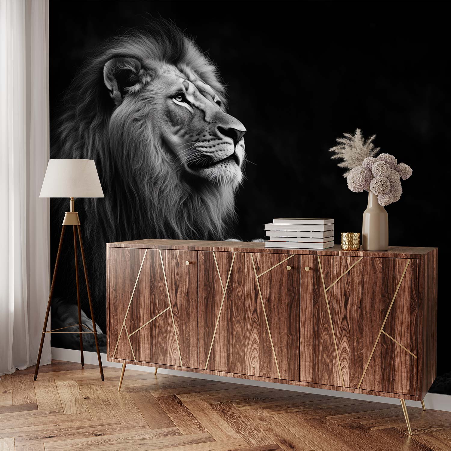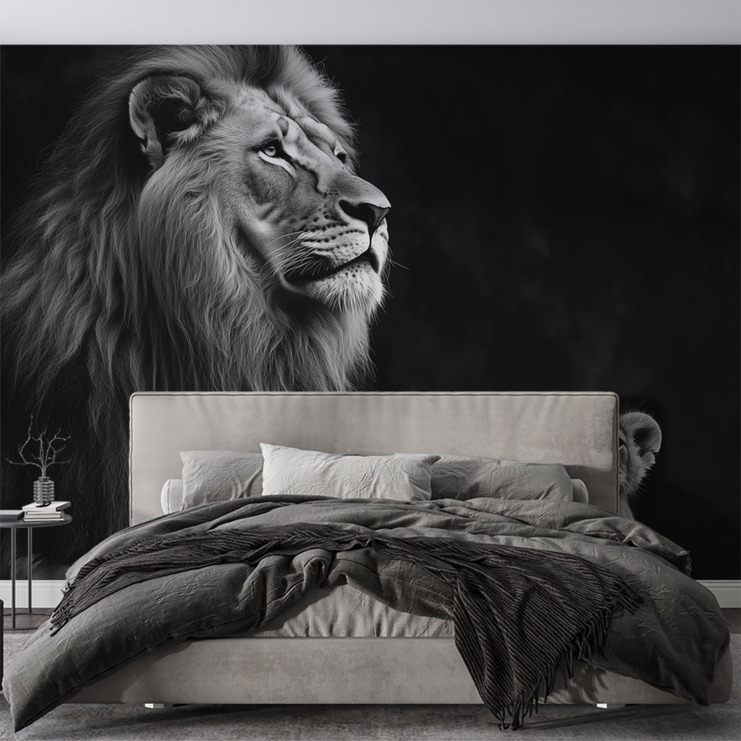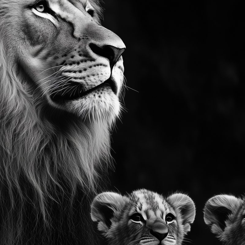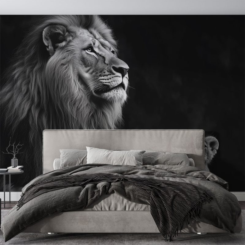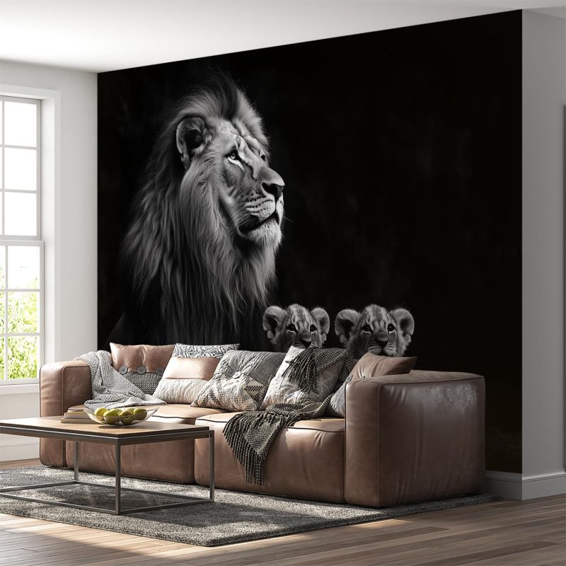Majestueus rust een leeuw op een rots, omringd door zijn welpen. Zwart-wit versterkt de krachtige aanwezigheid en tederheid in dit tijdloze tafereel. De compositie straalt evenwicht uit, terwijl zijn blik de ruimte in trekt. Dit behang brengt wildernis en rust in je interieur, een statement van natuurlijke elegantie en familiebanden.