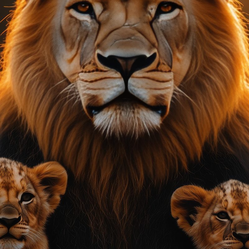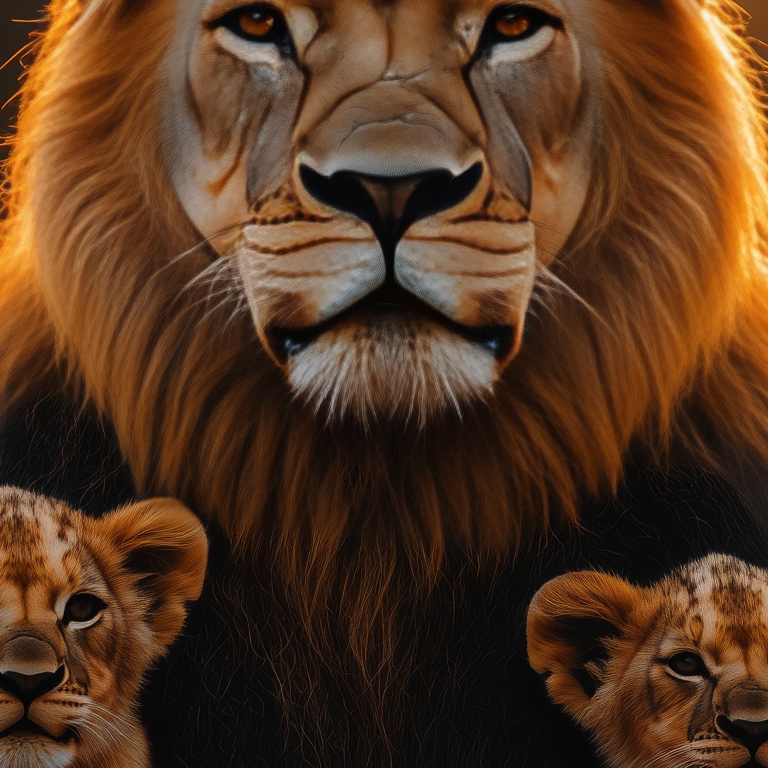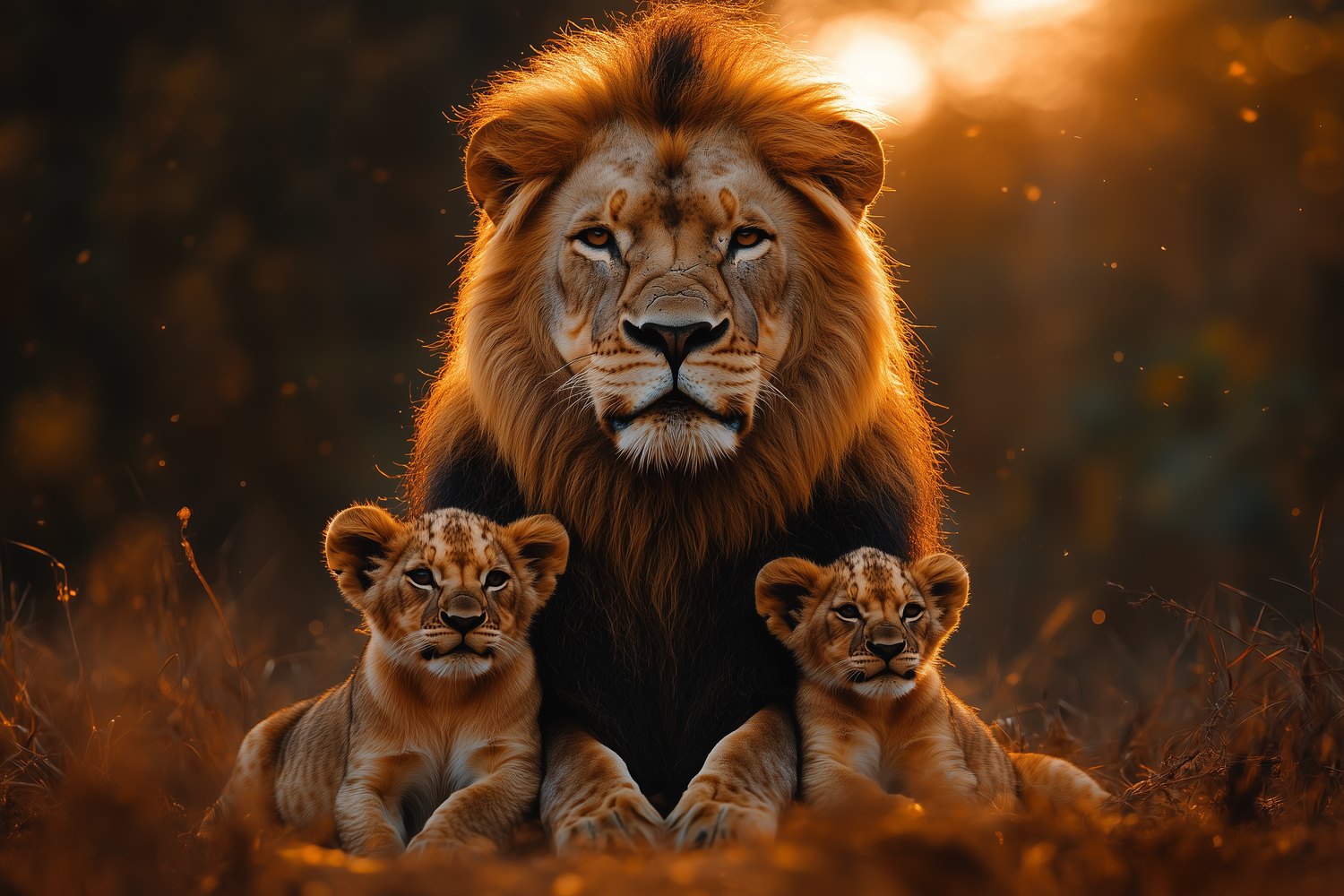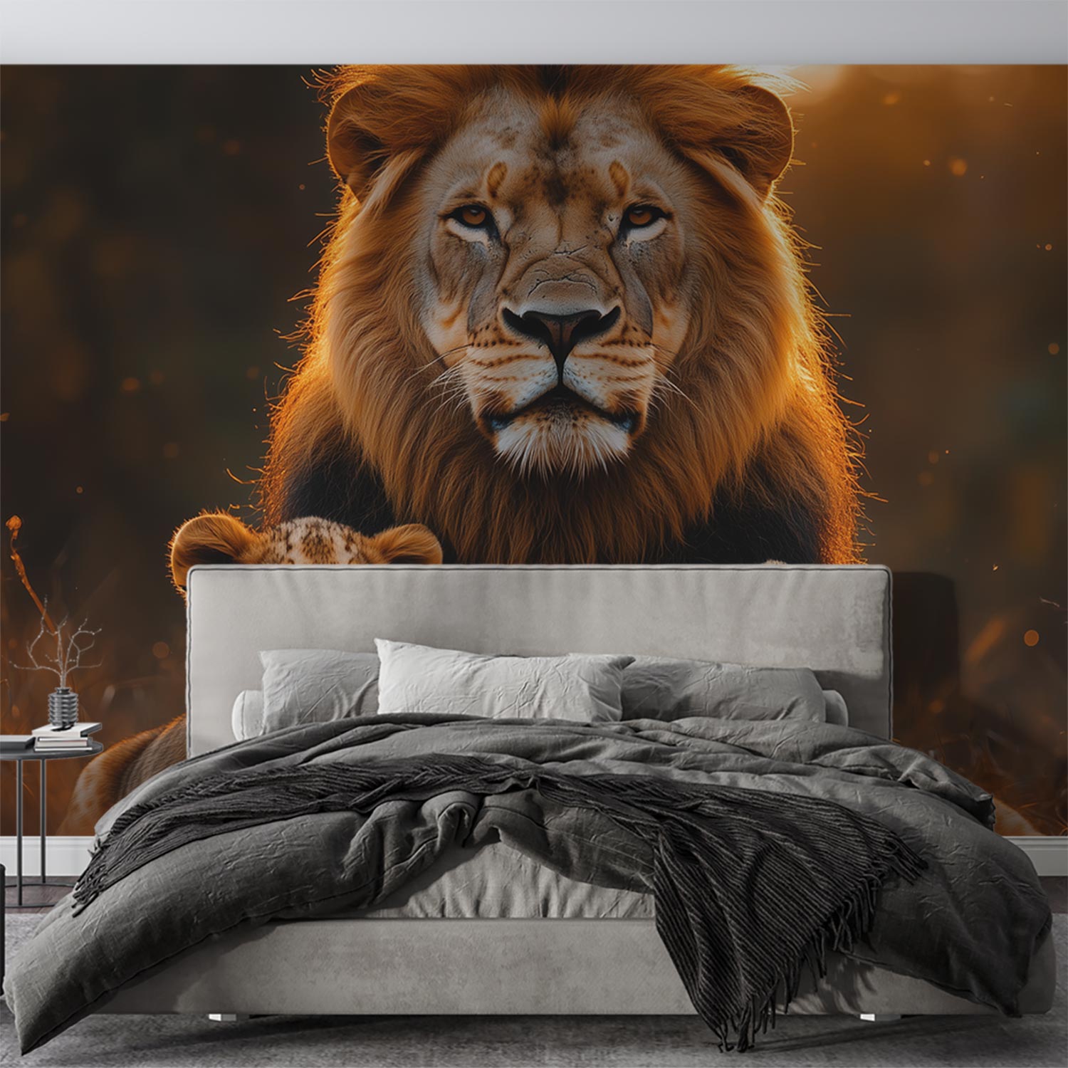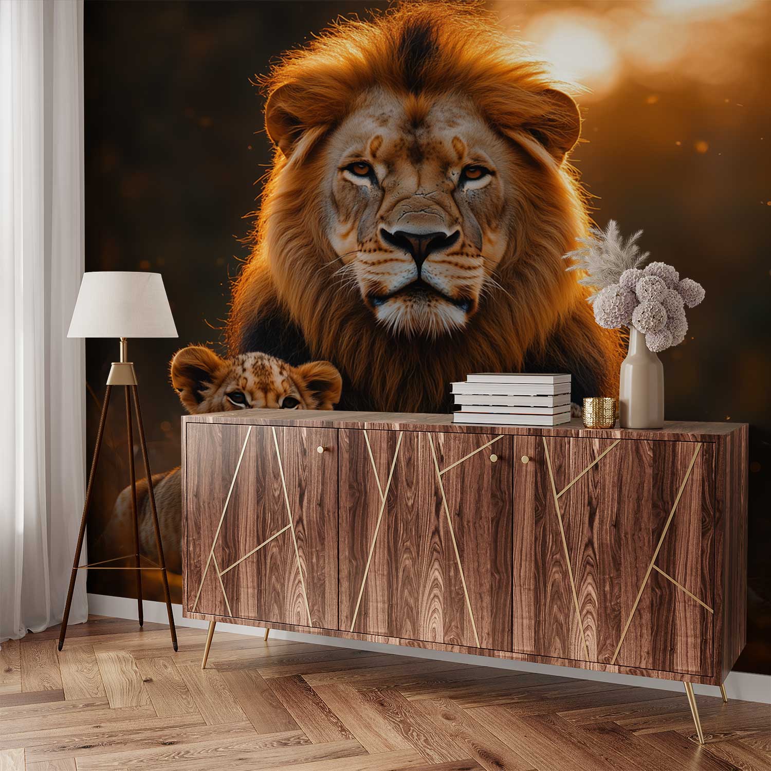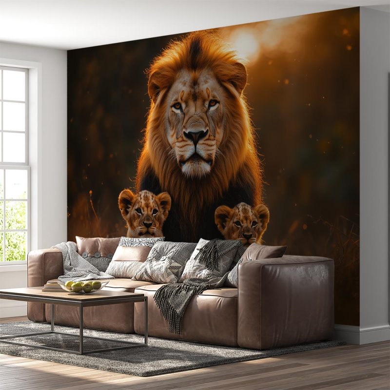 Gouden zonnestralen omarmen een trotse leeuw en zijn welpen in een tafereel vol warmte en verbondenheid. Dit behang brengt de rustige kracht van de savanne in huis, waar de zachte kleuren en natuurlijke harmonie een kalmerende, beschermende sfeer creëren in elke ruimte. Perfect voor wie verlangt naar een vleugje wildernis en tijdloze schoonheid aan de muur.