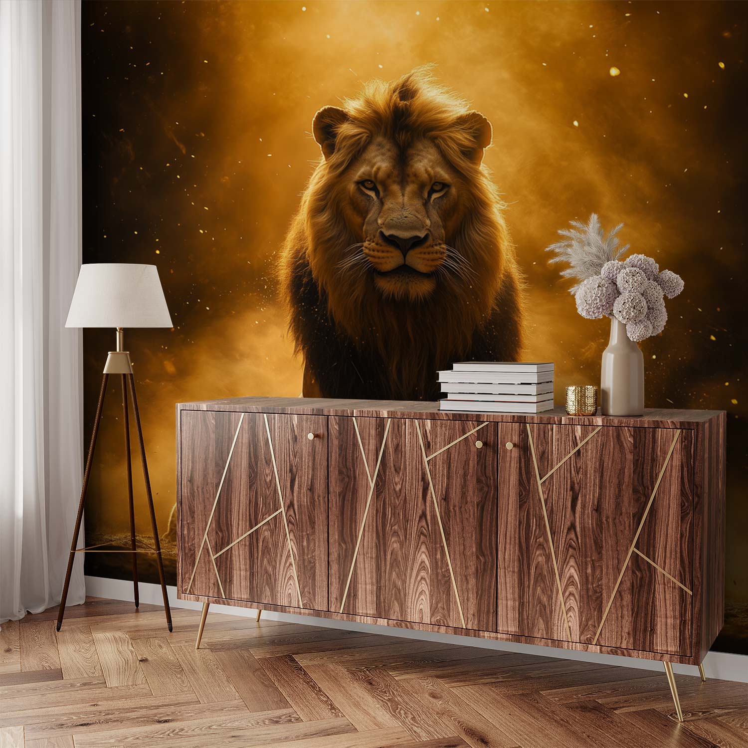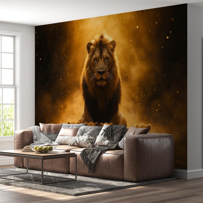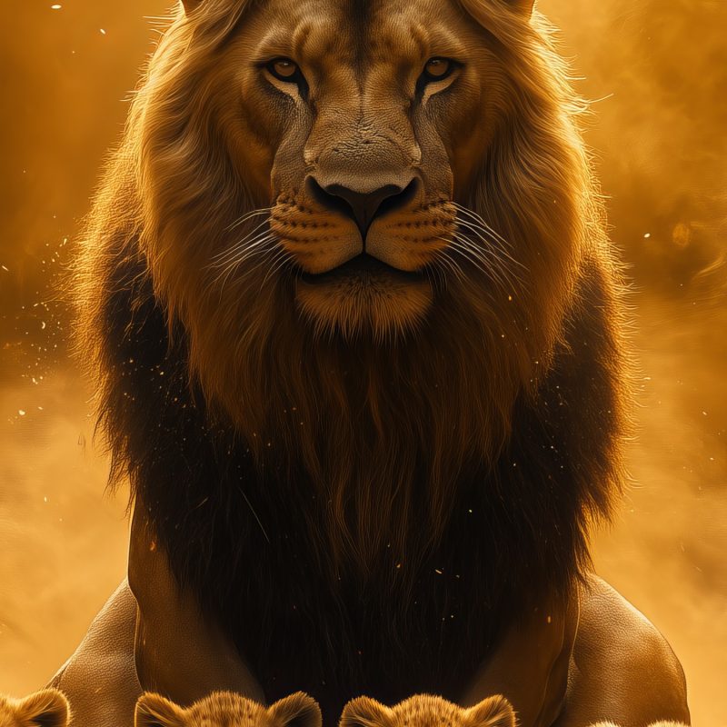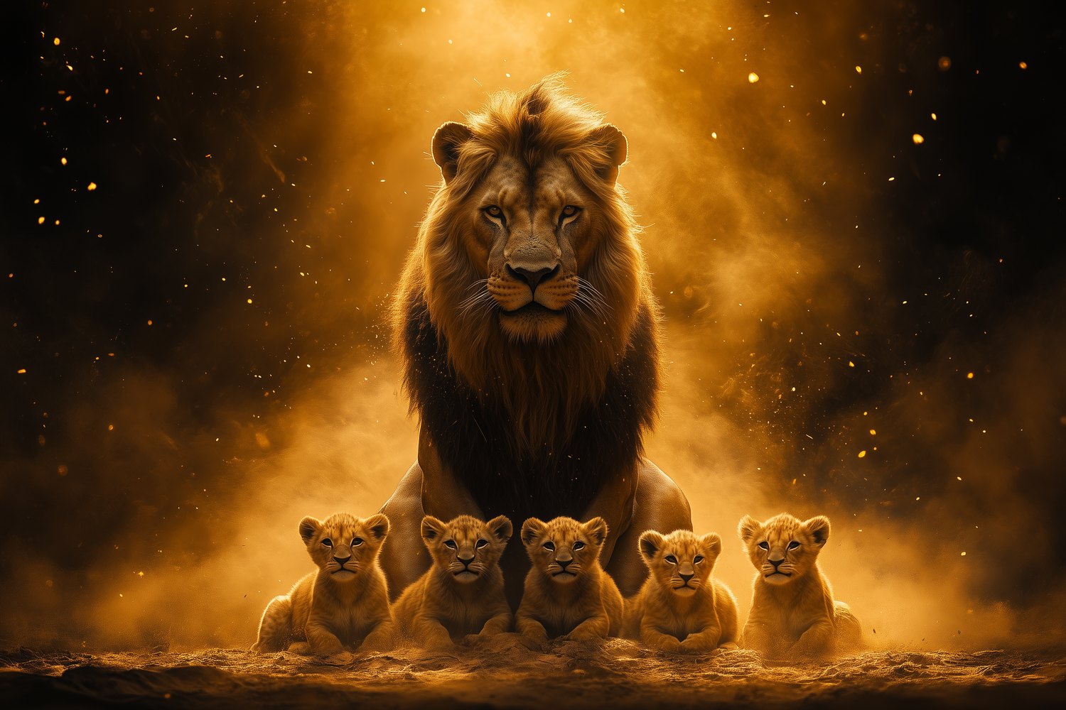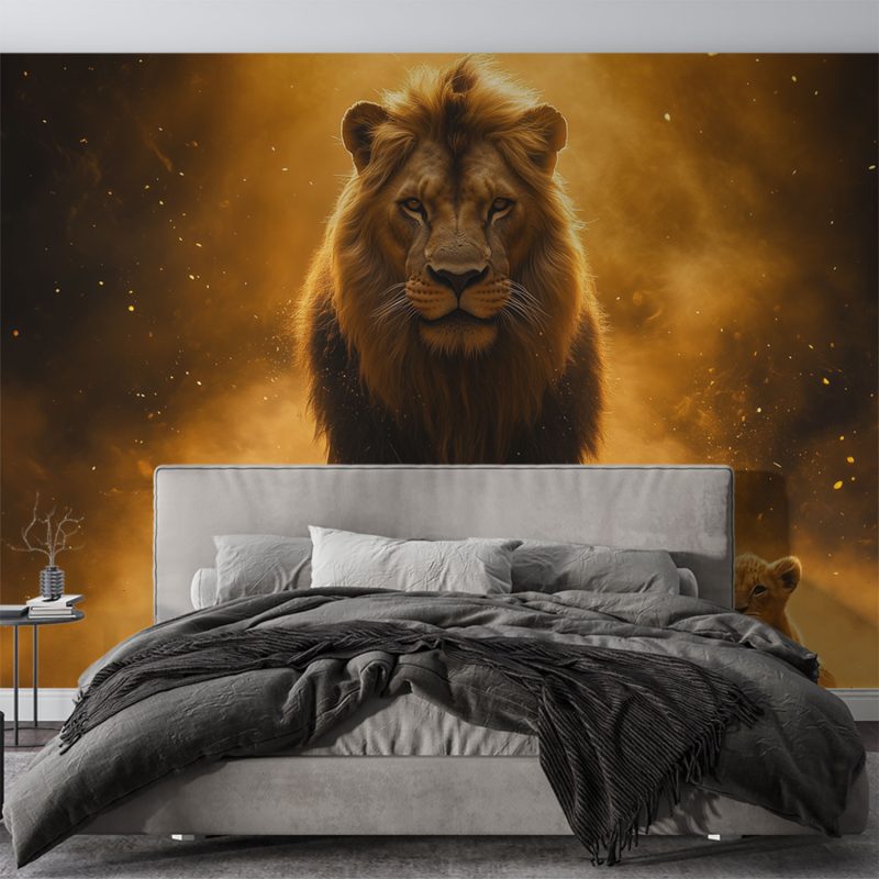 Gouden rook wervelt om een trotse leeuw met zijn welpen. Zijn indrukwekkende manen gloeien warm oranje terwijl de kleintjes dicht tegen hem aan schuilen. Dit krachtige familieportret straalt moed en verbondenheid uit. Breng wildernis en warmte in je interieur met dit mystieke tafereel dat elke ruimte tot een beschermende, stoere thuishaven maakt.