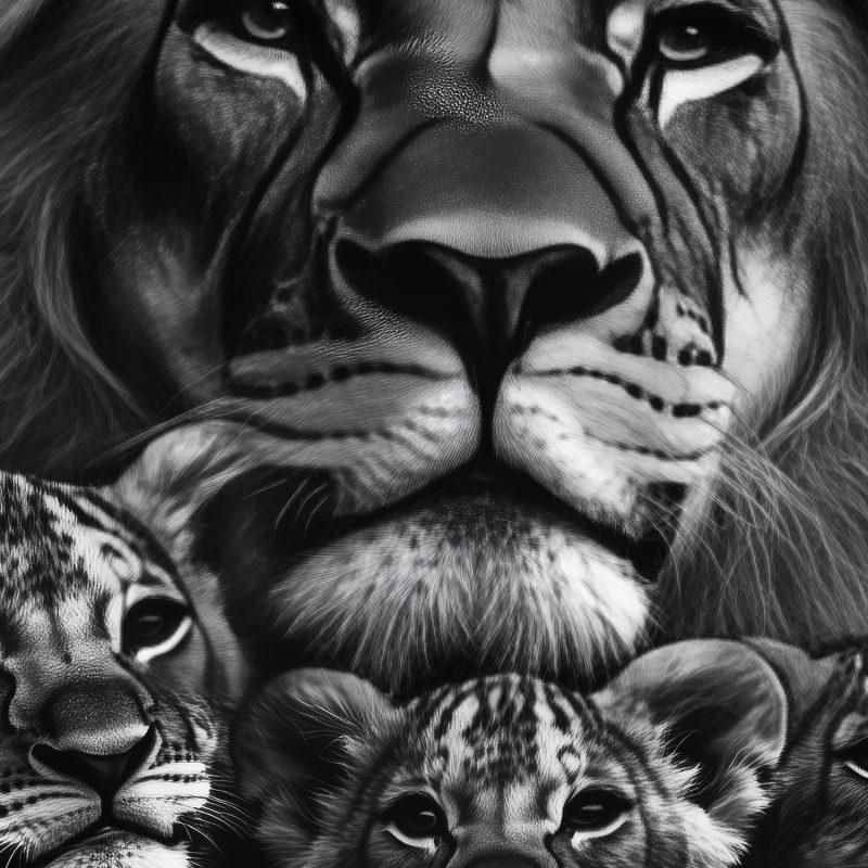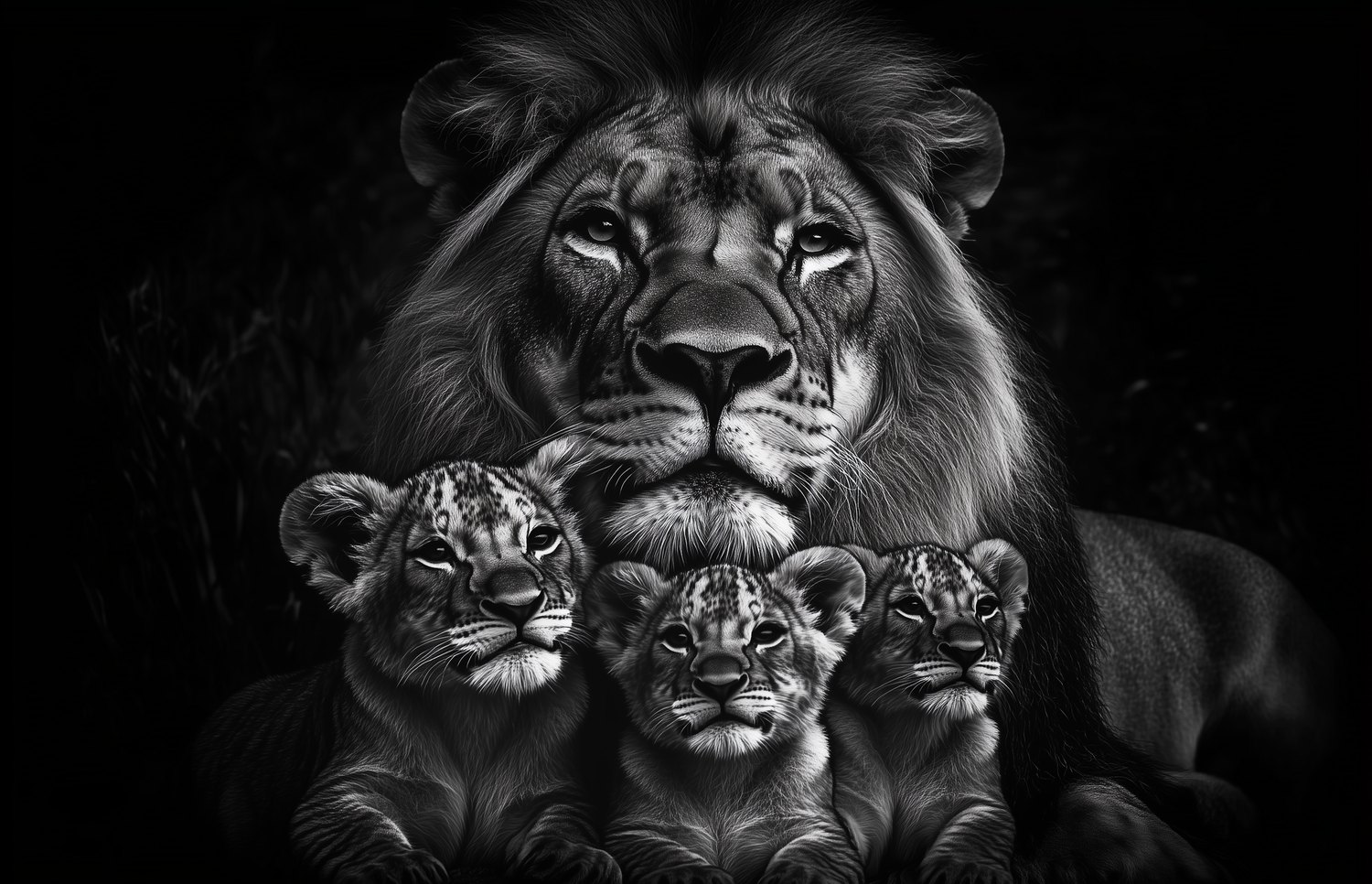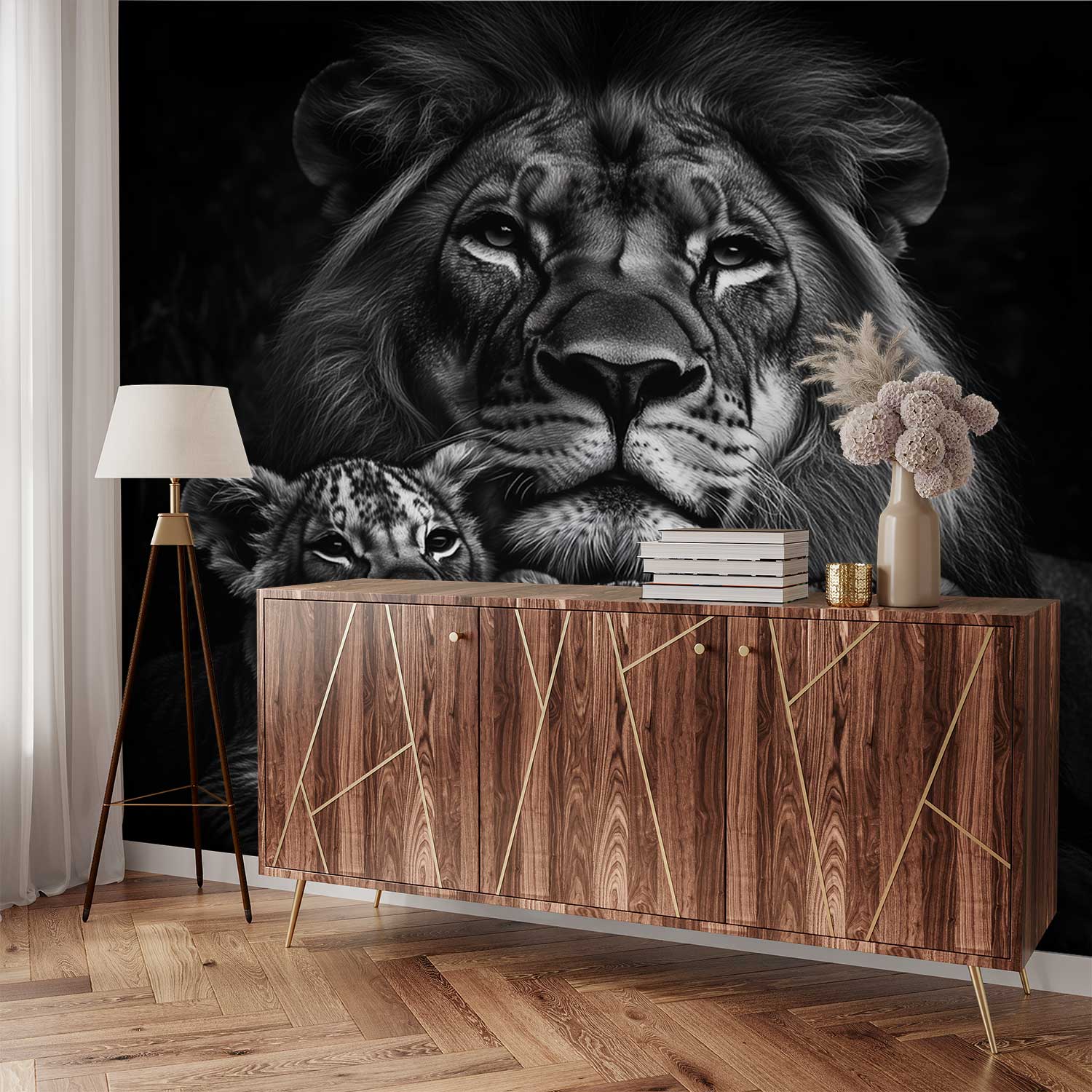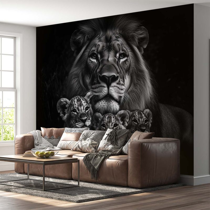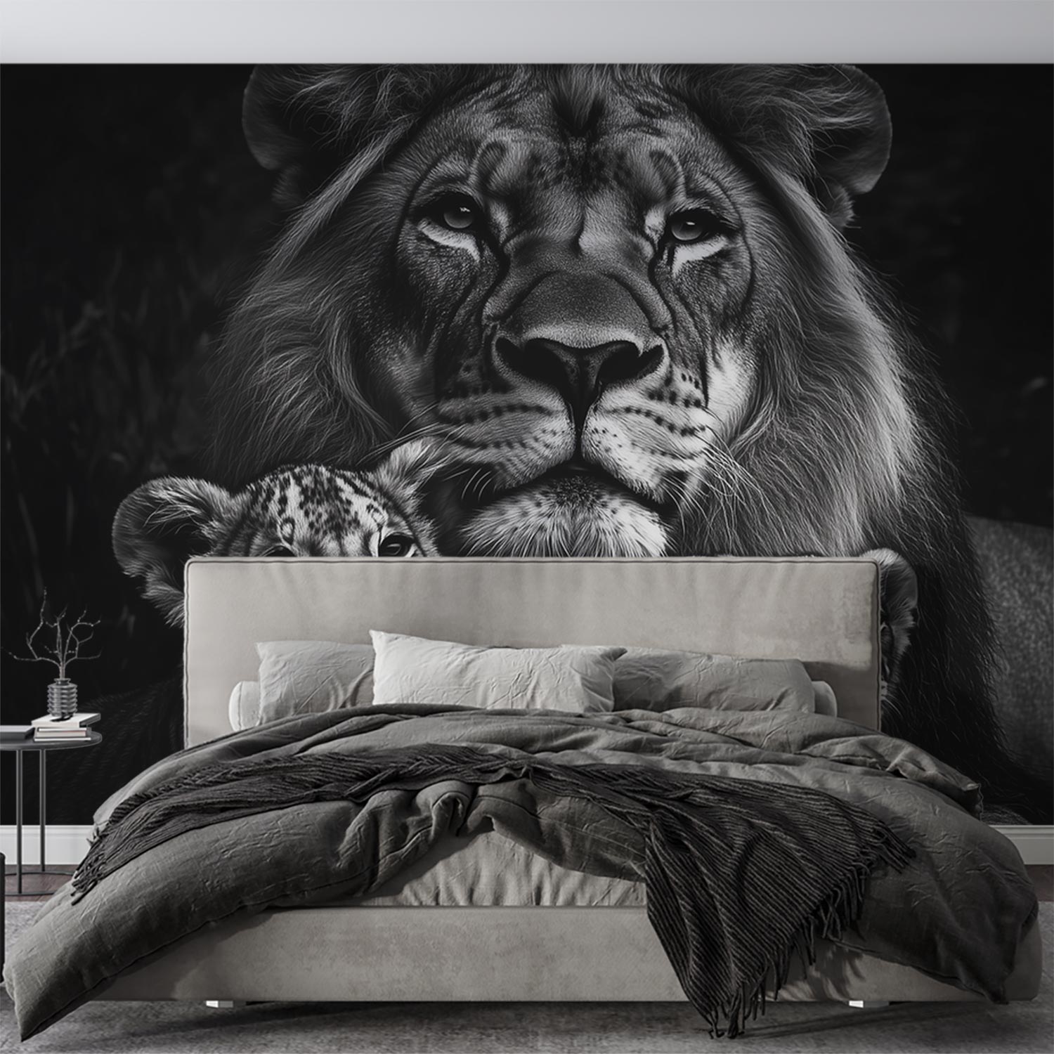 Majestueus zwart-wit behang waar een leeuw trots zijn welpen omarmt. Zijn krachtige blik domineert, terwijl de speelse jongen tederheid toevoegen. Dit tijdloze tafereel brengt wildernis en rust in je interieur. De dramatische contrasten werken als een kunstwerk, perfect voor een statement muur die zowel kracht als gevoel uitstraalt.