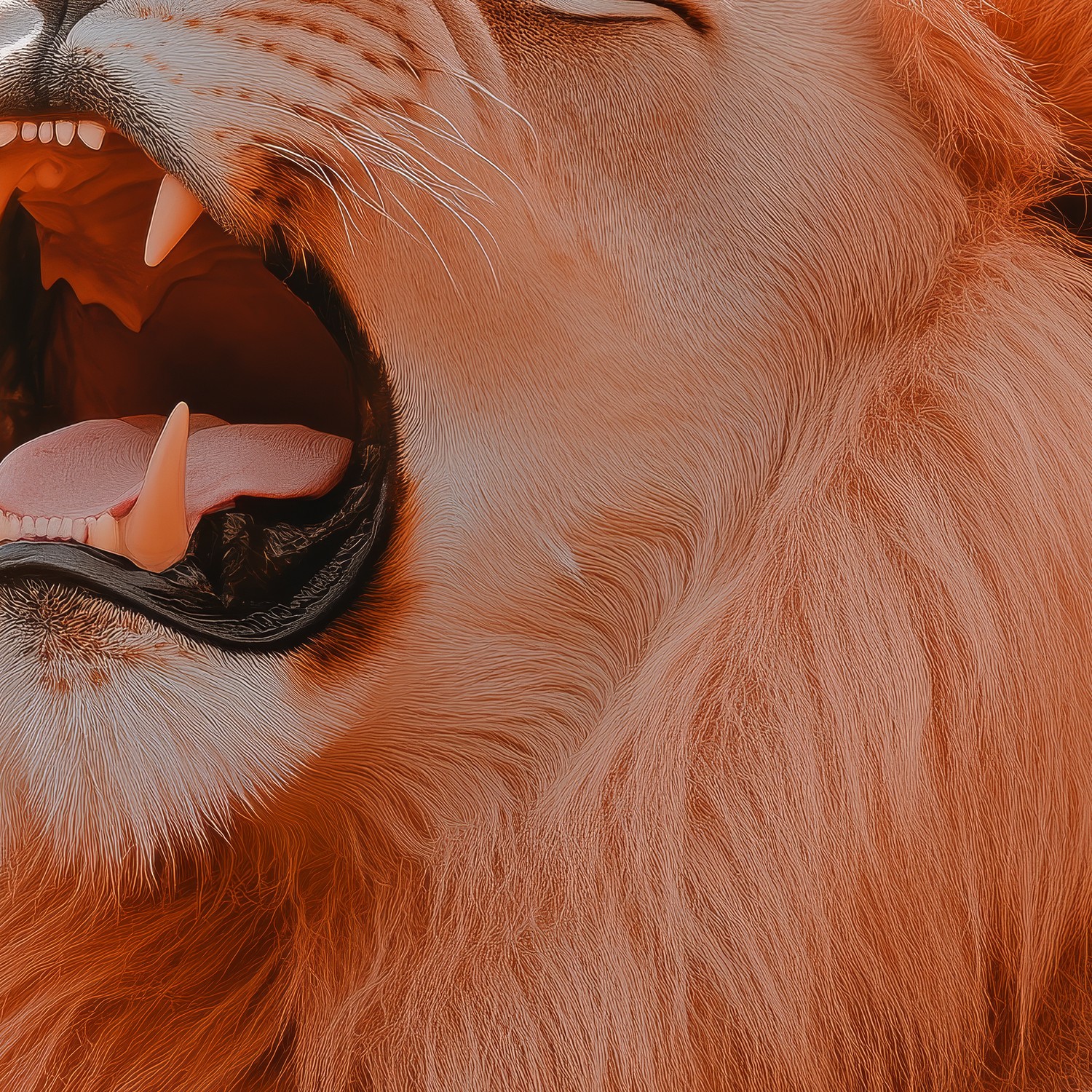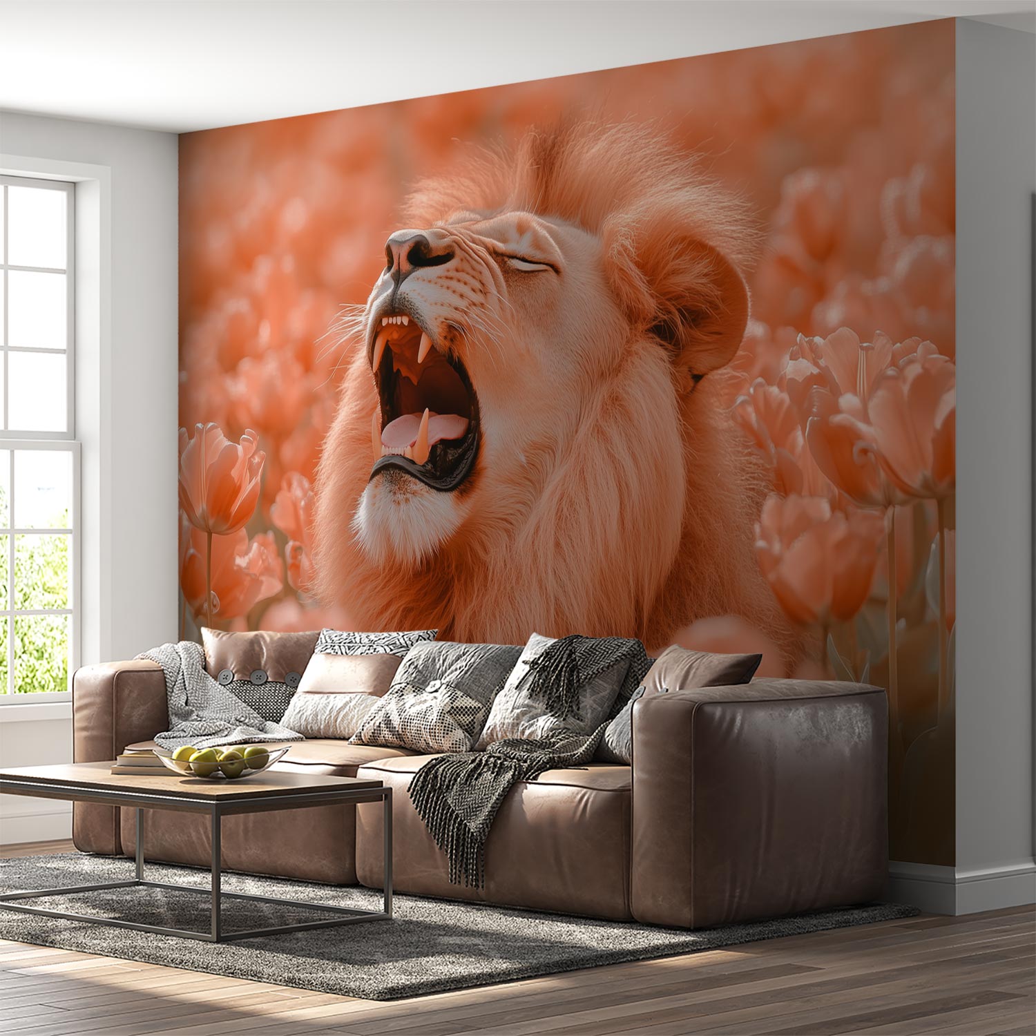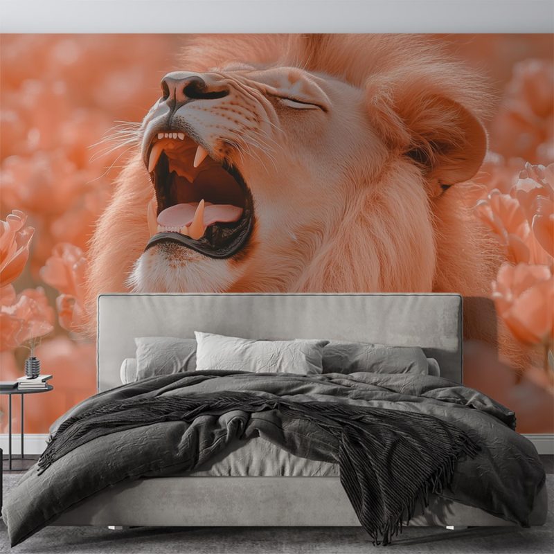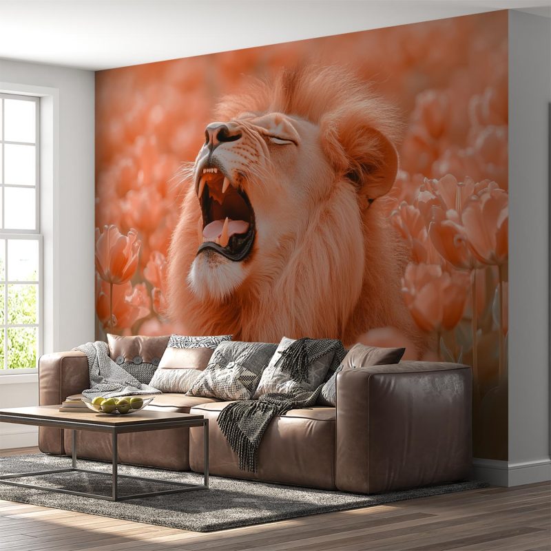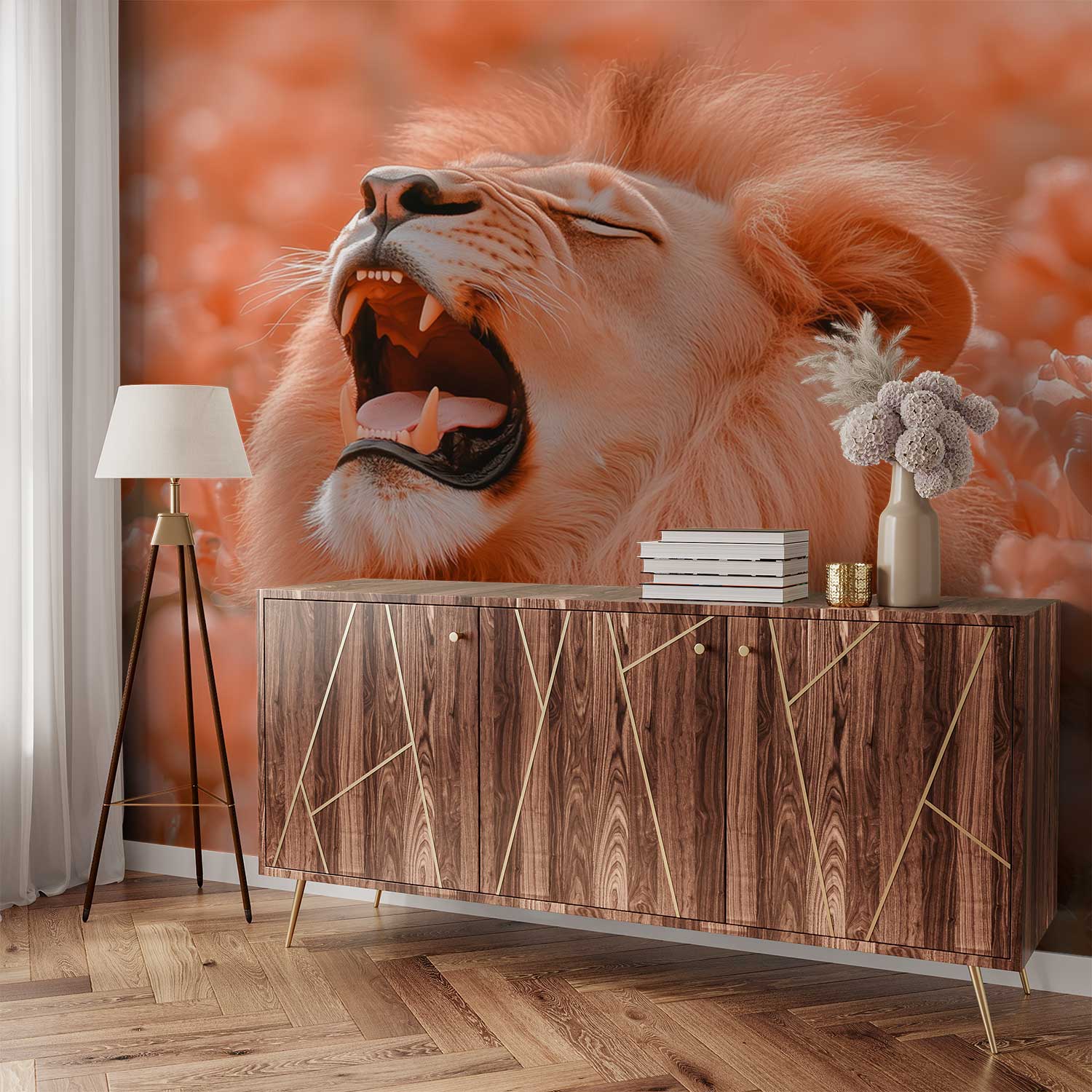 Ontwaakt in een zee van oranje bloesems, de leeuw ademt rust. Zijn gesloten ogen en zachte vacht stralen sereniteit uit. Levendige tinten dansen harmonieus samen, creëren een focal point vol warmte en balans. Perfect voor een accentmuur waar natuur en kalmte samenkomen, dit behang brengt een gevoel van vredige verwondering in elke ruimte.