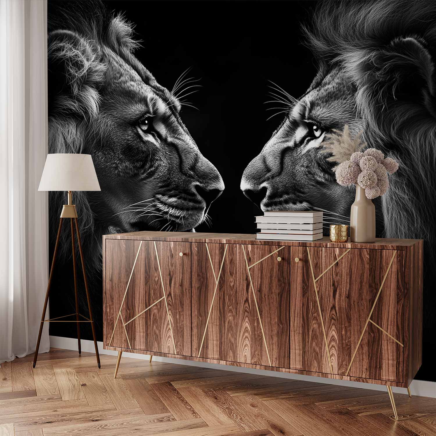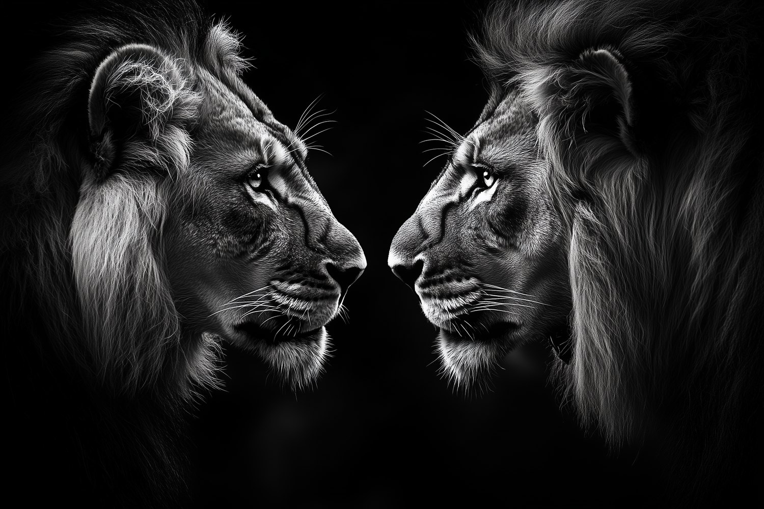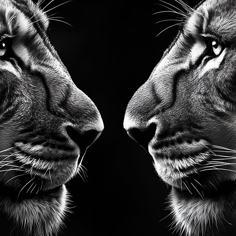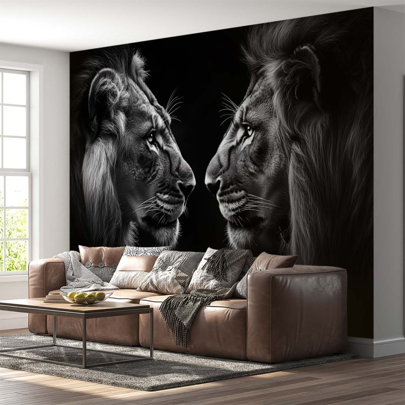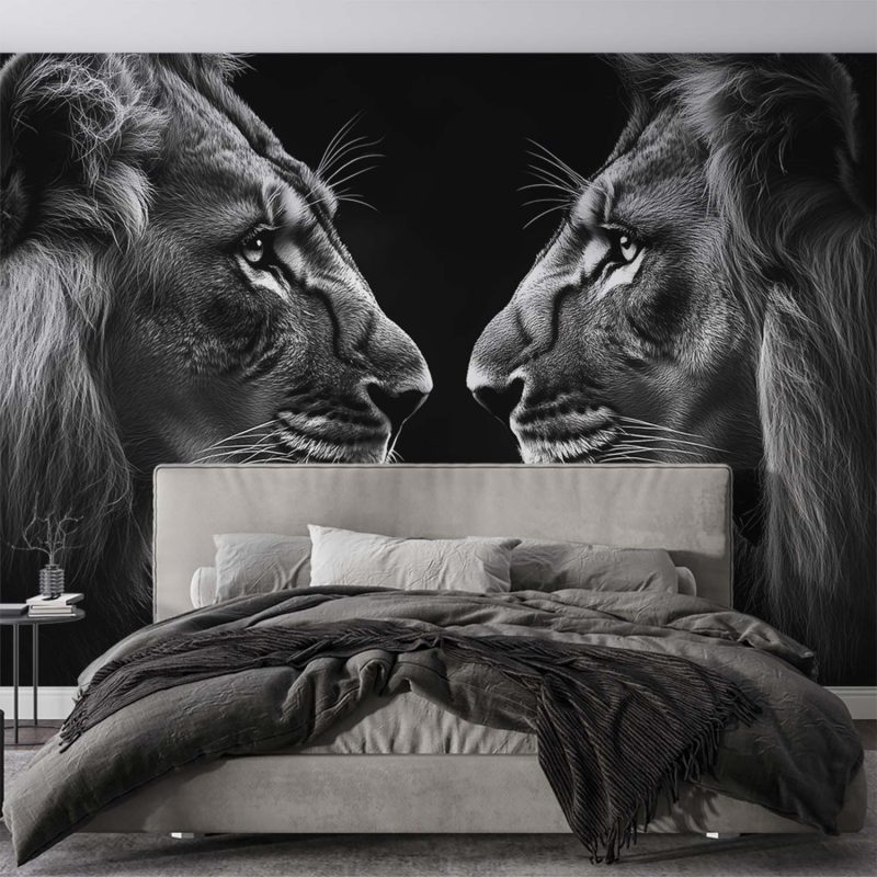 Oog in oog zweven twee machtige leeuwen in een tijdloos zwart-wit portret. Hun blikken verstrengeld, manen vol diepte en textuur. Dit behang brengt pure wildernis en harmonie in je interieur, een statement van kracht en schoonheid dat elke ruimte transformeert tot een plek van ontzag en bewondering.