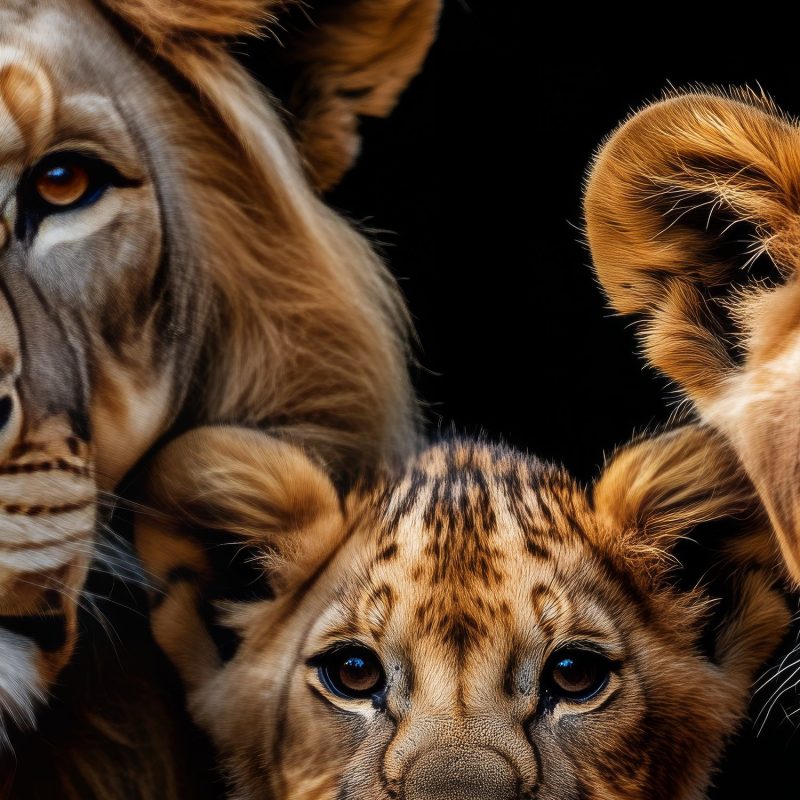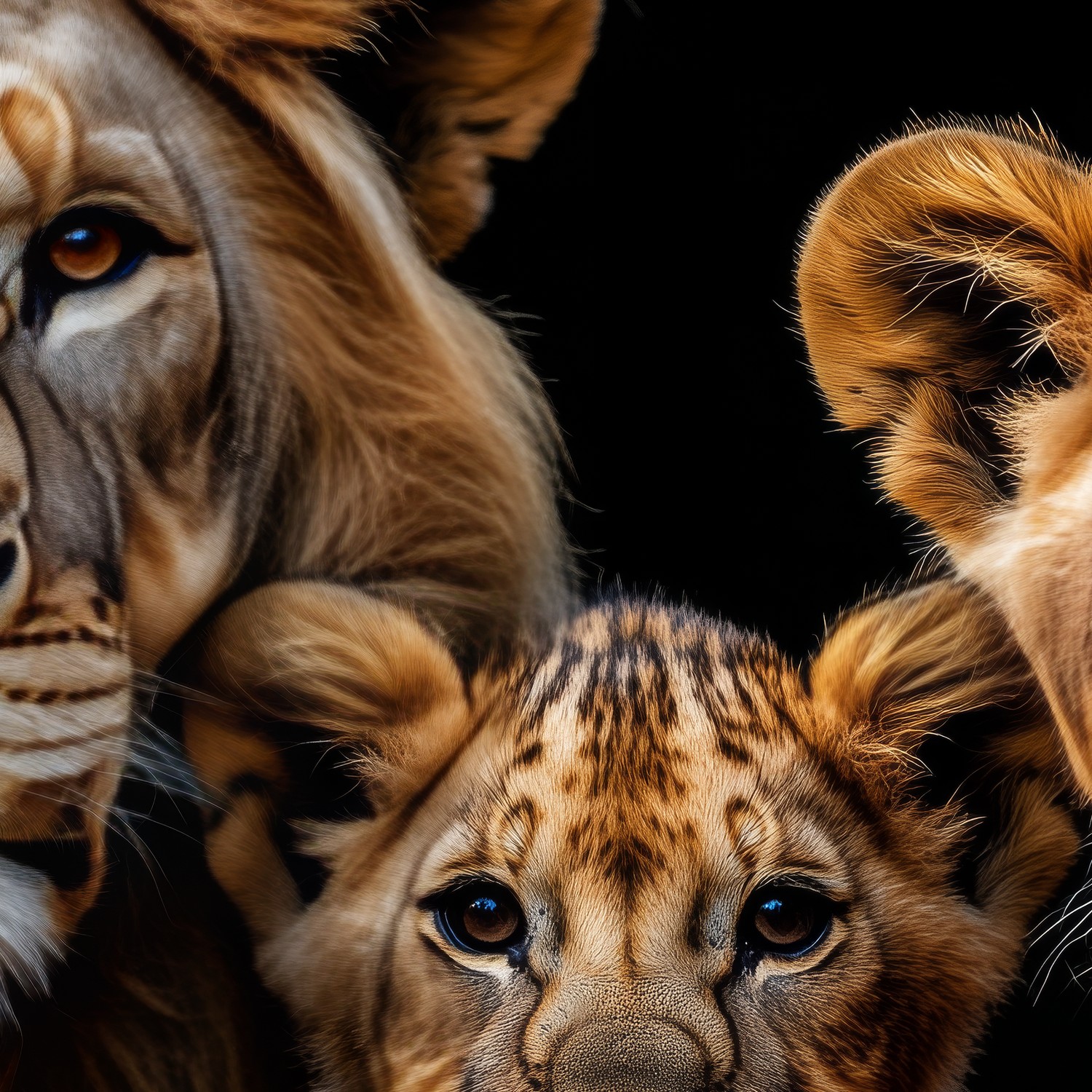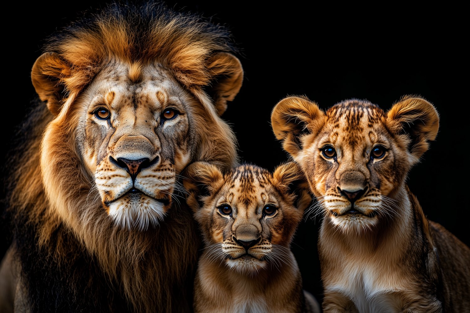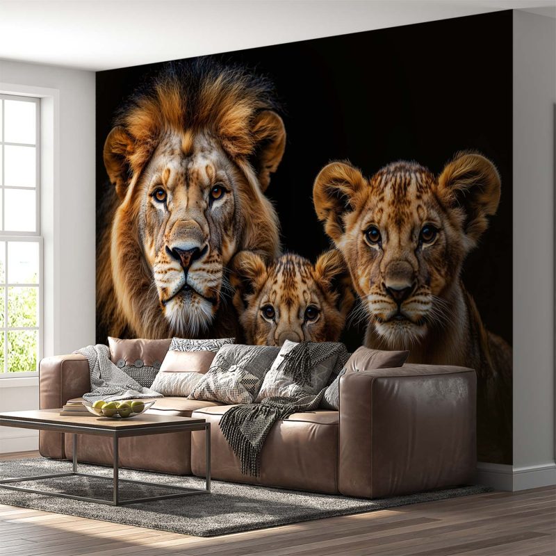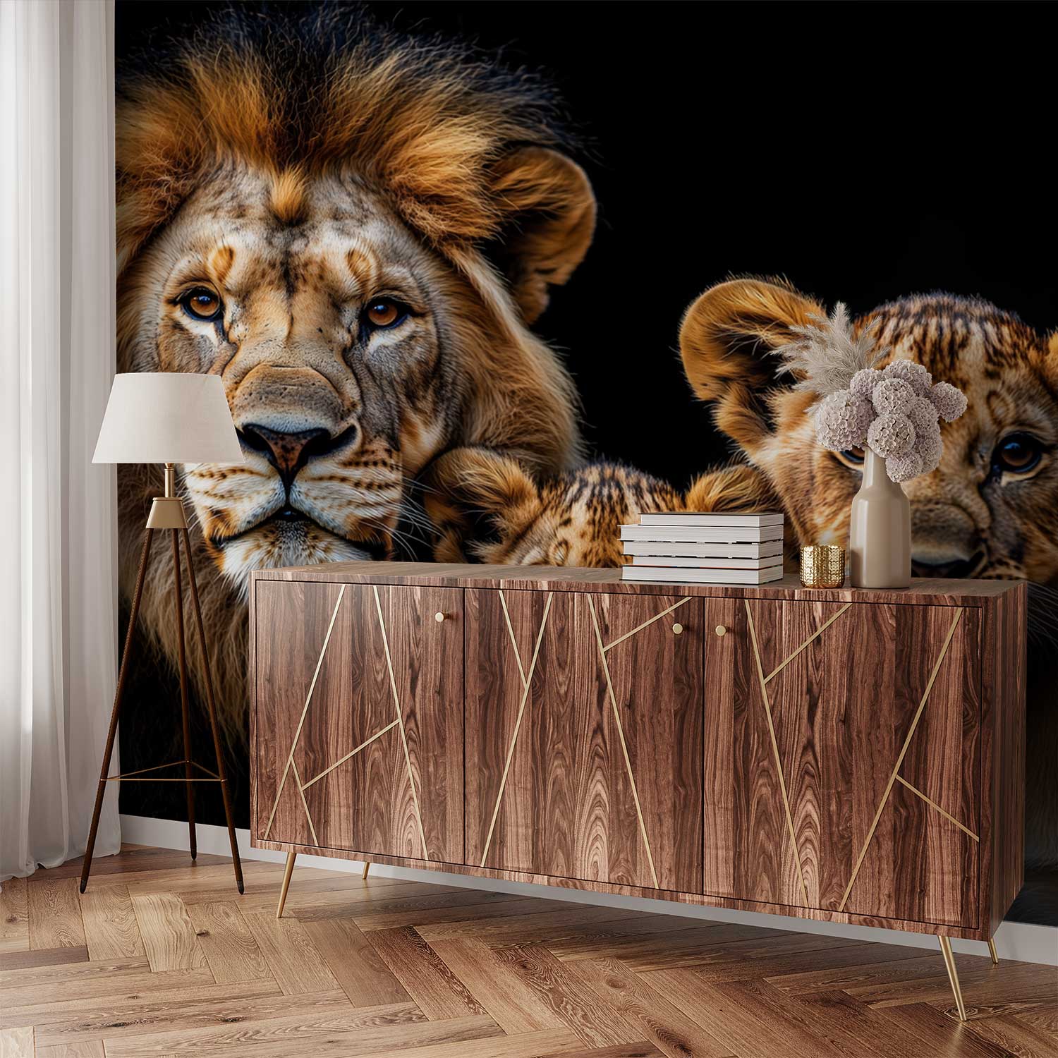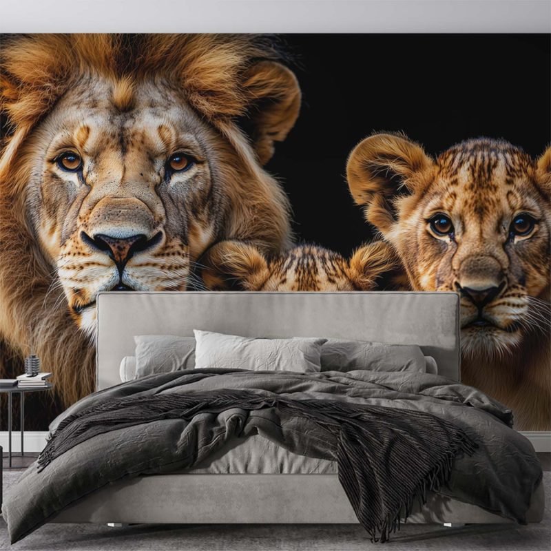 Majestueus bruin en zwart domineren dit krachtige familietafereel. Drie leeuwen kijken je indringend aan, hun eenheid voelbaar tegen de donkere achtergrond. Links troont de imposante vader, rechts flankeren twee jongeren. Hun blik straalt bescherming en verbondenheid uit. Dit behang brengt wildernis en warmte in je interieur, ideaal voor een statementmuur vol karakter en natuurlijke elegantie.