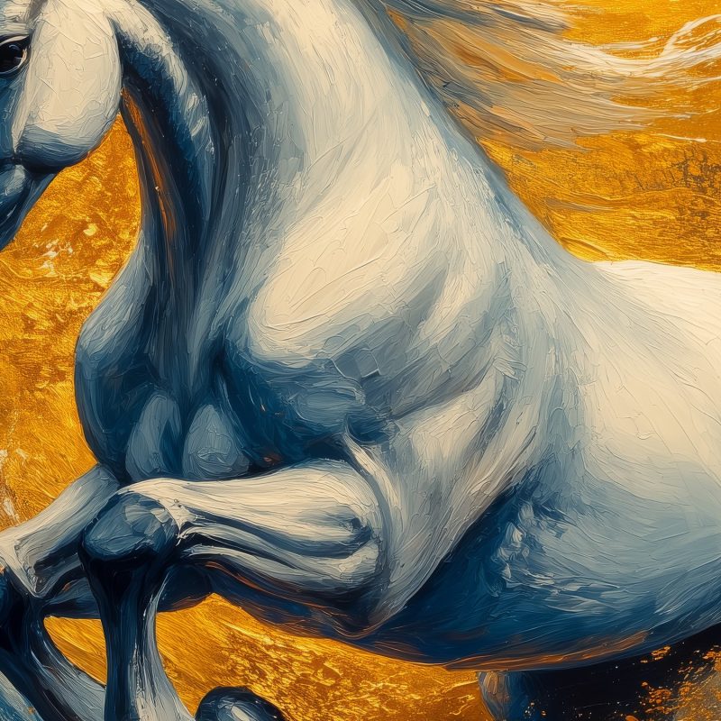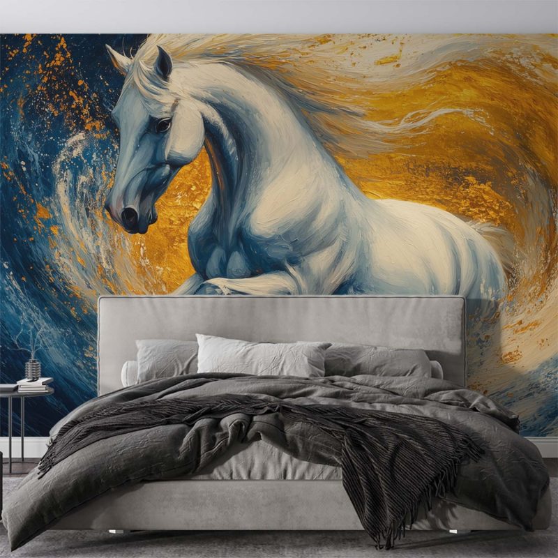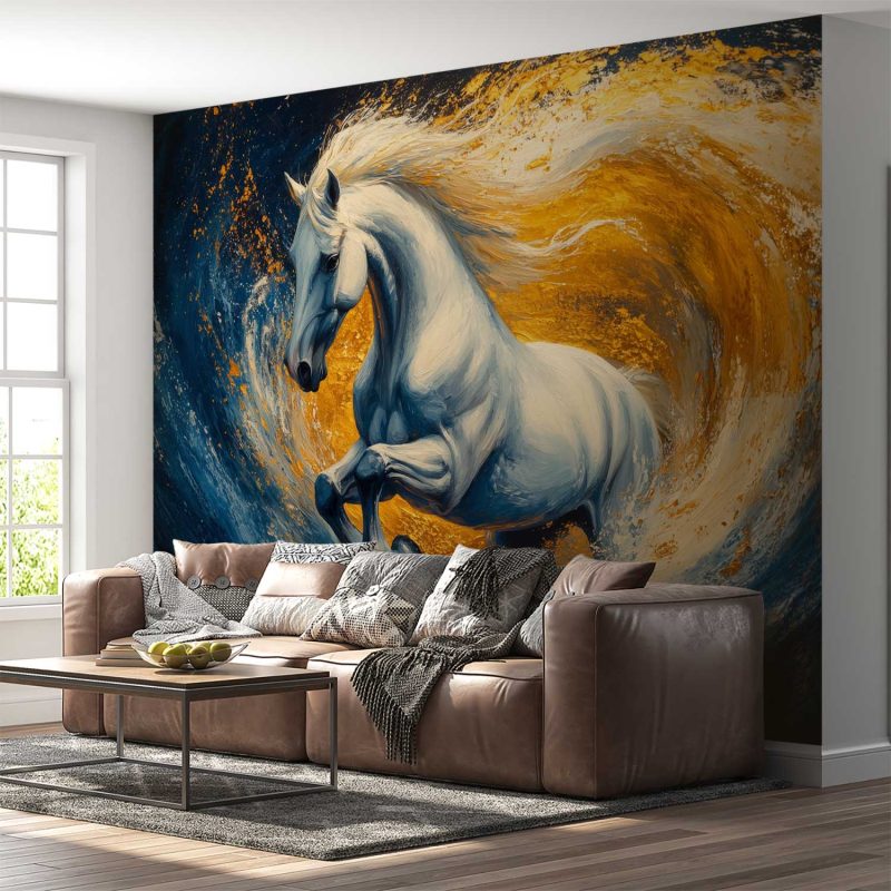 Vlammend oranje en diepblauw wervelen rond de majestueuze witte hengst in volle galop. Zijn manen wapperen wild terwijl hij door de krachtige oceaan breekt. Dit kunstwerk ademt vrijheid en energie, en brengt een gevoel van epische beweging in elke ruimte. Perfect voor wie verlangt naar een statement vol passie en moderne schoonheid.