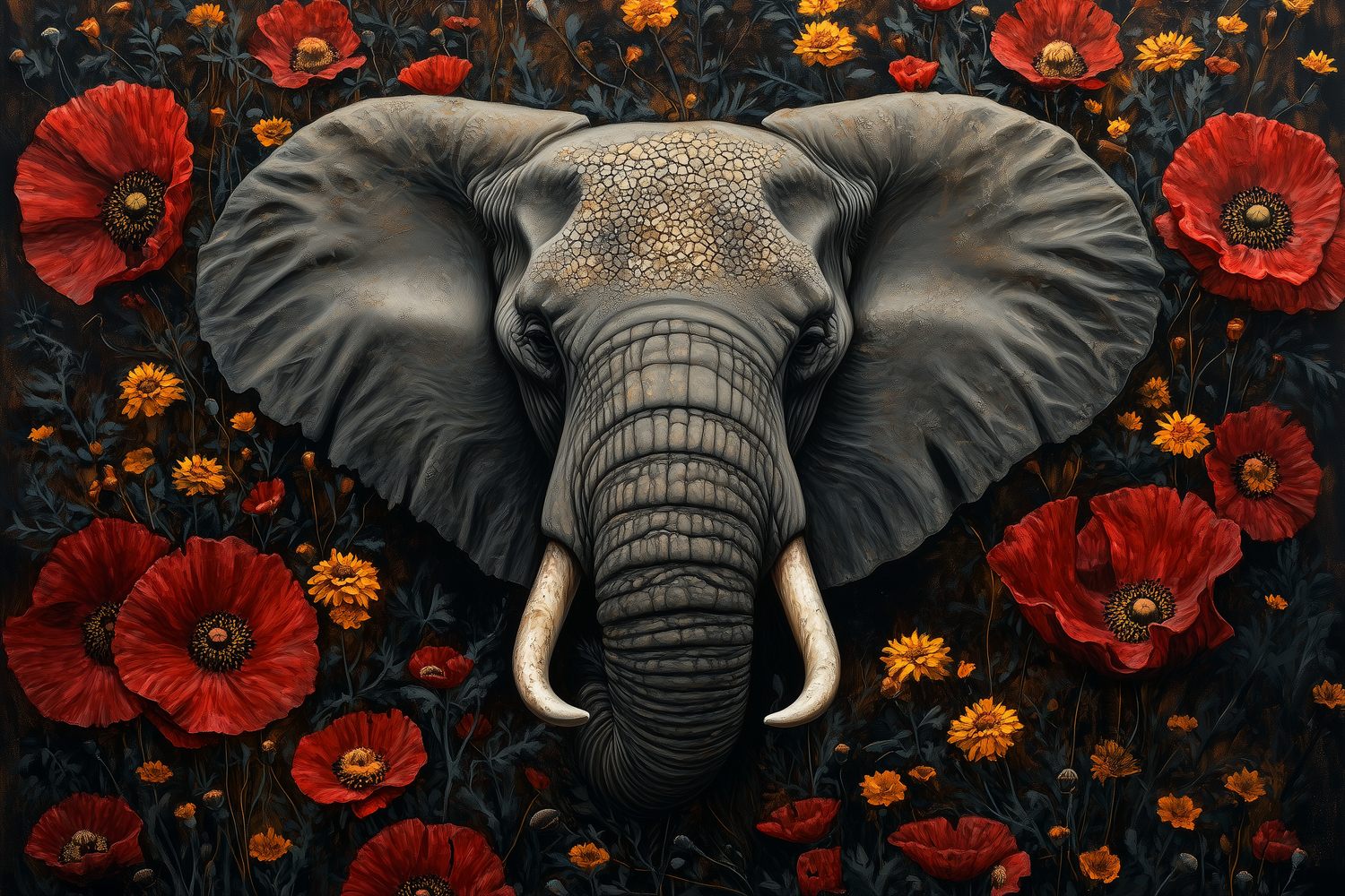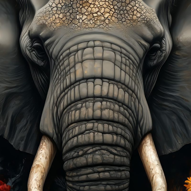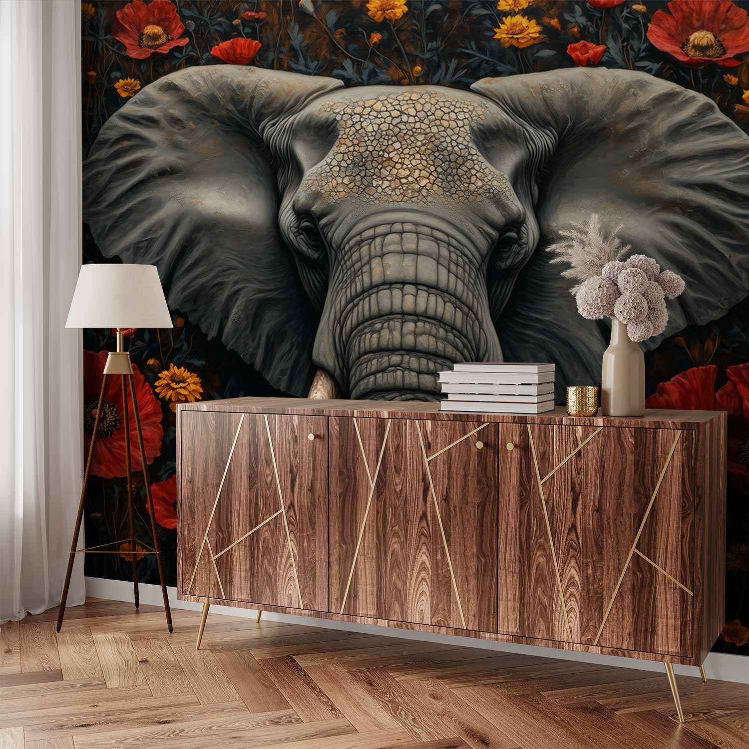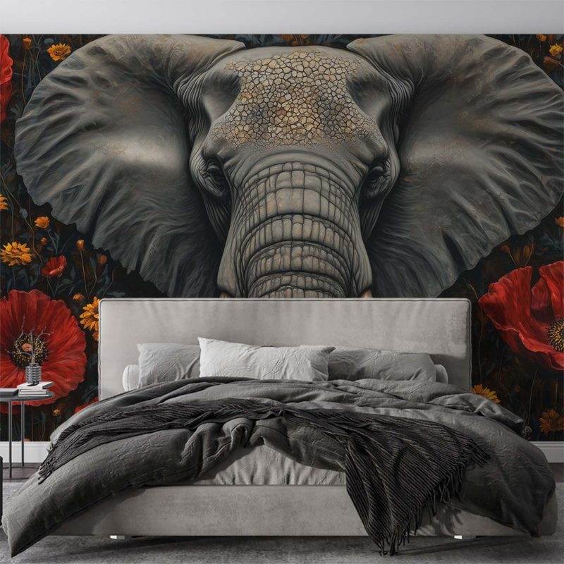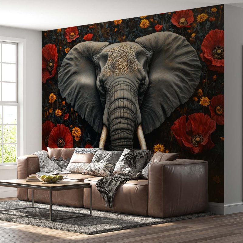 Ontwaak de ruimte met dit serene behang waar een majestueuze olifant omringd wordt door een levendige zee van rode en gele bloemen. De donkere achtergrond laat de kleuren krachtig oplichten, terwijl de harmonieuze compositie rust uitstraalt. Perfect voor een statement muur die zowel avontuur als elegantie brengt, en elke kamer transformeert tot een oase van natuurlijke schoonheid.