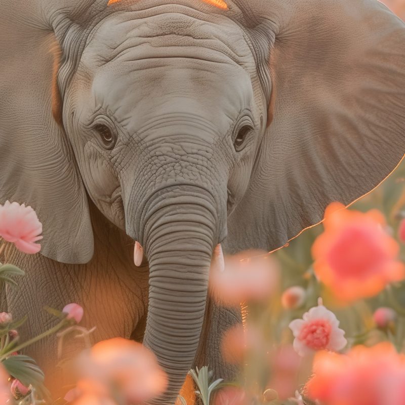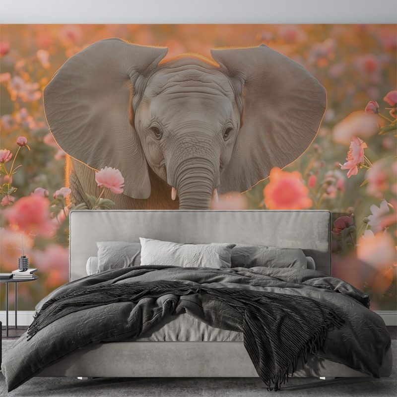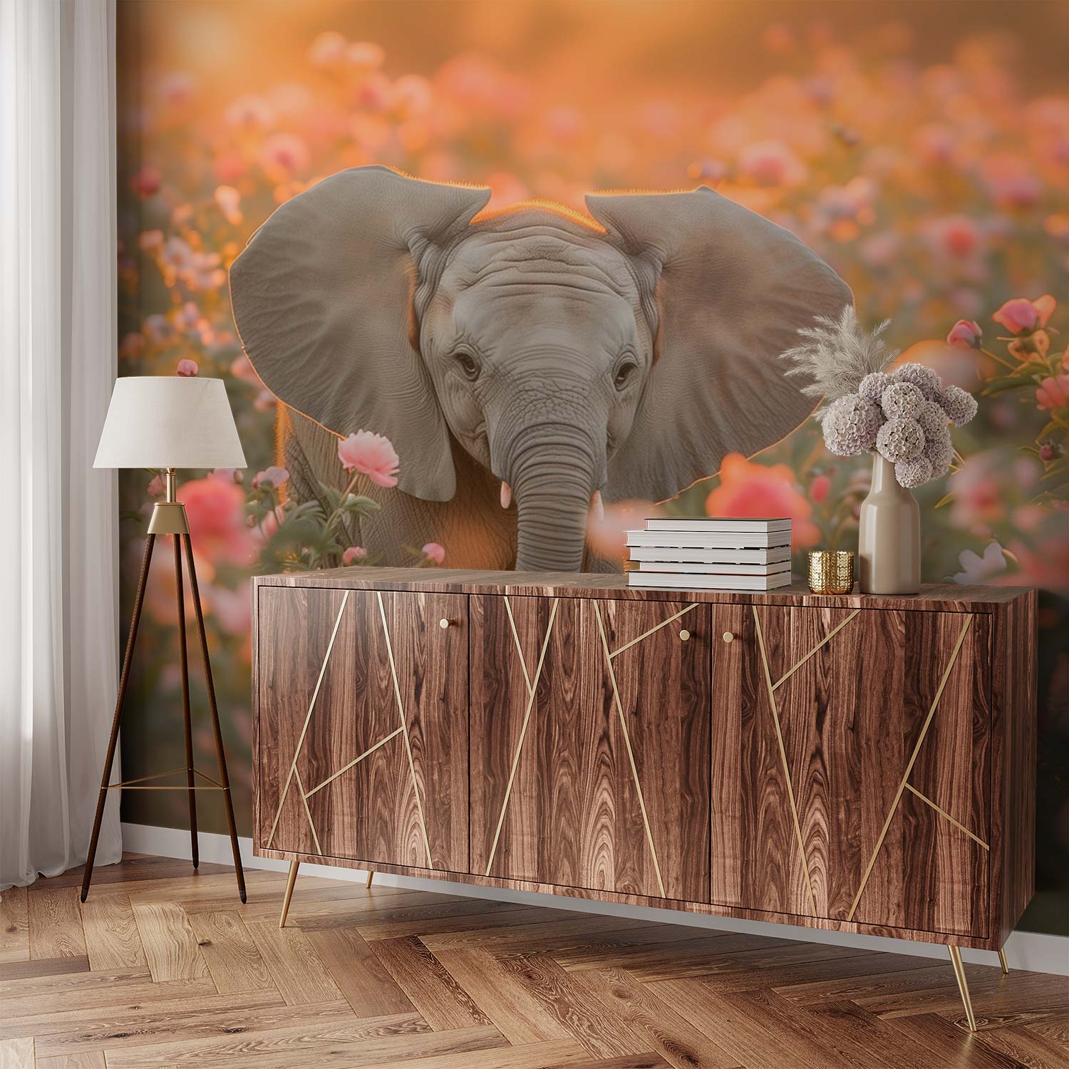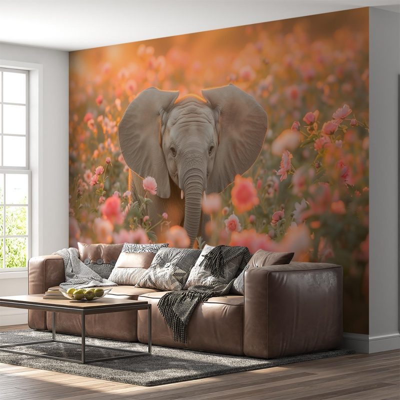Oranje en roze bloemen golven rond een machtige olifant. Zijn slurf reikt naar de aarde, terwijl de zachte avondzon een gouden gloed over het tafereel werpt. Dit behang brengt de rust van de savanne in huis en creëert een warme, harmonieuze sfeer in elke ruimte.