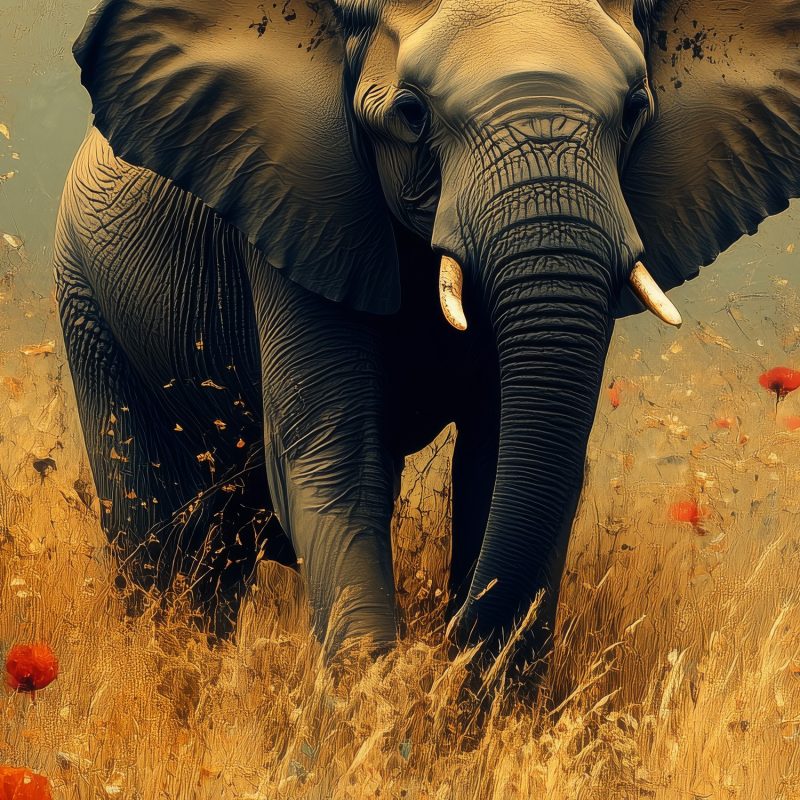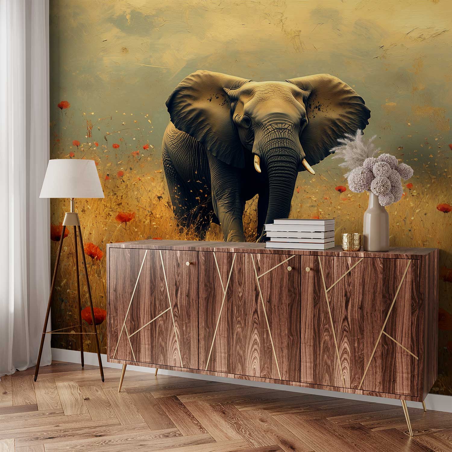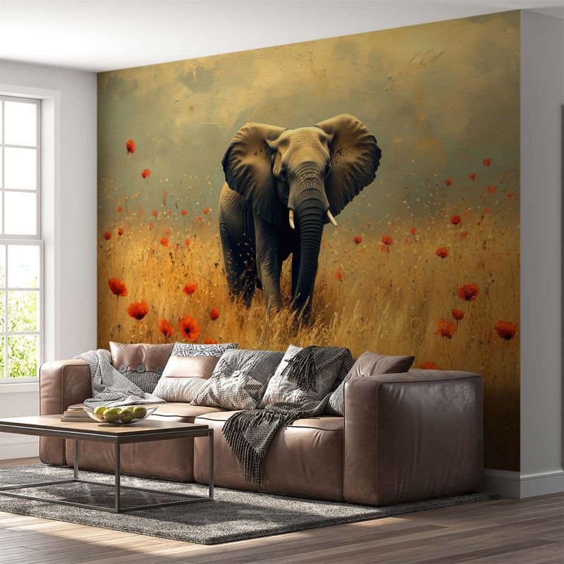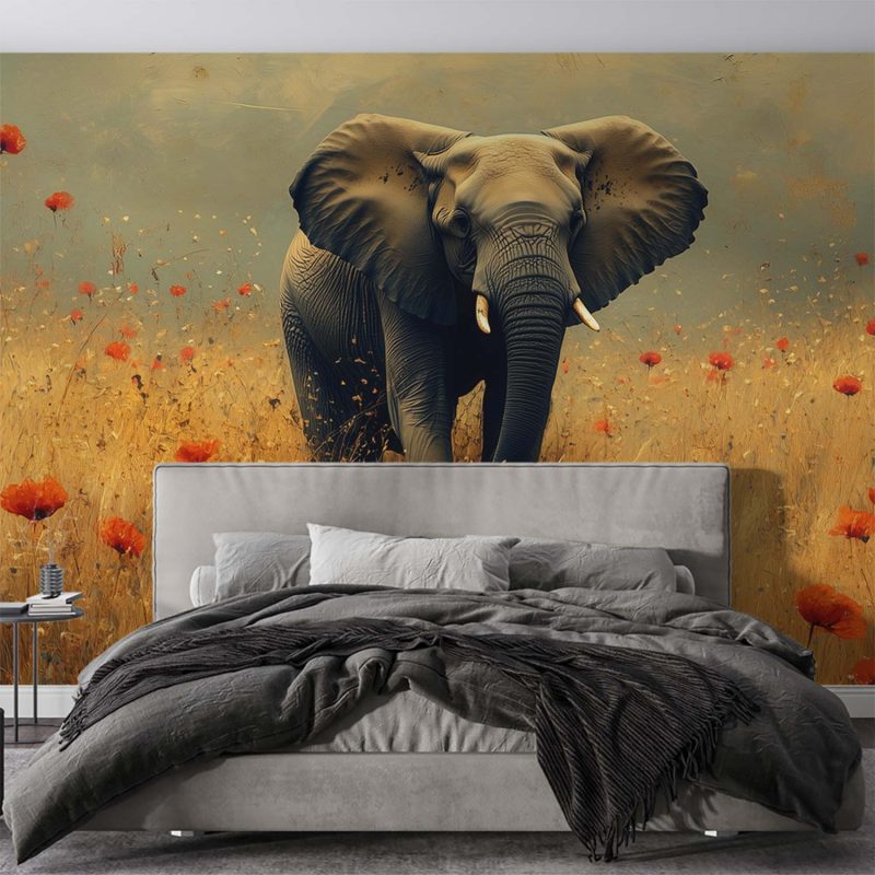 Zachte grijstinten van de majestueuze olifant dansen tussen een zee van vlammende rode klaprozen. Hoge grassen wiegen zachtjes in de bries terwijl dit serene tafereel tot leven komt. De warme harmonie van de natuur brengt onmiddellijke rust in je ruimte. Dit levendige behang transformeert elke kamer in een oase van natuurlijke schoonheid en kalmeert de ziel met zijn tijdloze elegantie.