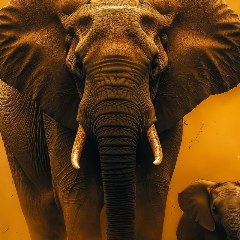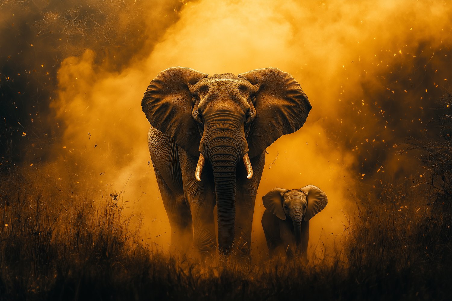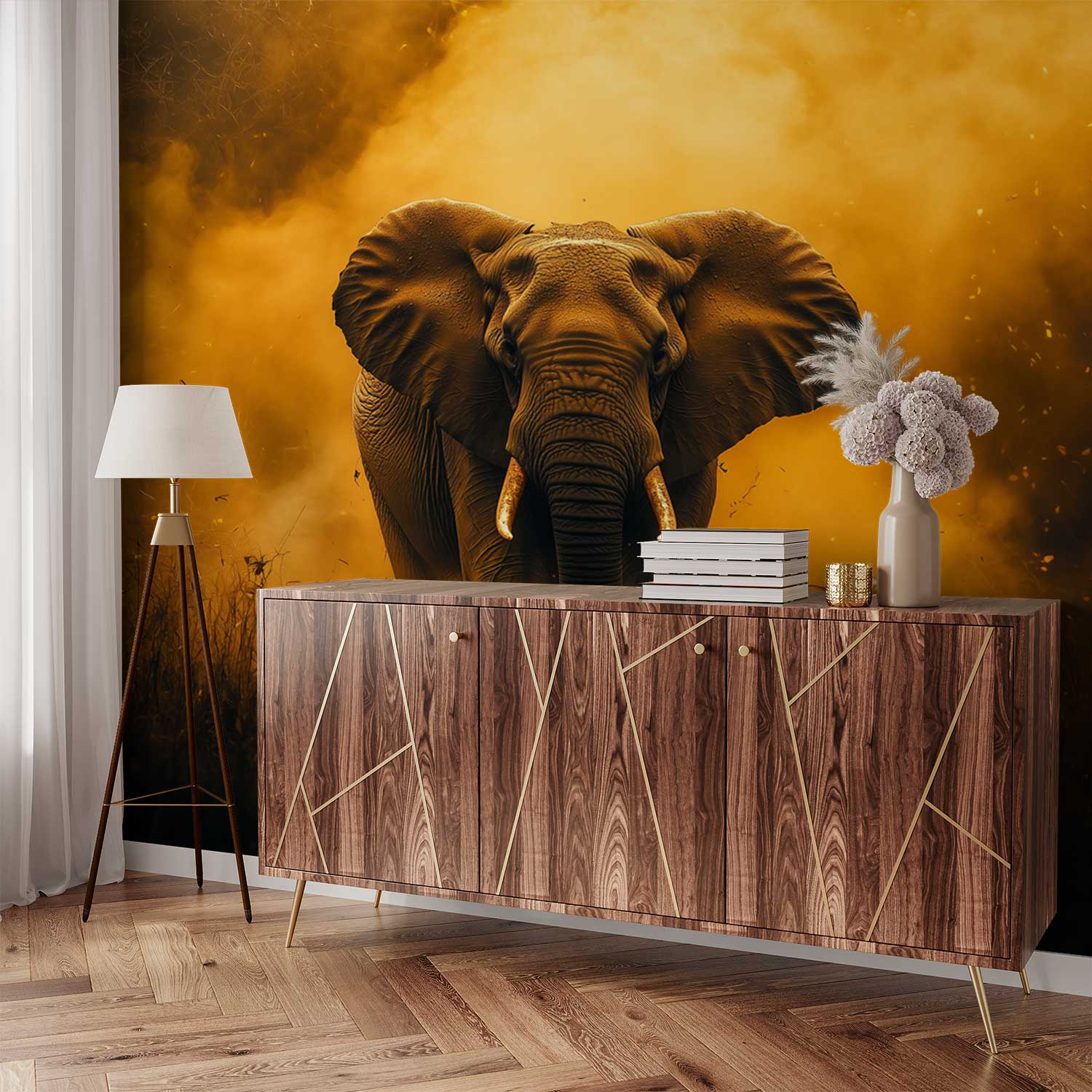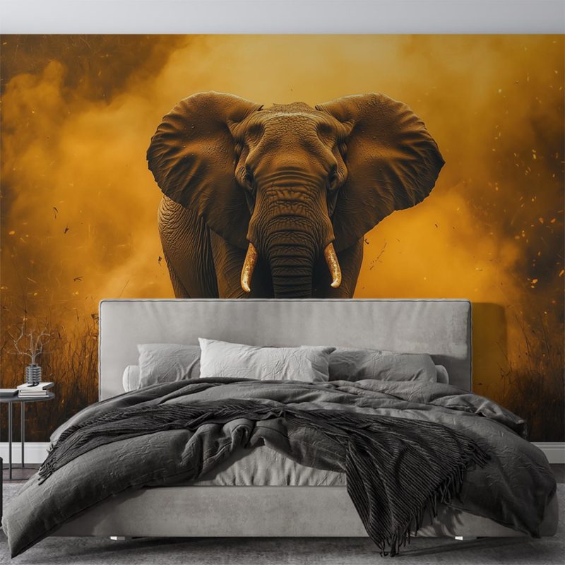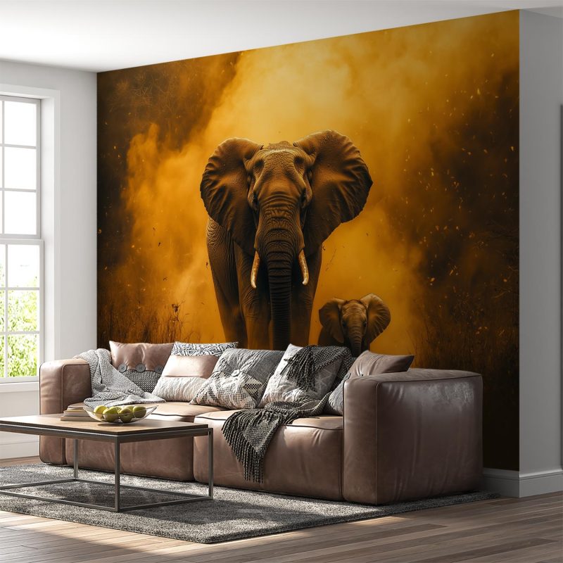 Warme oranje en bruine tinten dansen in een stofwolk rond dit majestueuze olifantenduikel. De kalveren scharrelen speels naast de imposante volwassene, hun texturen bijna tastbaar. Dit behang brengt de rustige grootsheid van de savanne in huis, perfect voor een aardse, serene sfeer in je interieur.