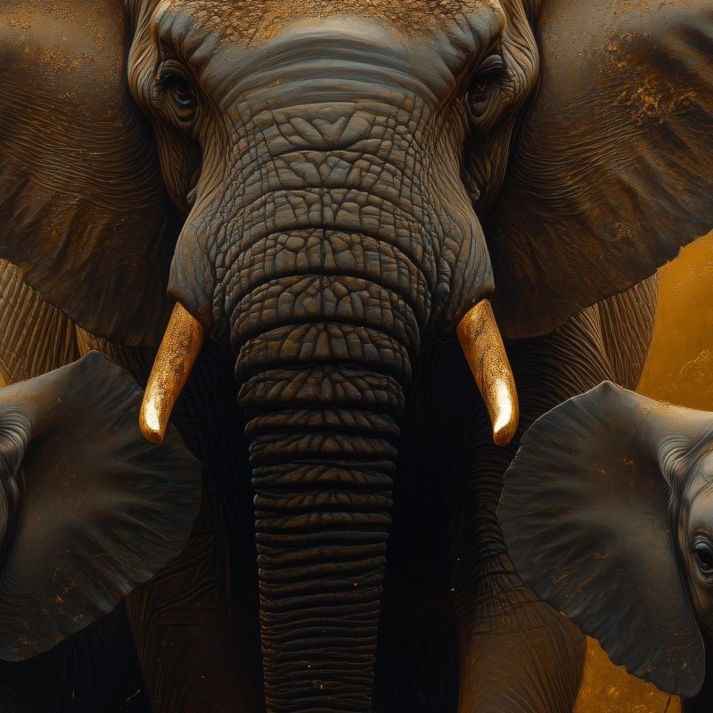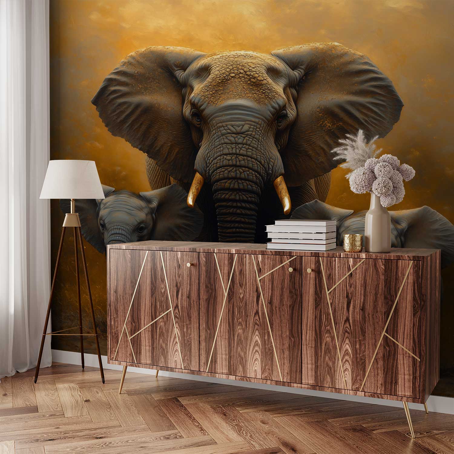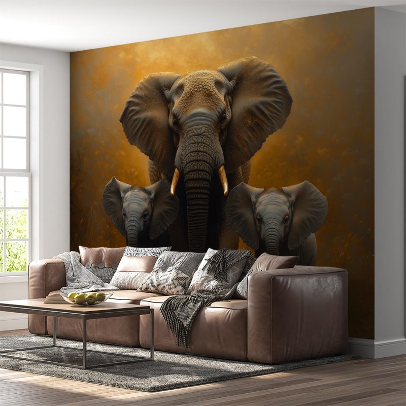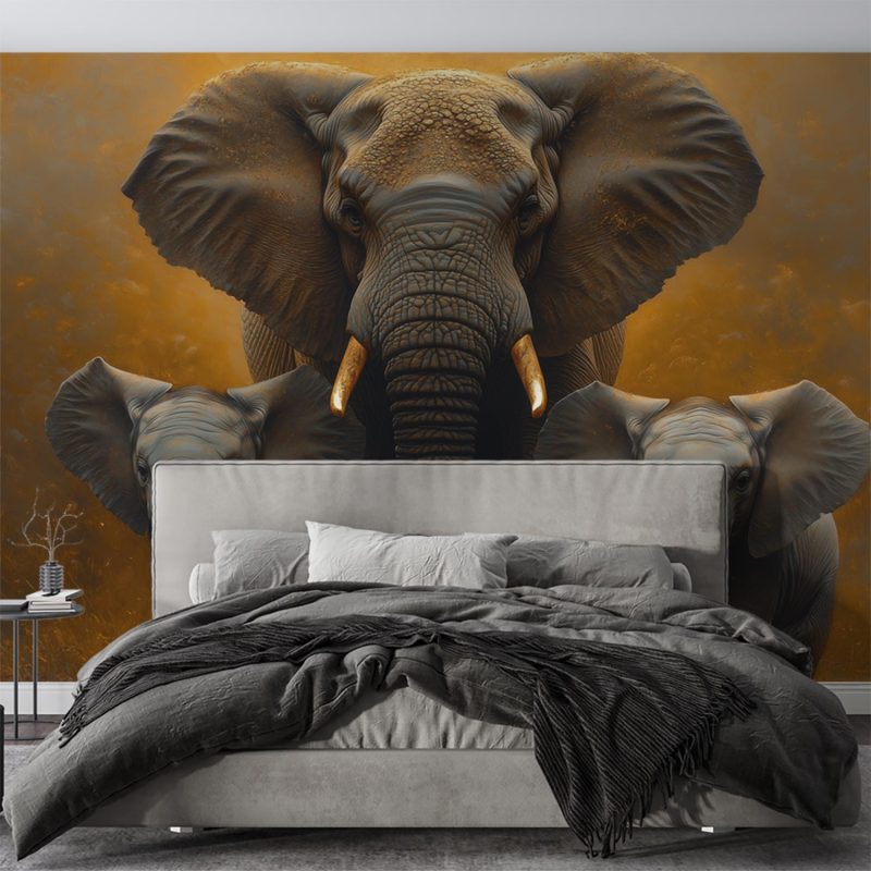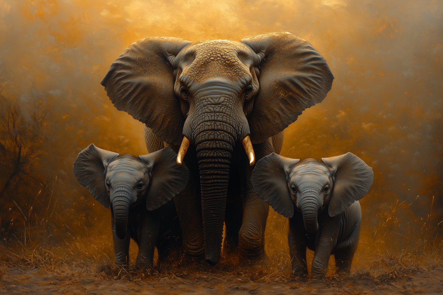 Warme oranje en bruine tinten omhullen dit serene olifantentafereel. Drie majestueuze dieren stralen rust en harmonie uit, waarbij de centrale olifant met zijn imposante slurf en oren de blik vangt. Deze levendige scène brengt de kalme kracht van de natuur in huis, perfect voor een ruimte die baat heeft bij een aardse, gezellige sfeer en natuurlijke elegantie.