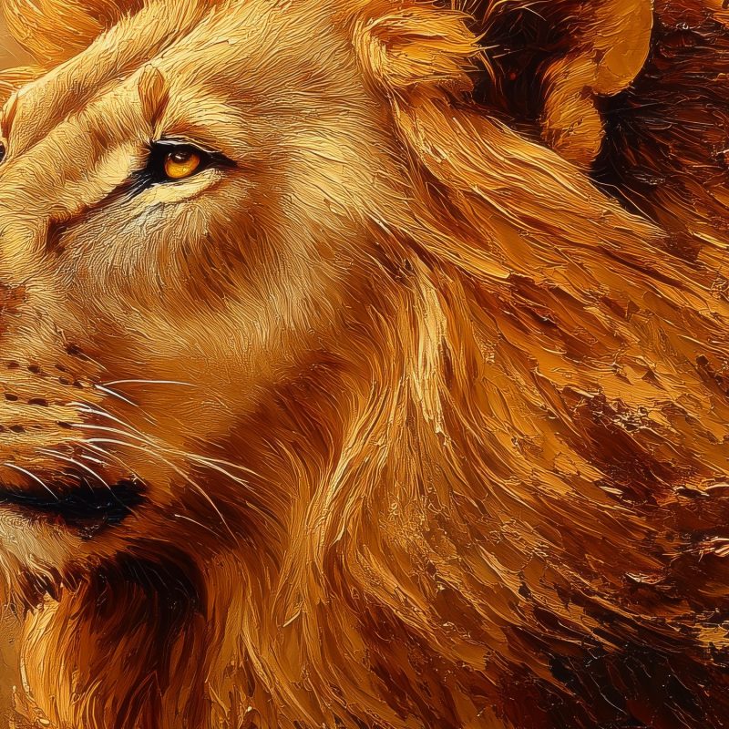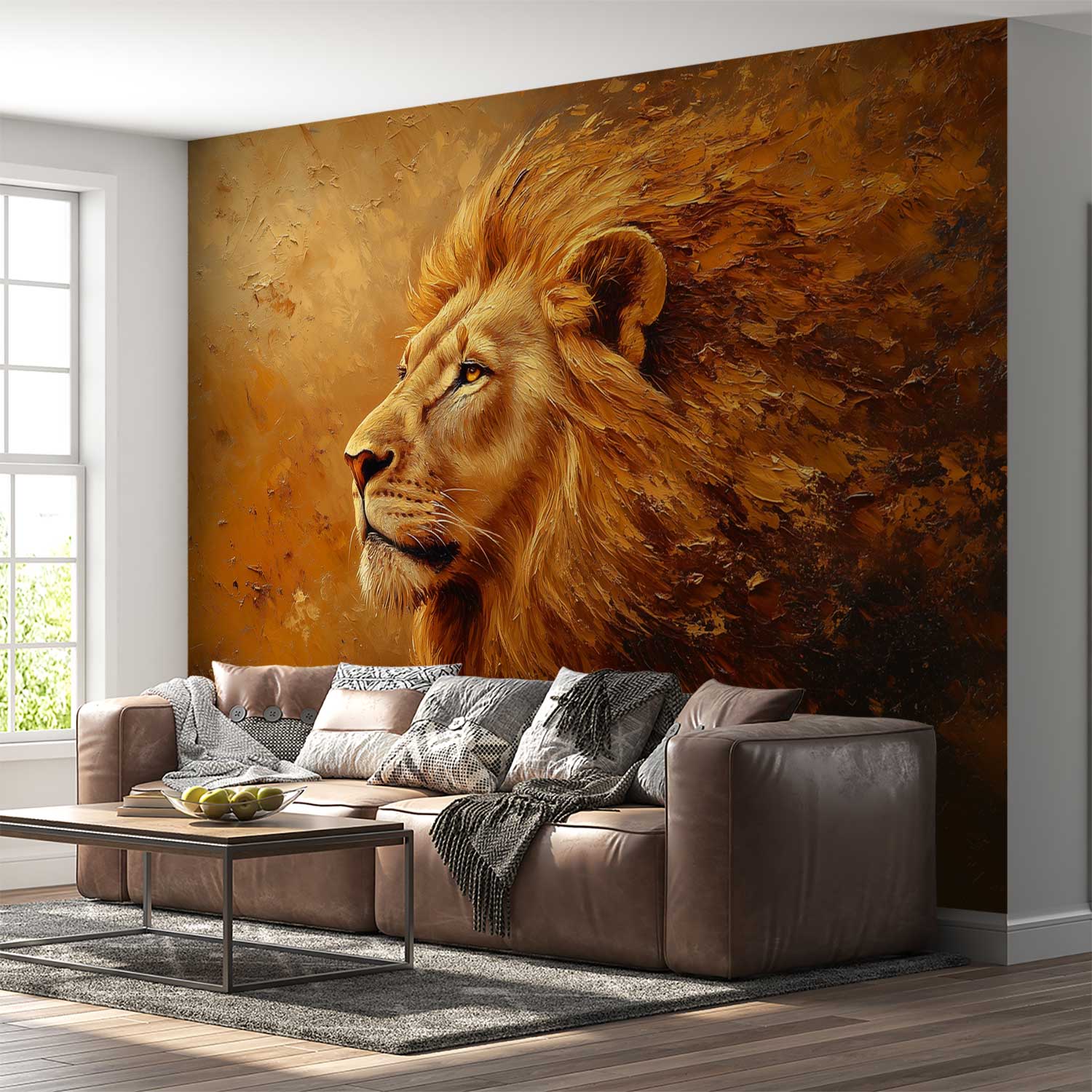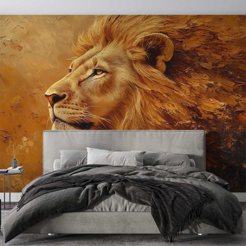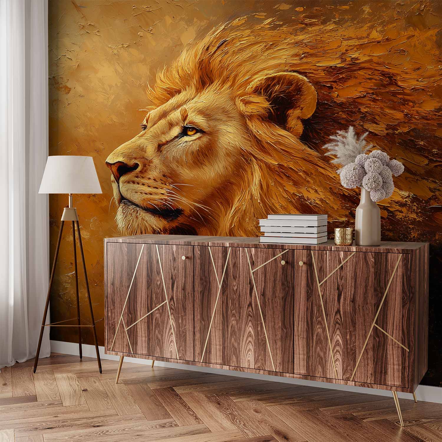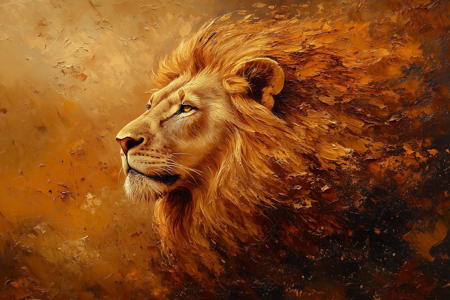 Vurige oranje en bruine tinten dansen rond de majestueuze leeuwenkop. Zijn golvende manen wapperen krachtig in de wind, vol levendige energie. Dit indrukwekkende kunstwerk straalt warmte en kracht uit, perfect om een statement te maken in je interieur. De impressionistische stijl creëert diepte en sfeer, ideaal voor een accentmuur die bewondering oogst.