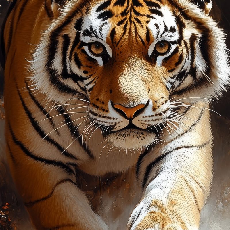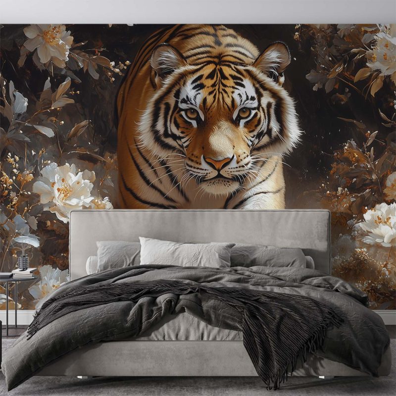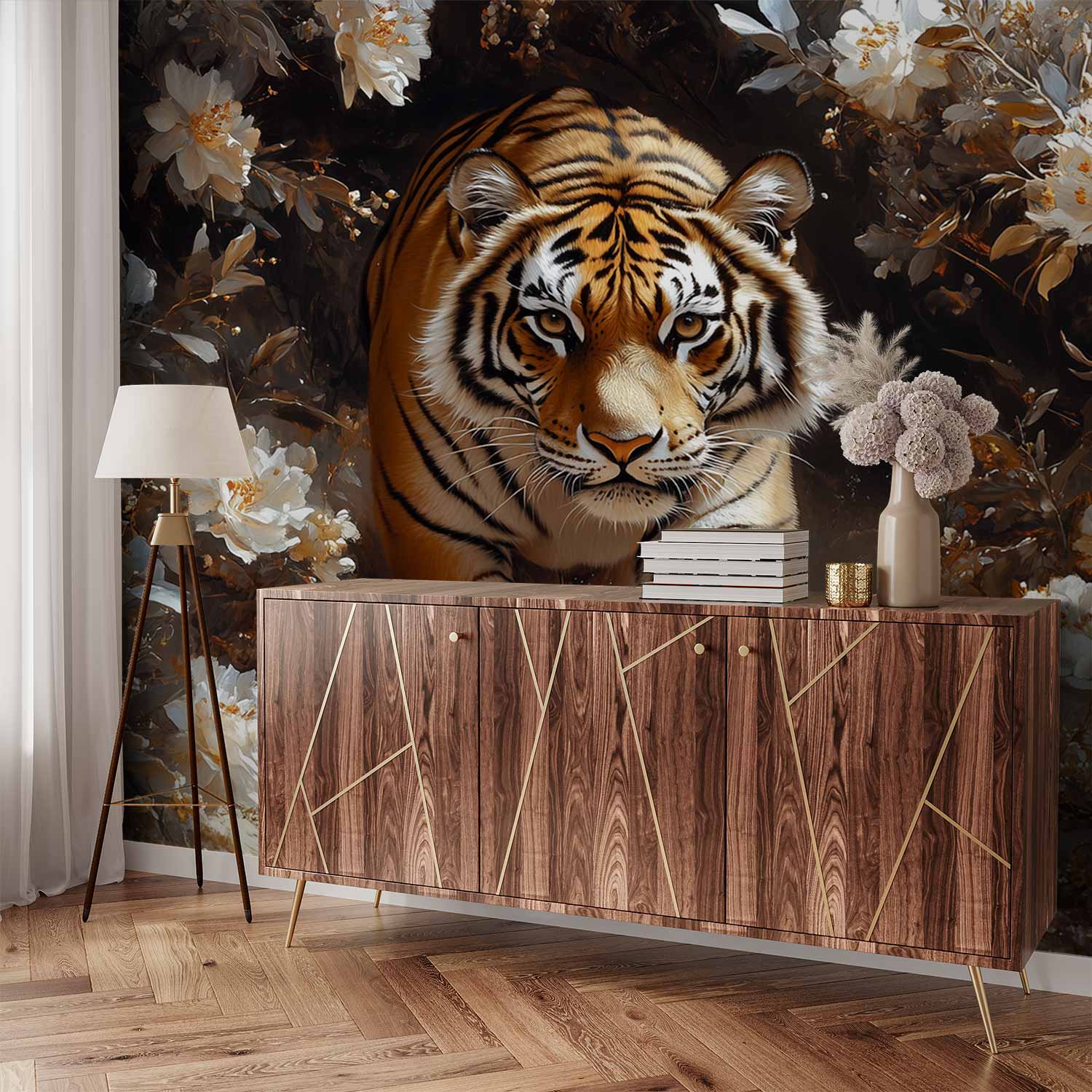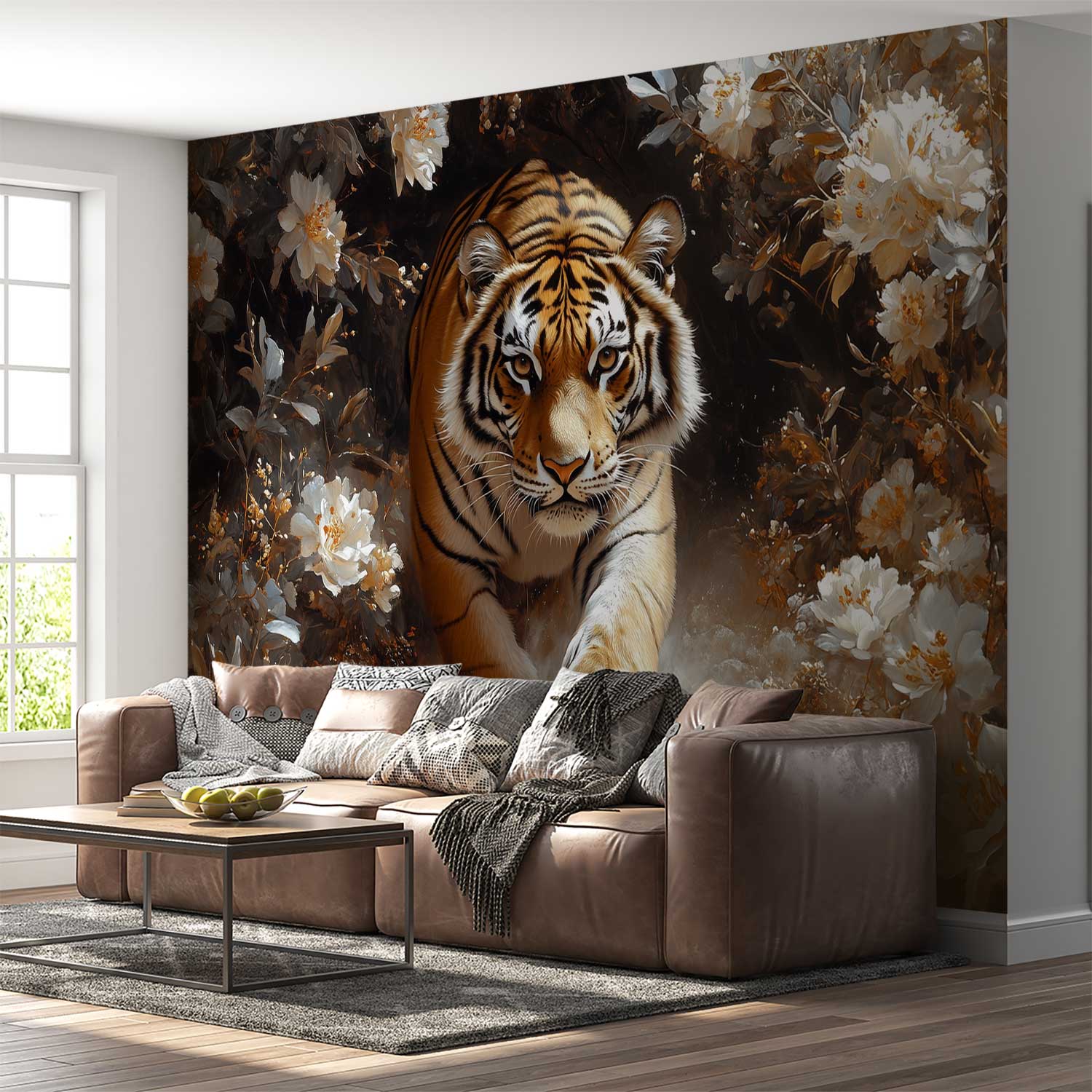 Oranje en bruine tinten dansen in dit serene boslandschap. Een majestueuze tijger loopt kalm tussen een zee van witte bloemen en weelderig groen. Zijn soepele bewegingen stralen pure harmonie uit, omringd door de rust van de natuur. Brengt een gevoel van ongestoorde schoonheid en bewondering in elke ruimte, perfect voor een rustgevende en stijlvolle sfeer.