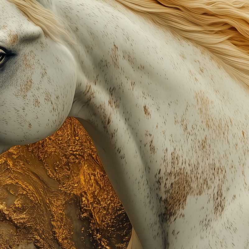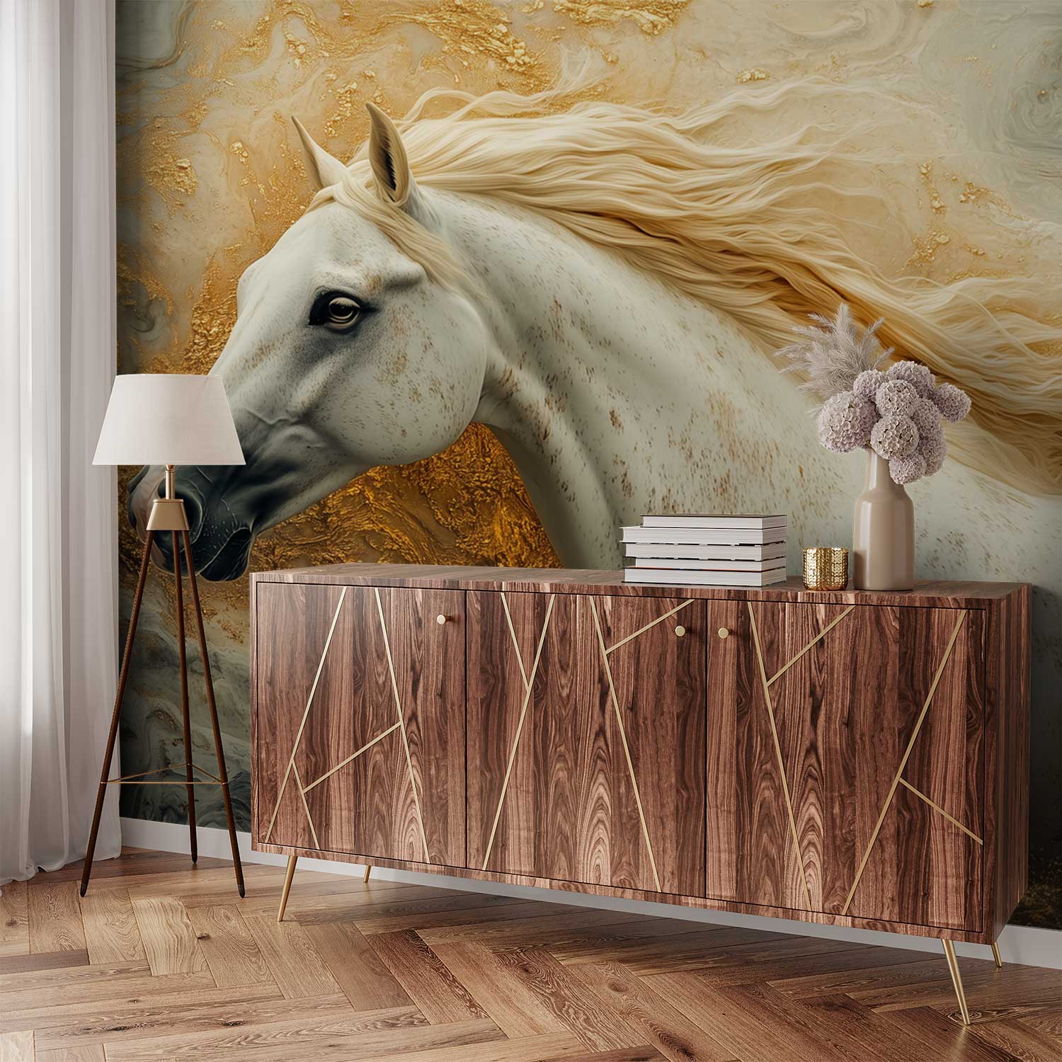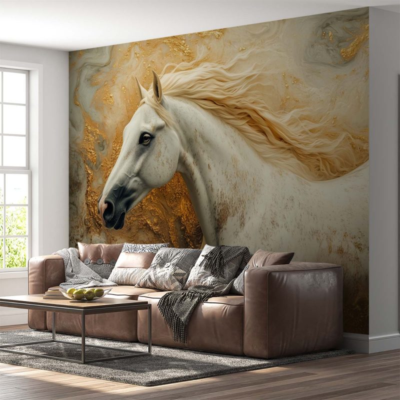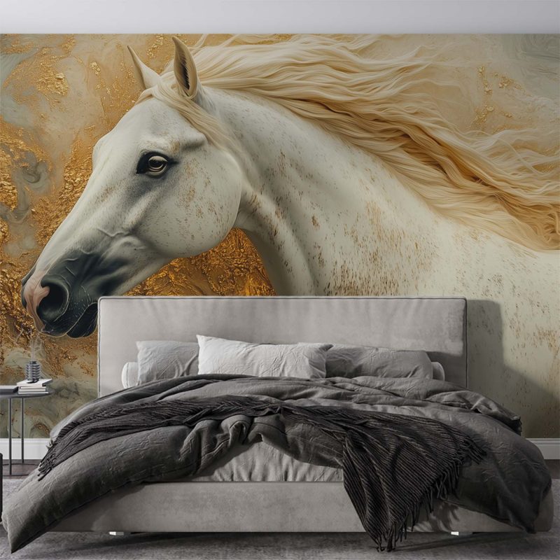 Vloeiend en vol energie galoppeert dit majestueuze witte paard tegen een adembenjende goudwitte achtergrond. Zijn dynamische houding en weelderige manen stralen kracht en elegantie uit. De luxe uitstraling van goud en wit brengt direct grandeur en beweging in je interieur, perfect voor een statement muur vol stijl en karakter.
