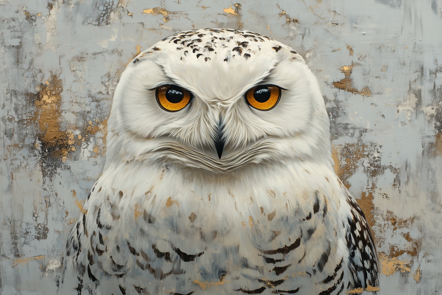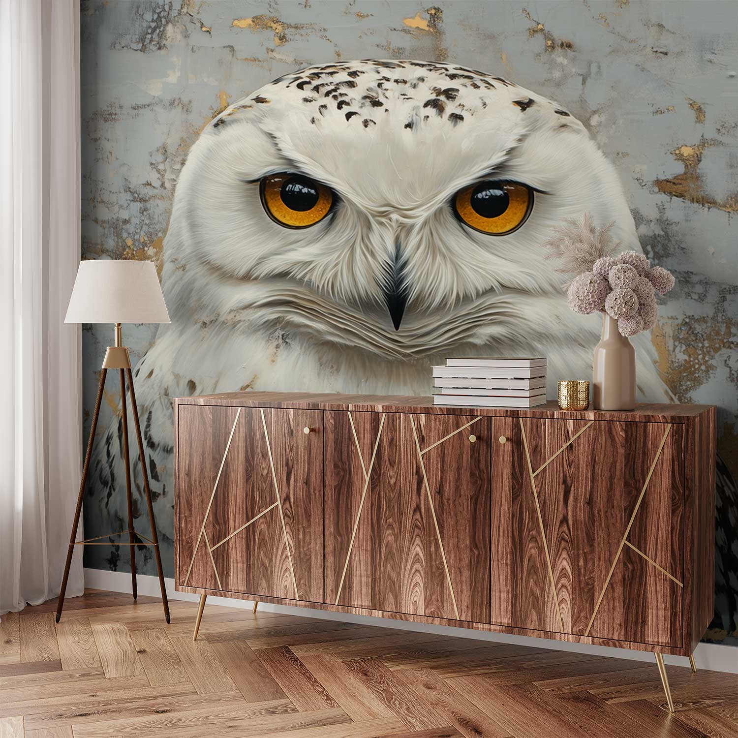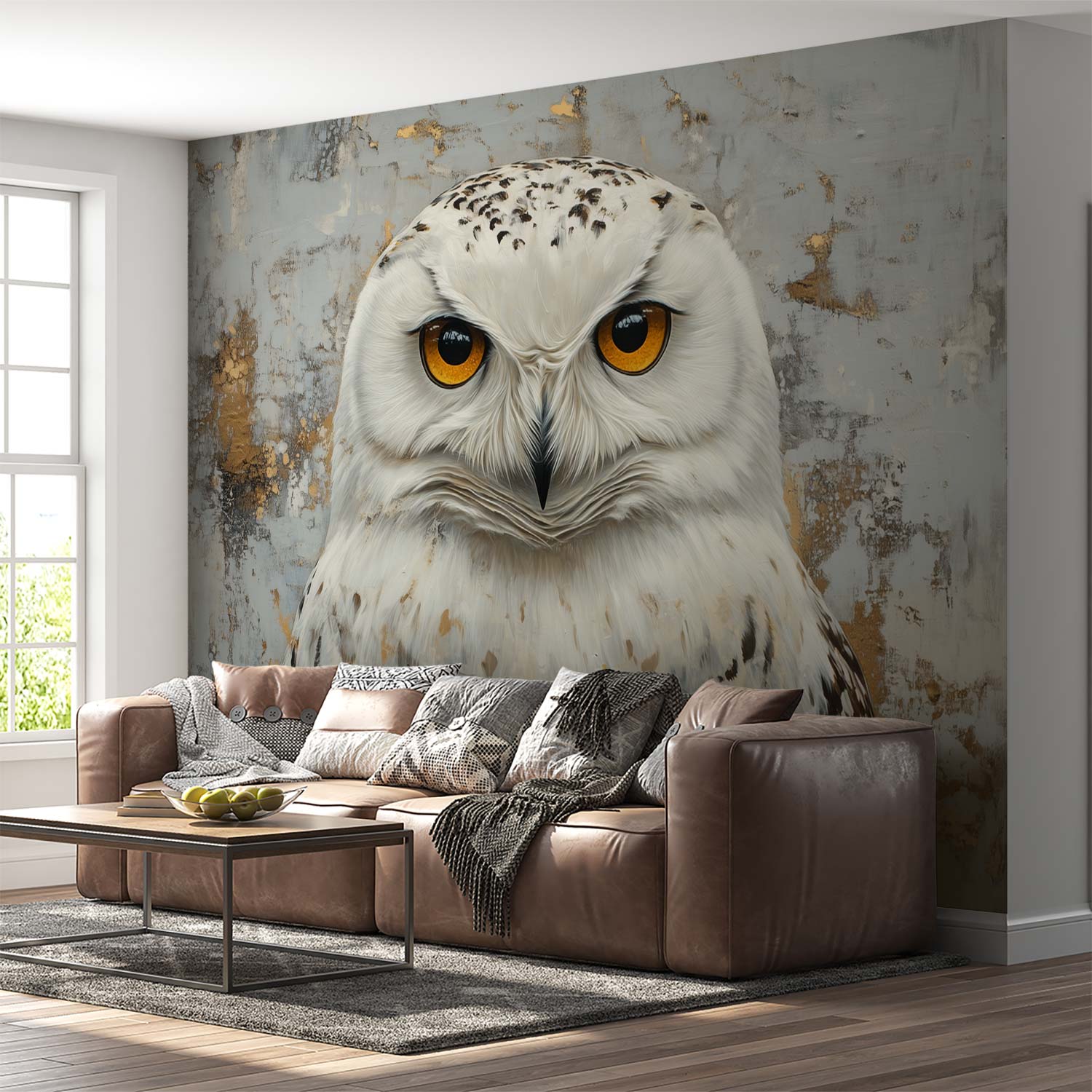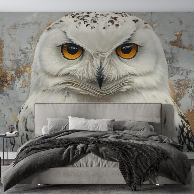 Majestueuze gele ogen vangen je blik, omringd door een zee van gespikkeld wit verenkleed. Tegen een grijze achtergrond komt deze imposante uil tot leven, zijn doordringende aanwezigheid voegt mysterie en natuurlijke elegantie toe aan elke ruimte. Perfect voor wie verfijning zoekt met een wild tintje, dit behang transformeert muren in een tijdloos kunstwerk dat bewondering oproept.