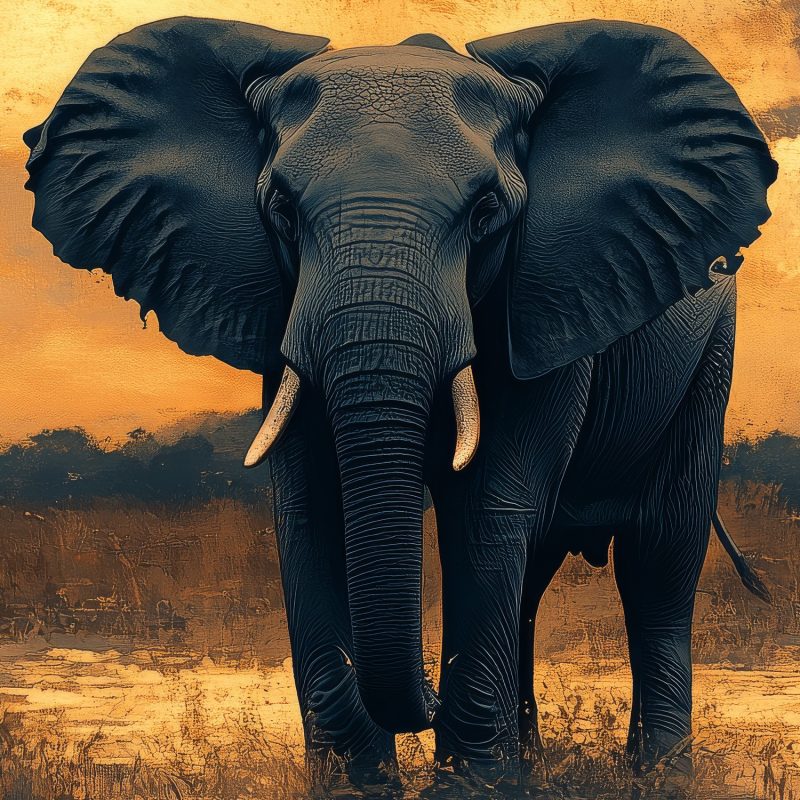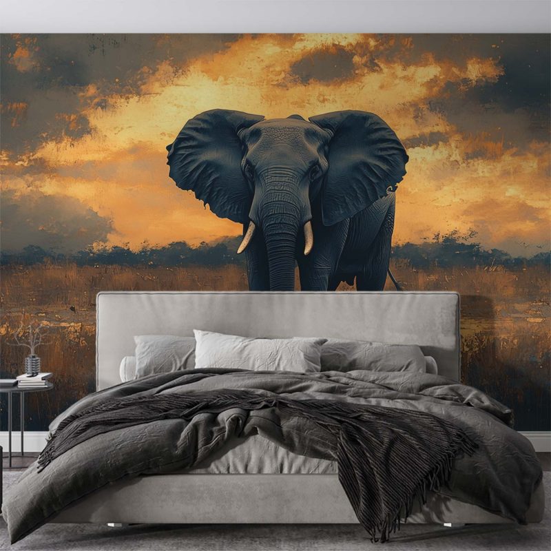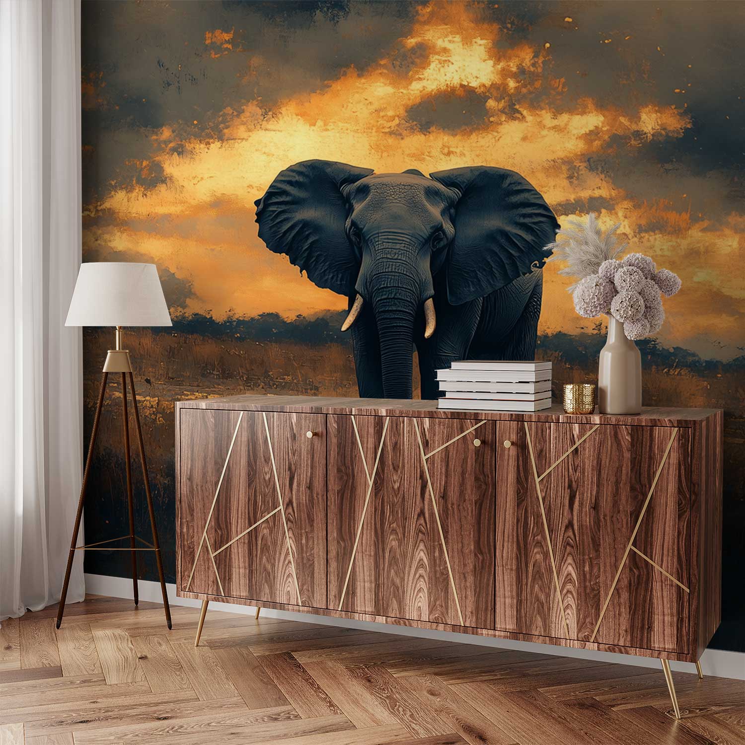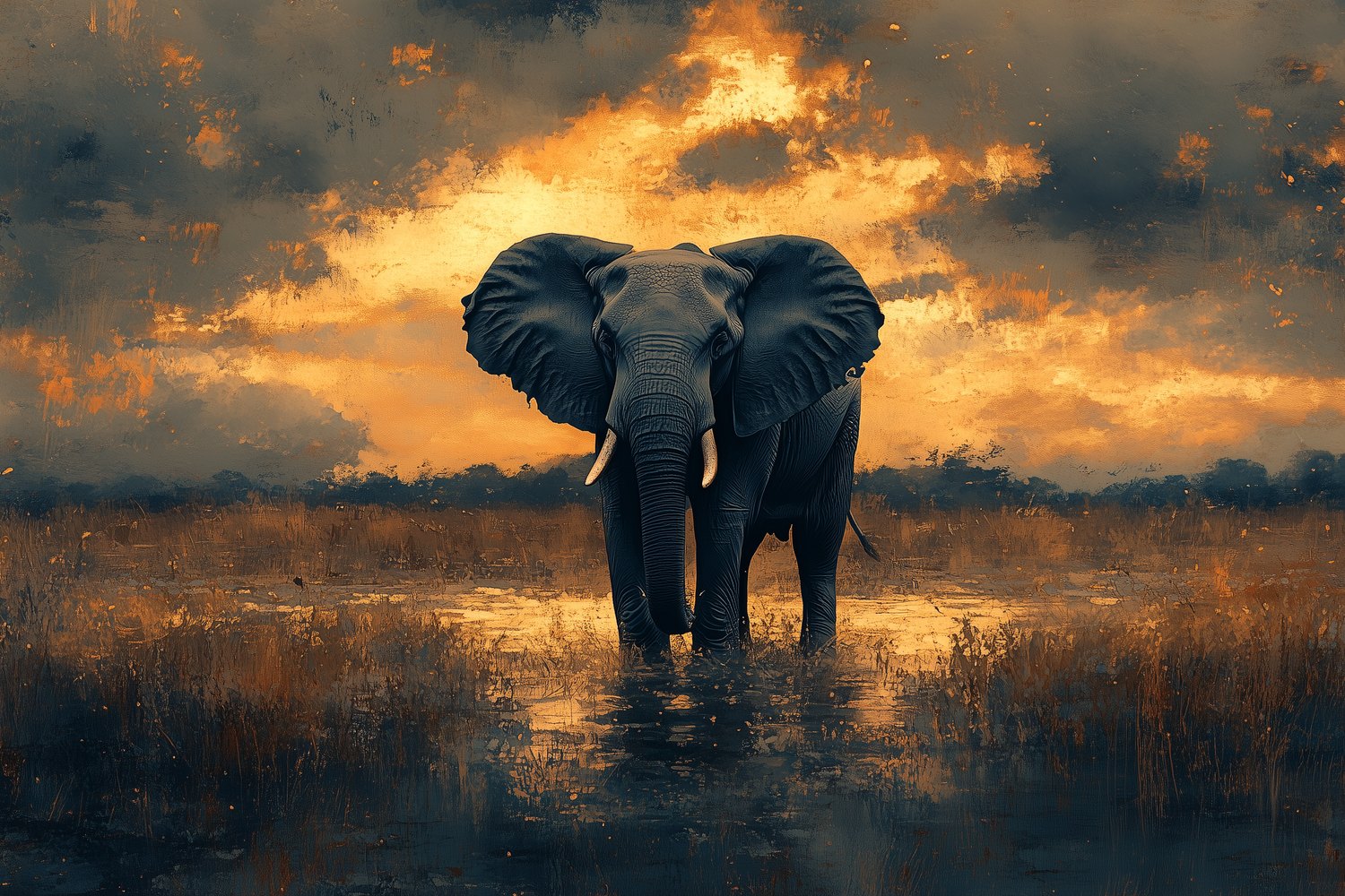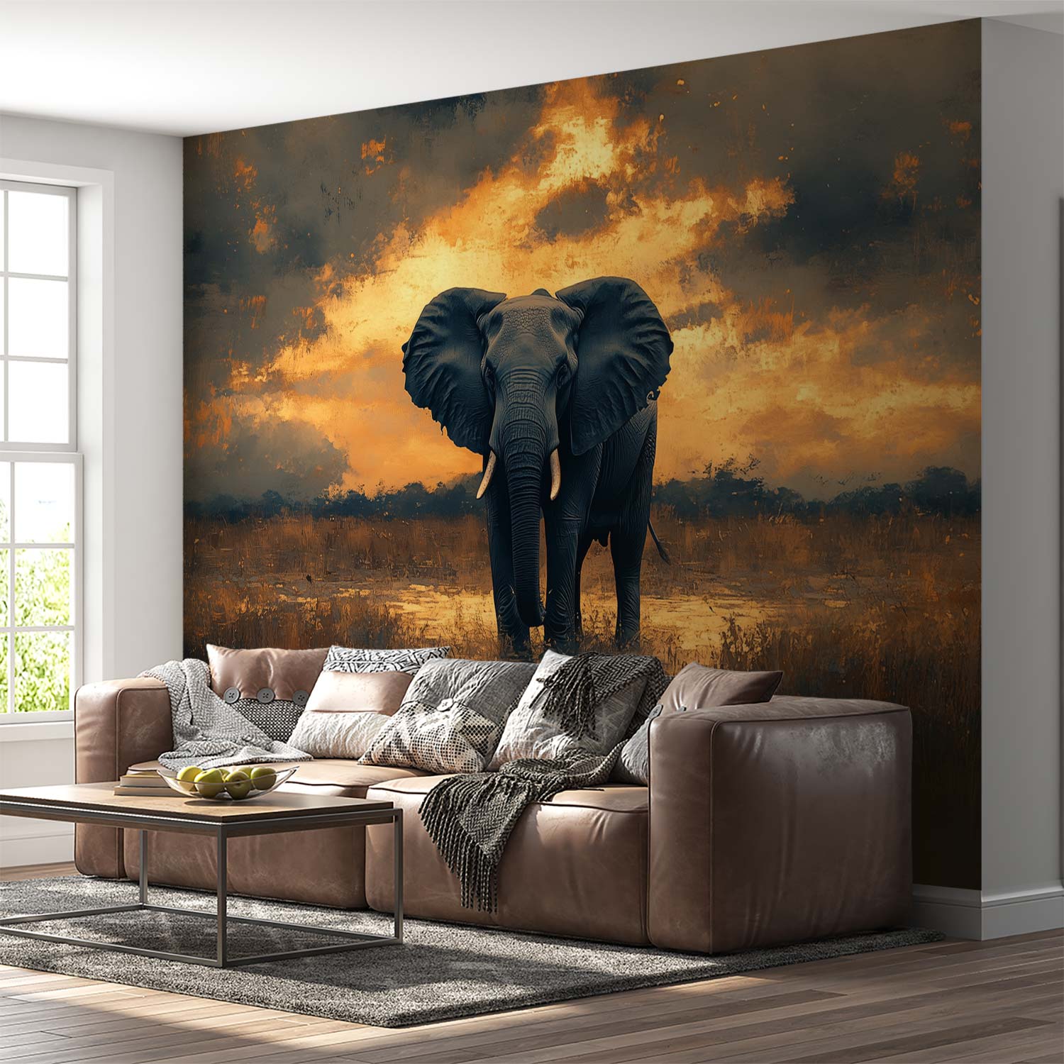 Oranje en gele zonsgloed omhult een majestueuze olifant in het water. Zijn slurf en oren tekenen zich krachtig af tegen de warme avondlucht. Dit serene tafereel brengt rust en verwondering in je interieur, als een moment van pure natuurlijke schoonheid op je muur.