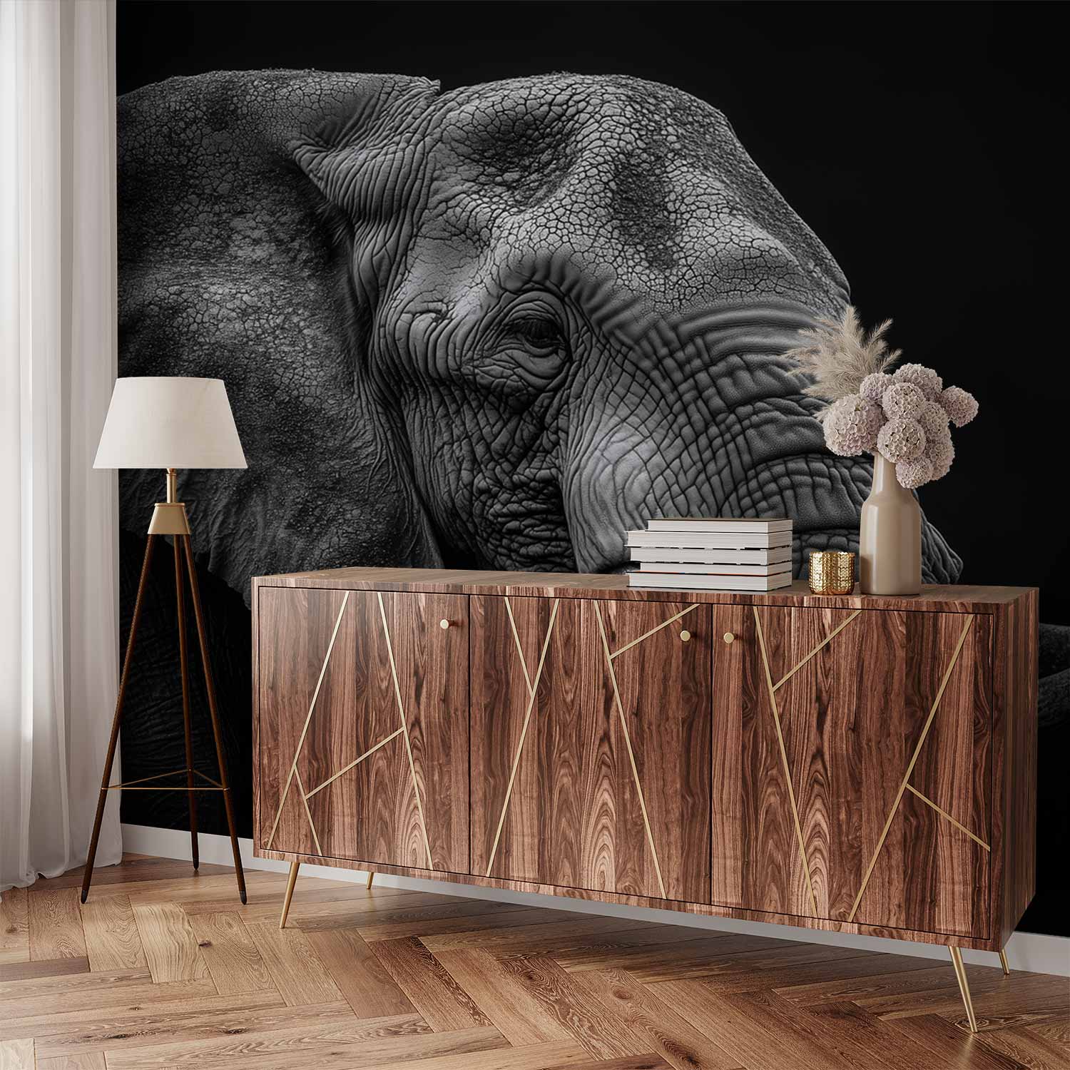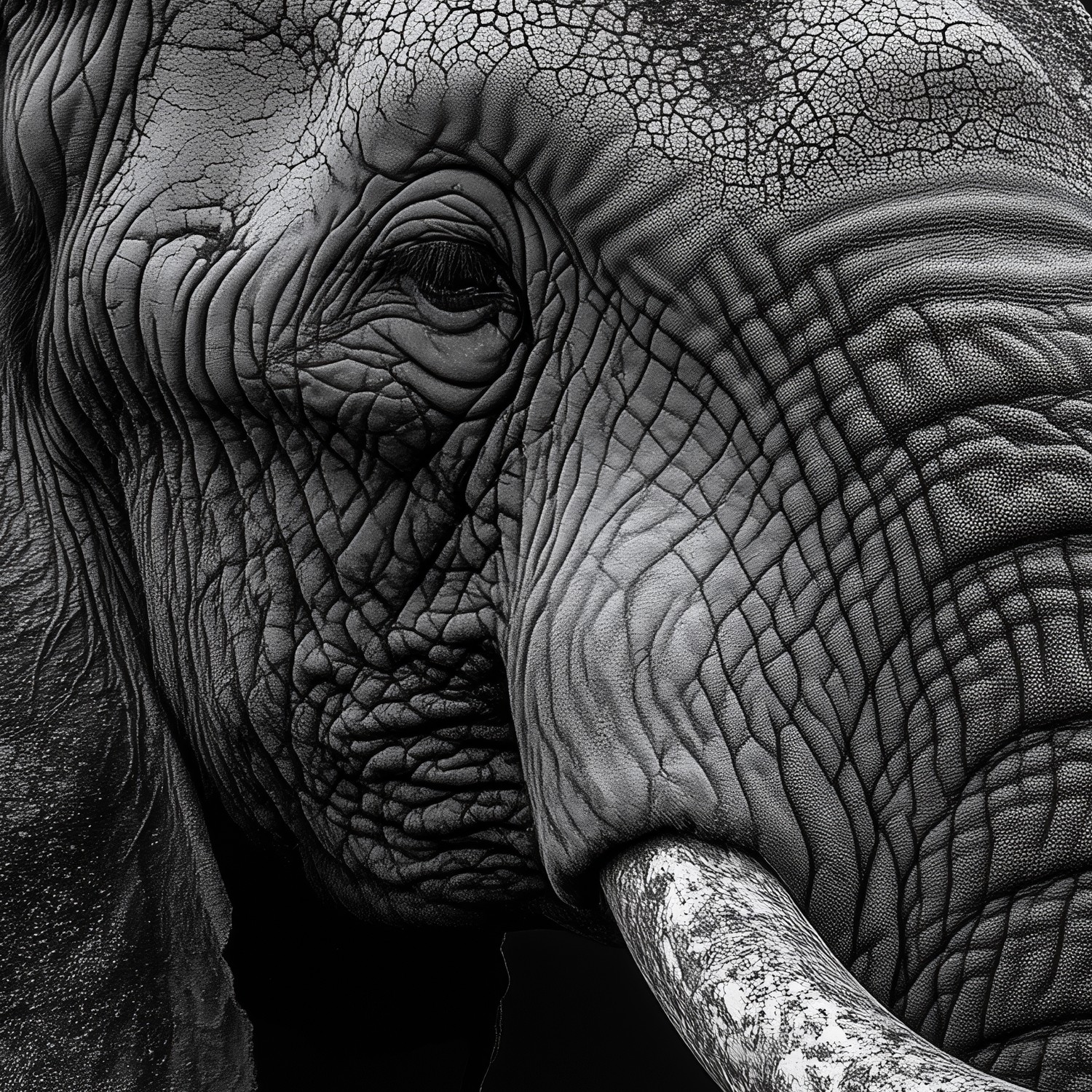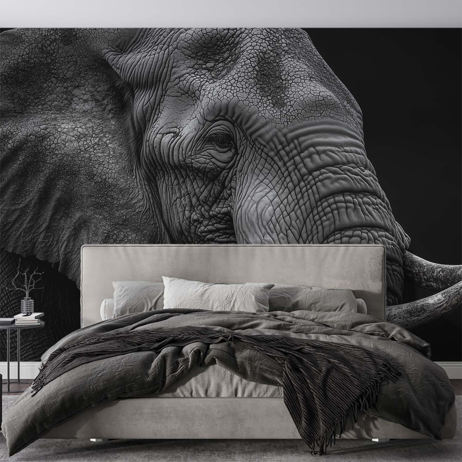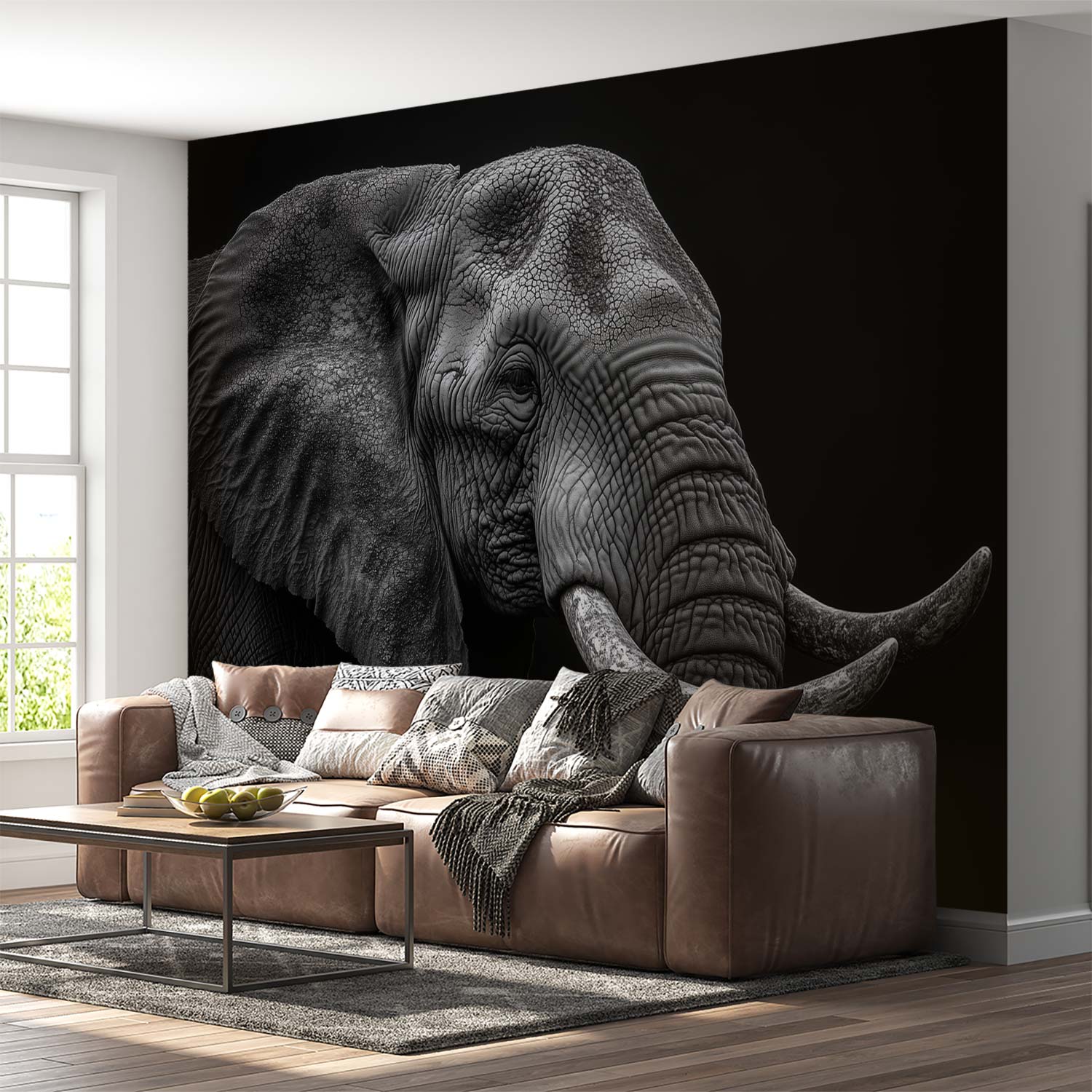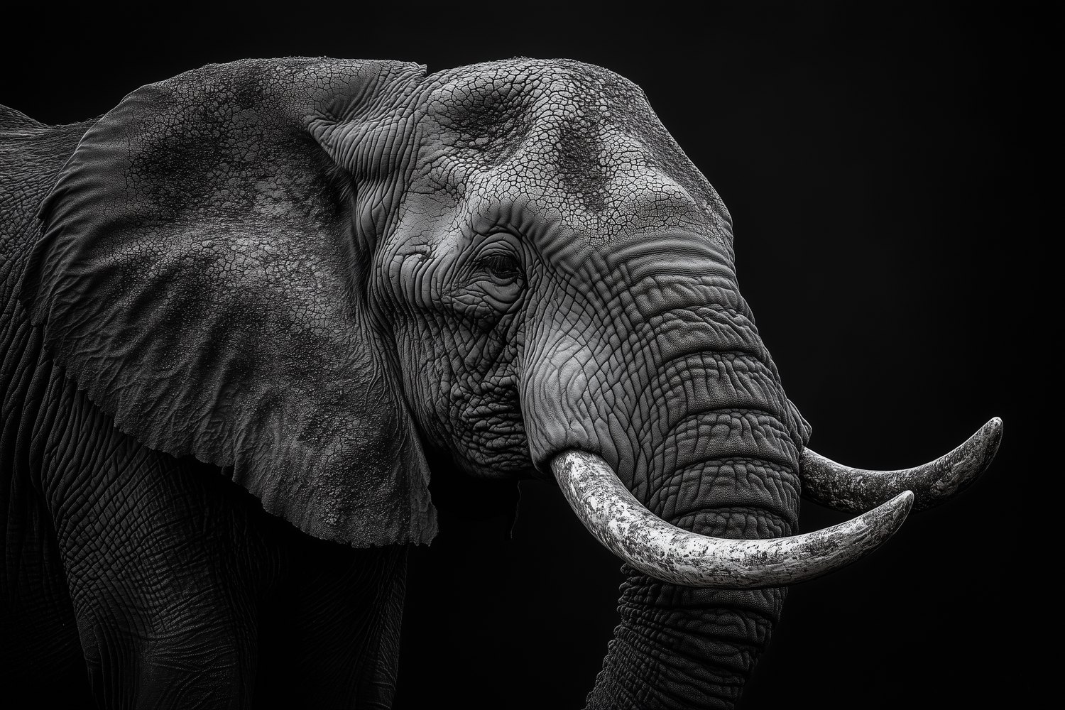 In dramatisch zwart-wit domineert een majestueuze olifant de ruimte, zijn slurf krachtig in beeld. De tijdloze monochromatiek legt elke textuur van zijn huid vast, terwijl de eenvoudige achtergrond diepte creëert. Deze muurdecoratie straalt serene kracht uit en brengt een statement van natuurlijke veerkracht in je interieur, perfect als focal point in een moderne ruimte.