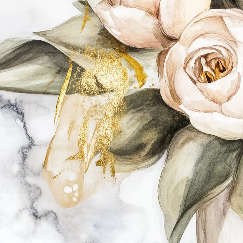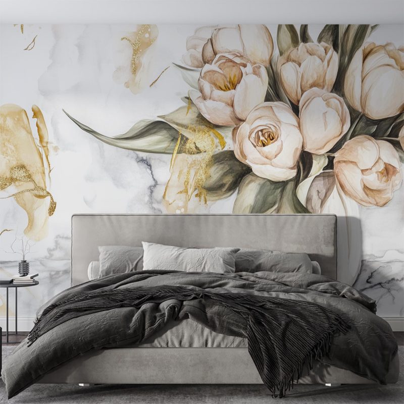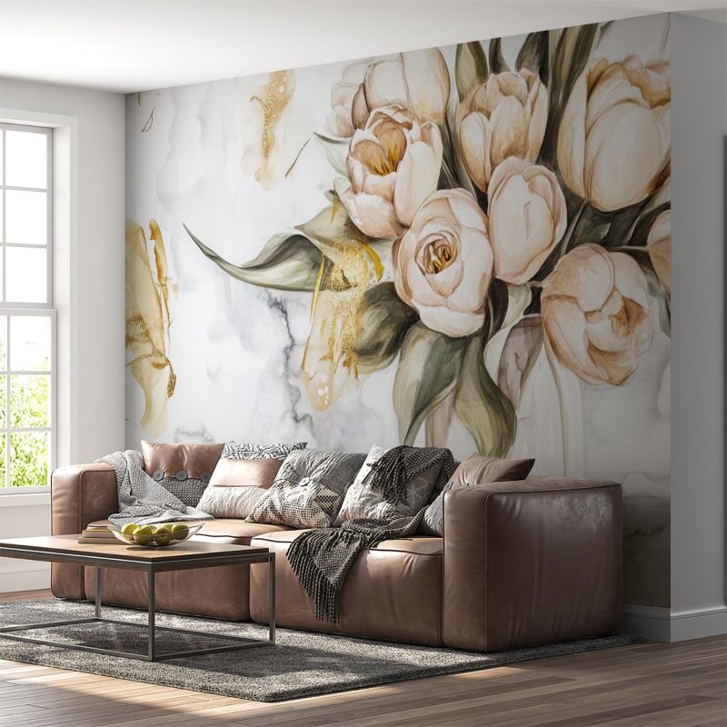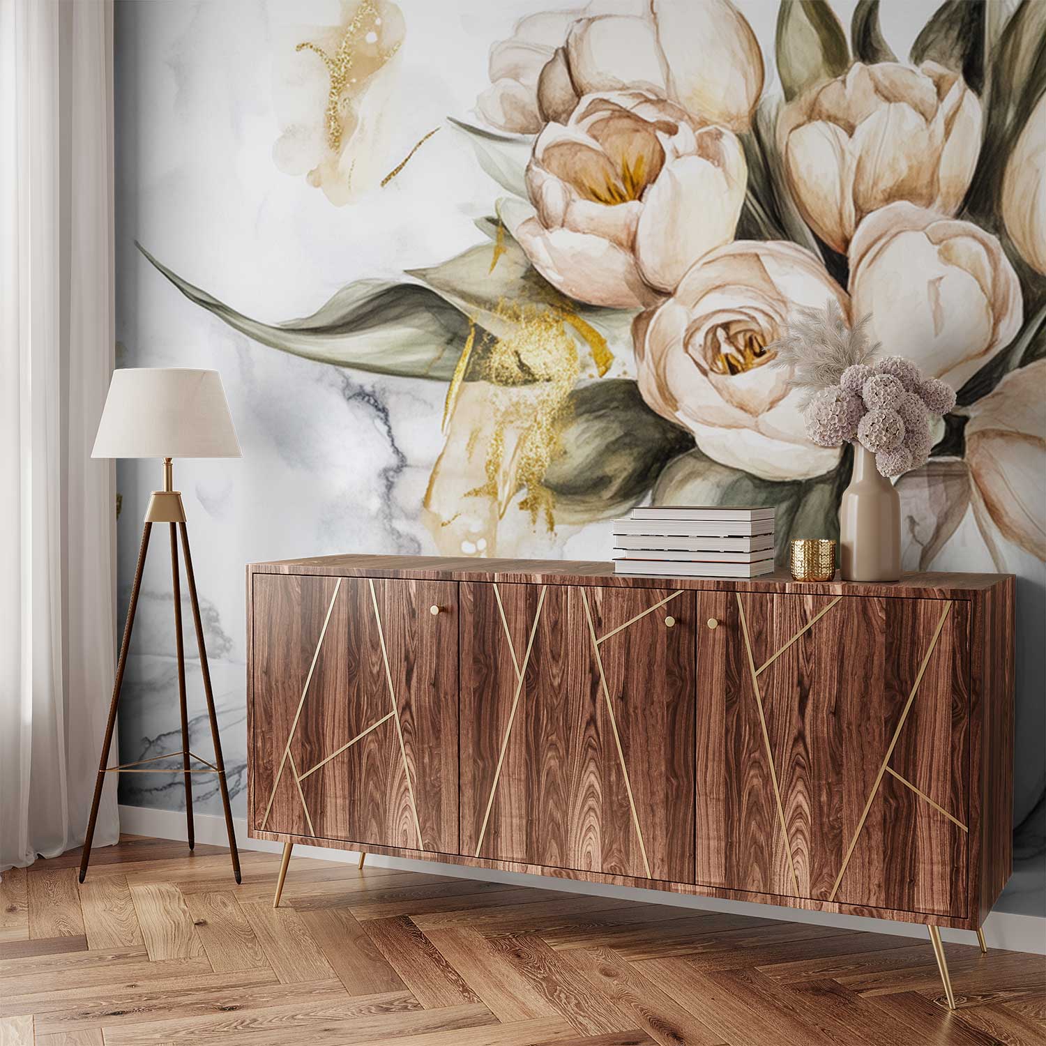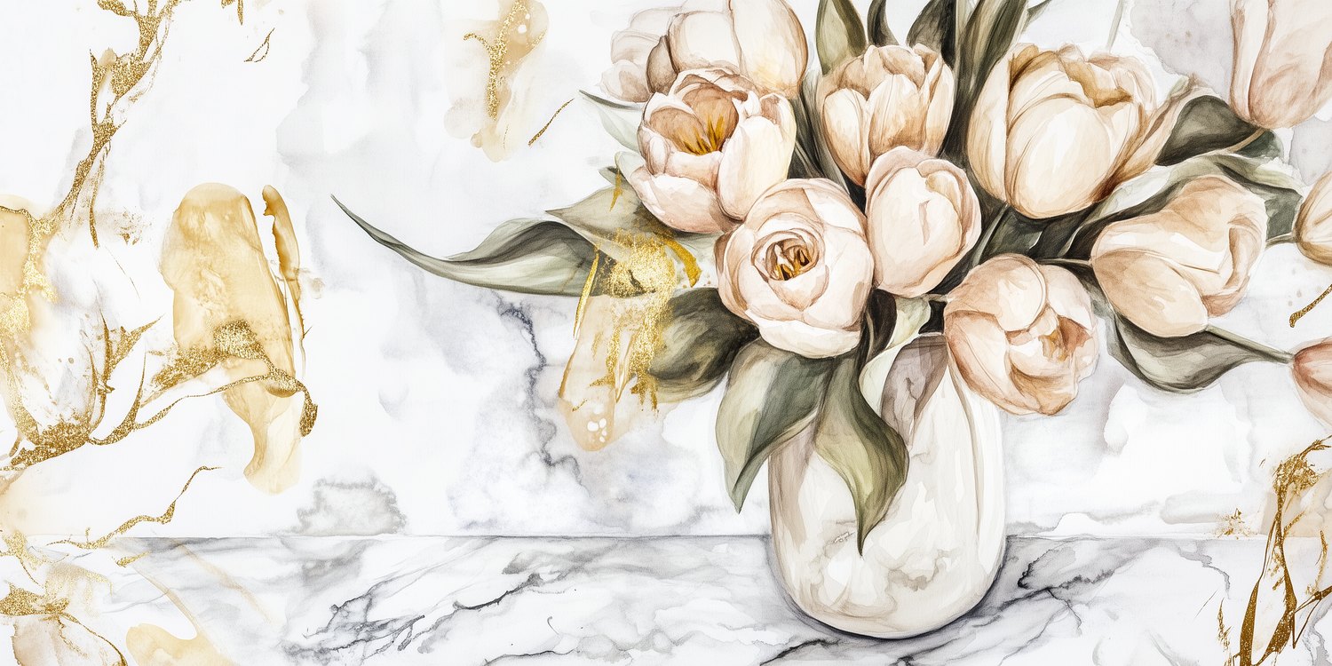 Bloeiende roze en witte bloemen dansen elegant uit een witte vaas op een marmeren ondergrond. Gouden accenten verhogen de luxe uitstraling terwijl de frisse bloemenpracht leven brengt. Dit behang voegt tijdloze elegantie en natuurlijke schoonheid toe aan elke ruimte. Perfect voor interieurs die verfijning zoeken met een vleugje levendige charme.