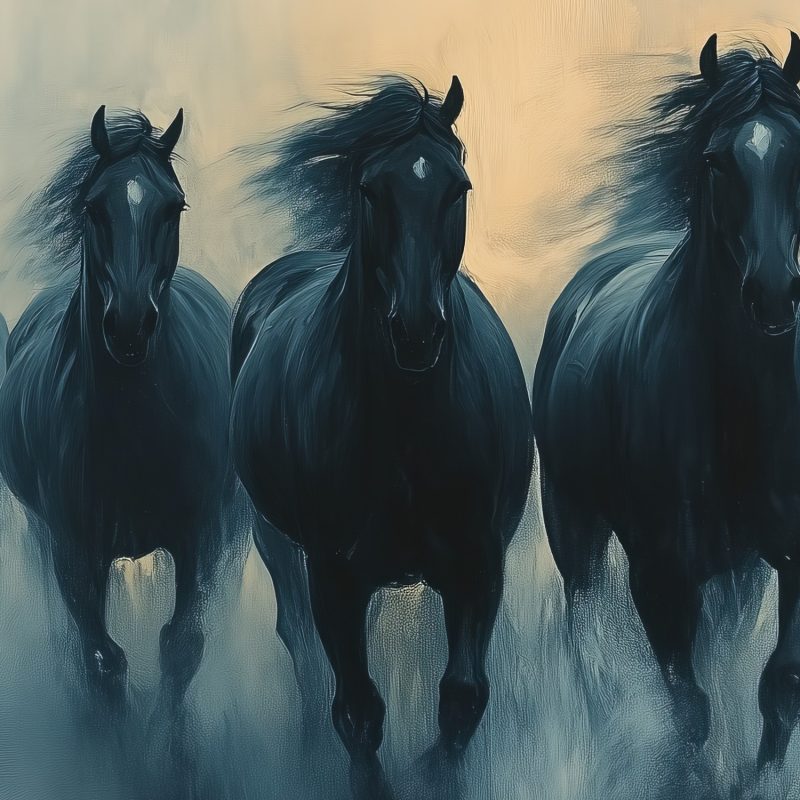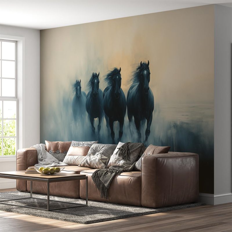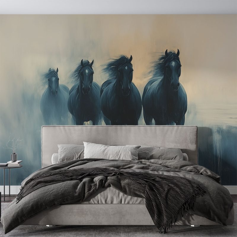 Vier zwarte paarden stormen door een mistig landschap, hun krachtige lichamen in volle vaart. Hun donkere silhouetten contrasteren prachtig met het lichte, dromerige decor. Deze adembenemende beweging brengt energie en vrijheid in je ruimte, perfect voor een statement muur die dynamiek en avontuur uitstraalt.