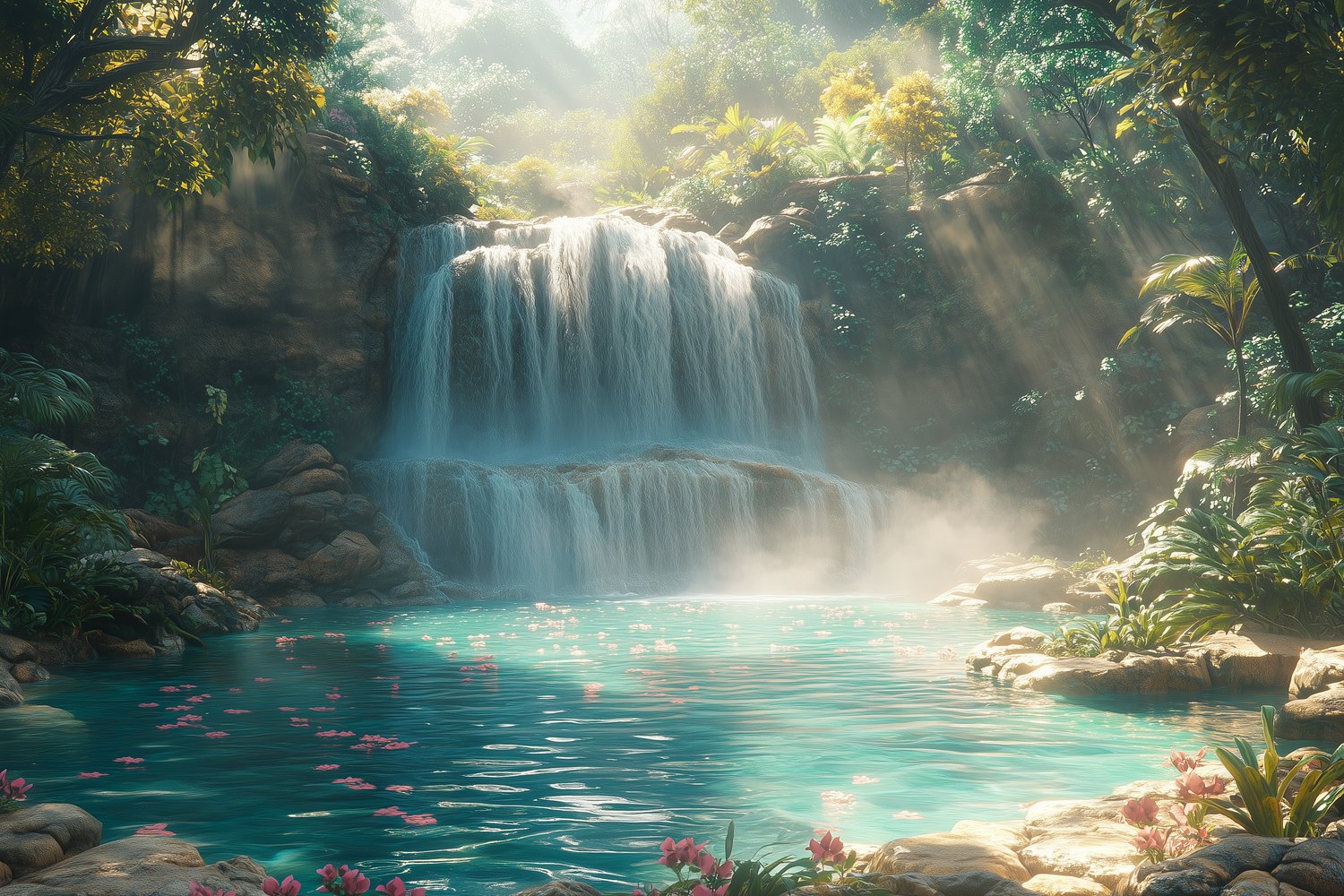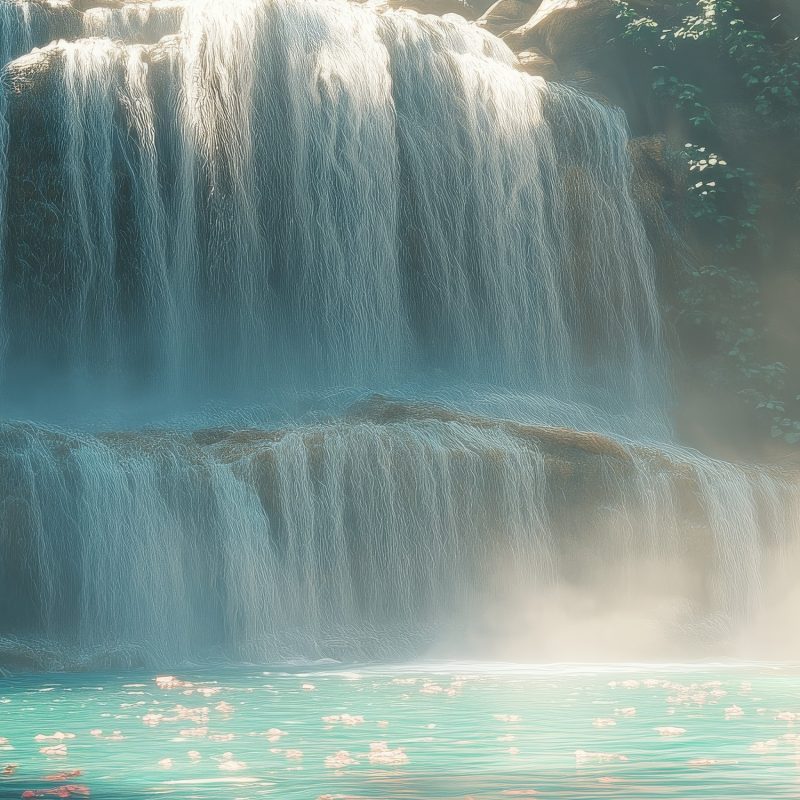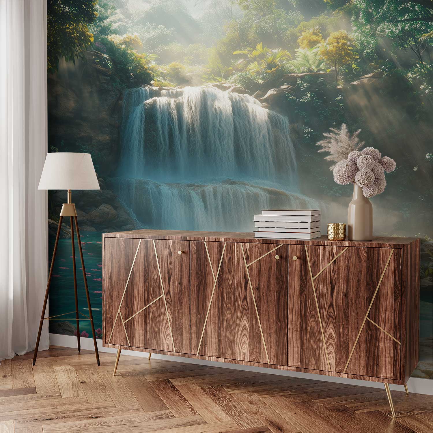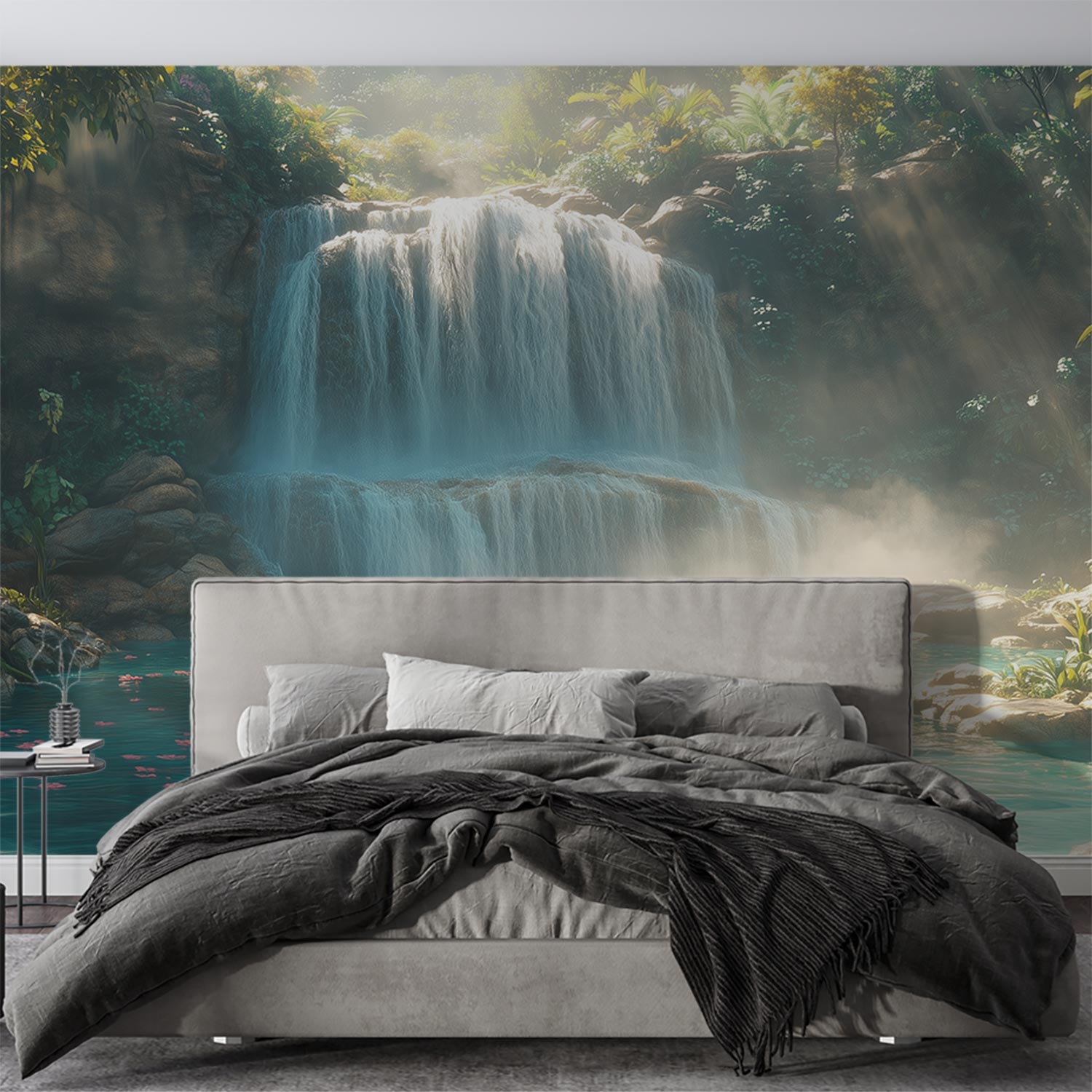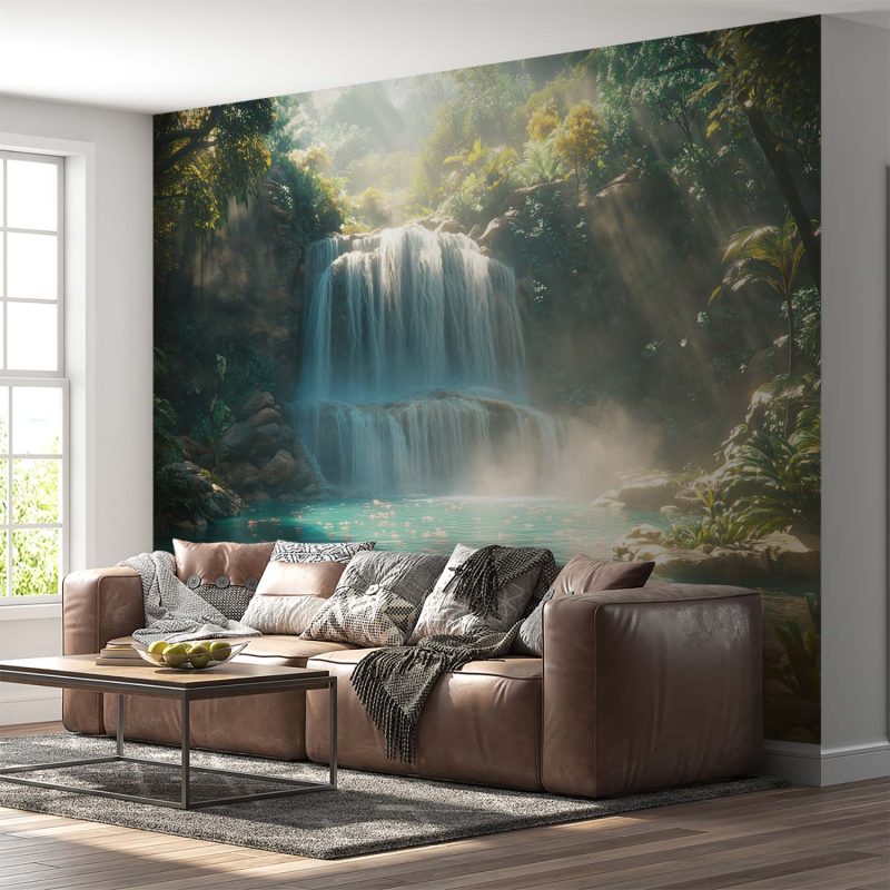 Verfrissend blauw water stort zich over rotsen, omringd door weelderig groen. Een levendig tafereel vol beweging en rust, waar de nevel van de waterval bijna voelbaar wordt. Deze muurdecoratie brengt de sereniteit van de natuur naar binnen, perfect voor een ruimte die verlangt naar harmonie en natuurlijke schoonheid.