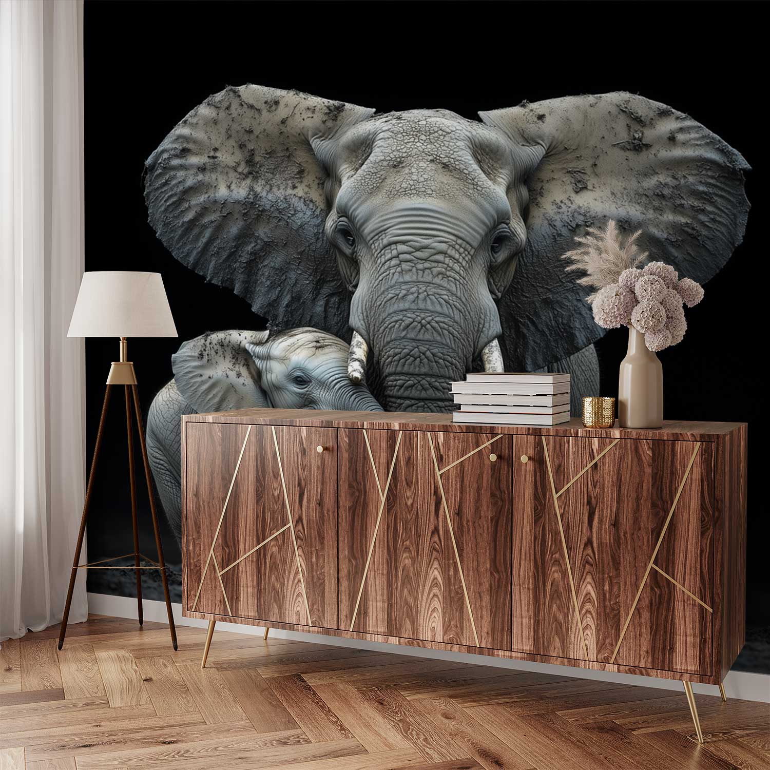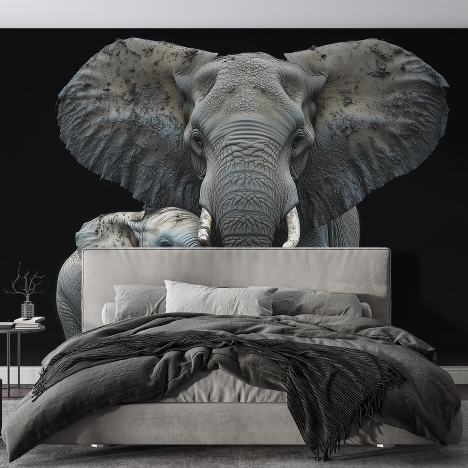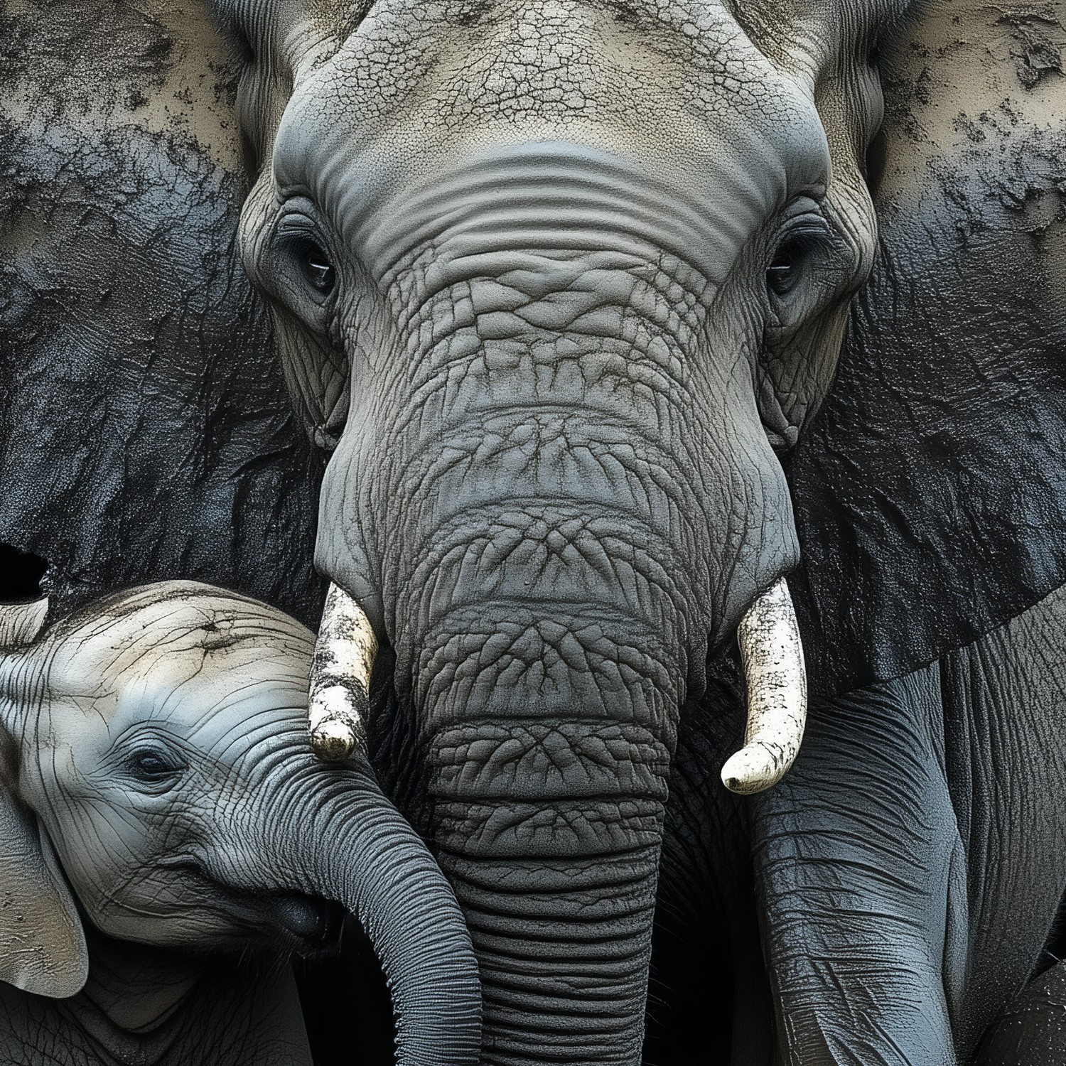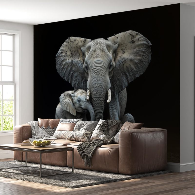 Zachte grijstinten vangen een tedere scène van een olifantenmoeder met haar kleintje in modderig terrein. Hun innige samenzijn straalt rust uit tegen een donkere achtergrond. Dit levendige tafereel brengt warmte en natuurlijke harmonie in je ruimte, ideaal voor een rustgevende sfeer in woonkamer of slaapkamer. De gebalanceerde compositie voegt diepte toe zonder overweldigend te zijn.