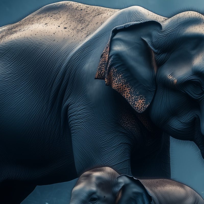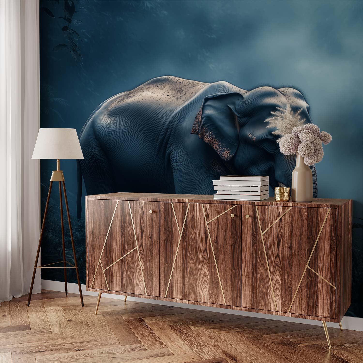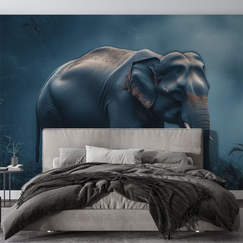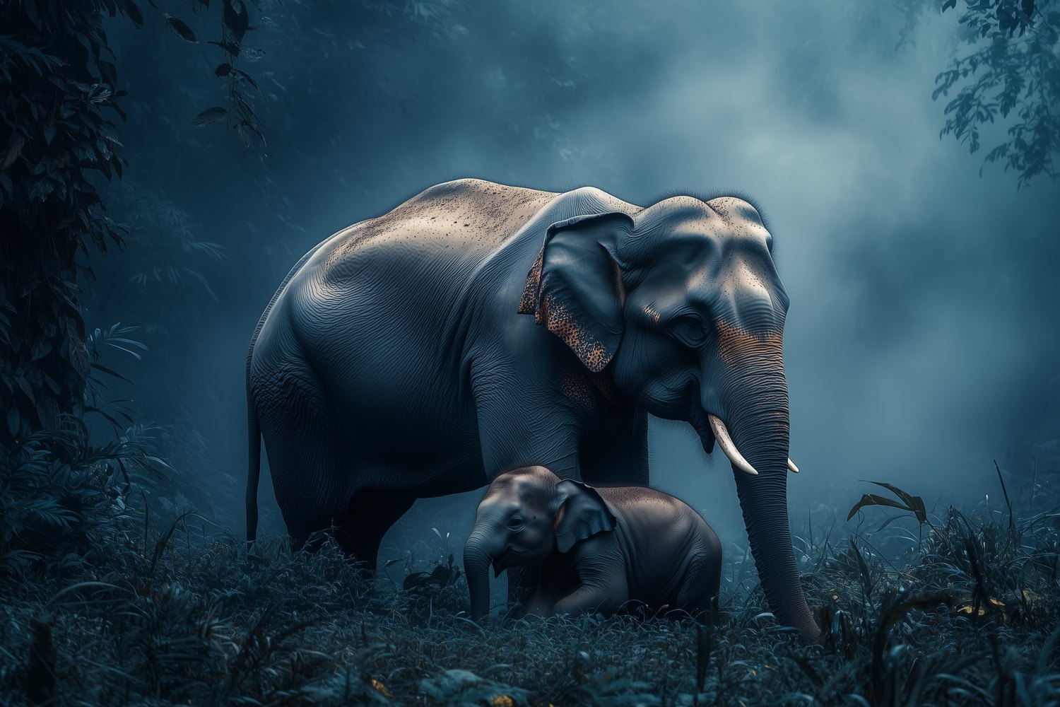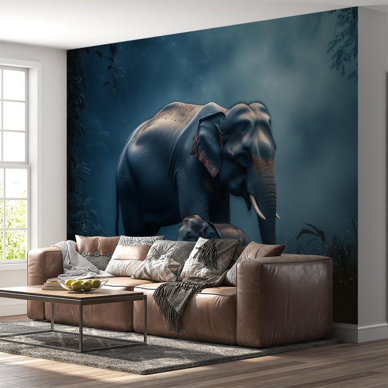 Zacht groen en blauw weven een vredig boslandschap. Een moederolifant waakt teder over haar speelse jong, omringd door weelderig gebladerte. Dit serene tafereel brengt de rust van de natuur in huis en creëert een warme, harmonieuze sfeer in elke ruimte.