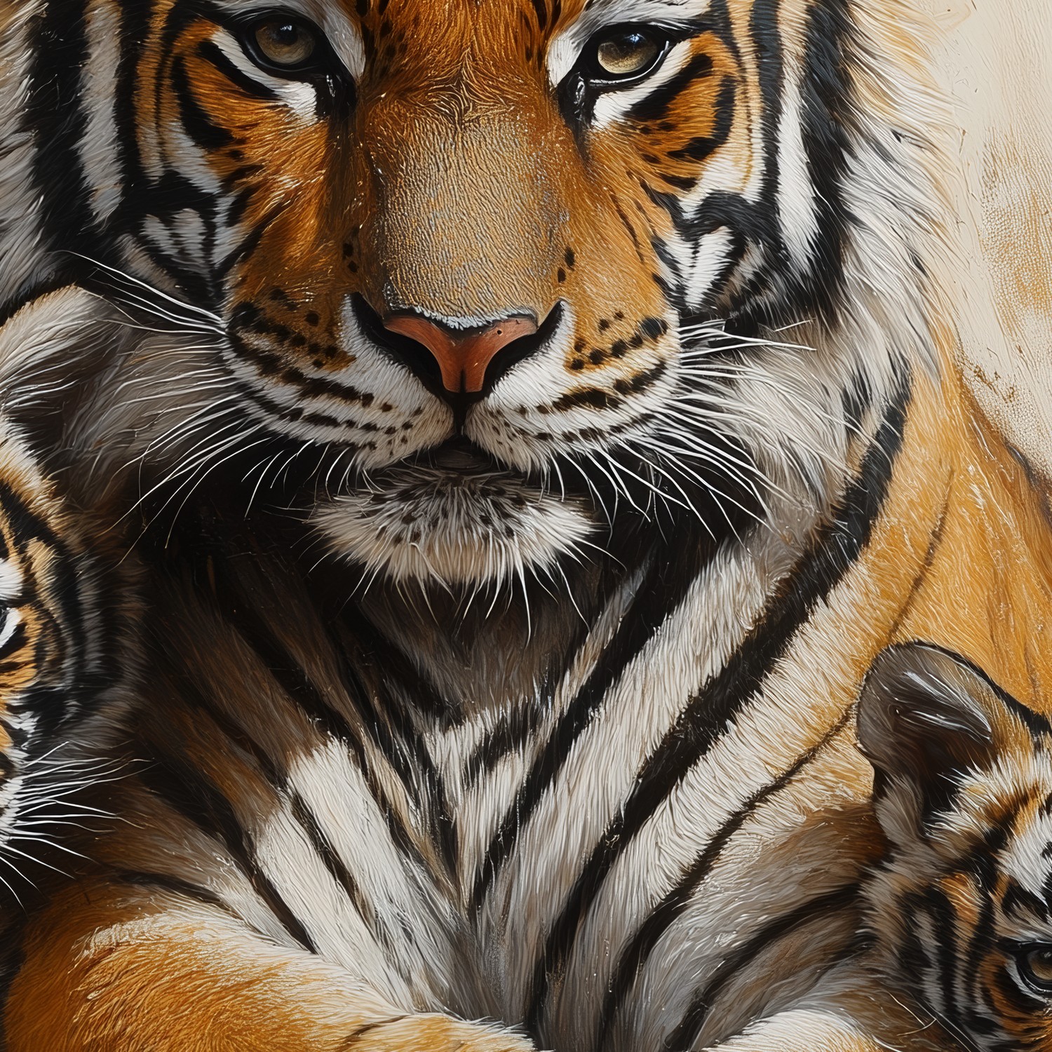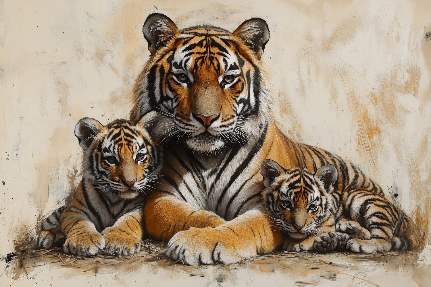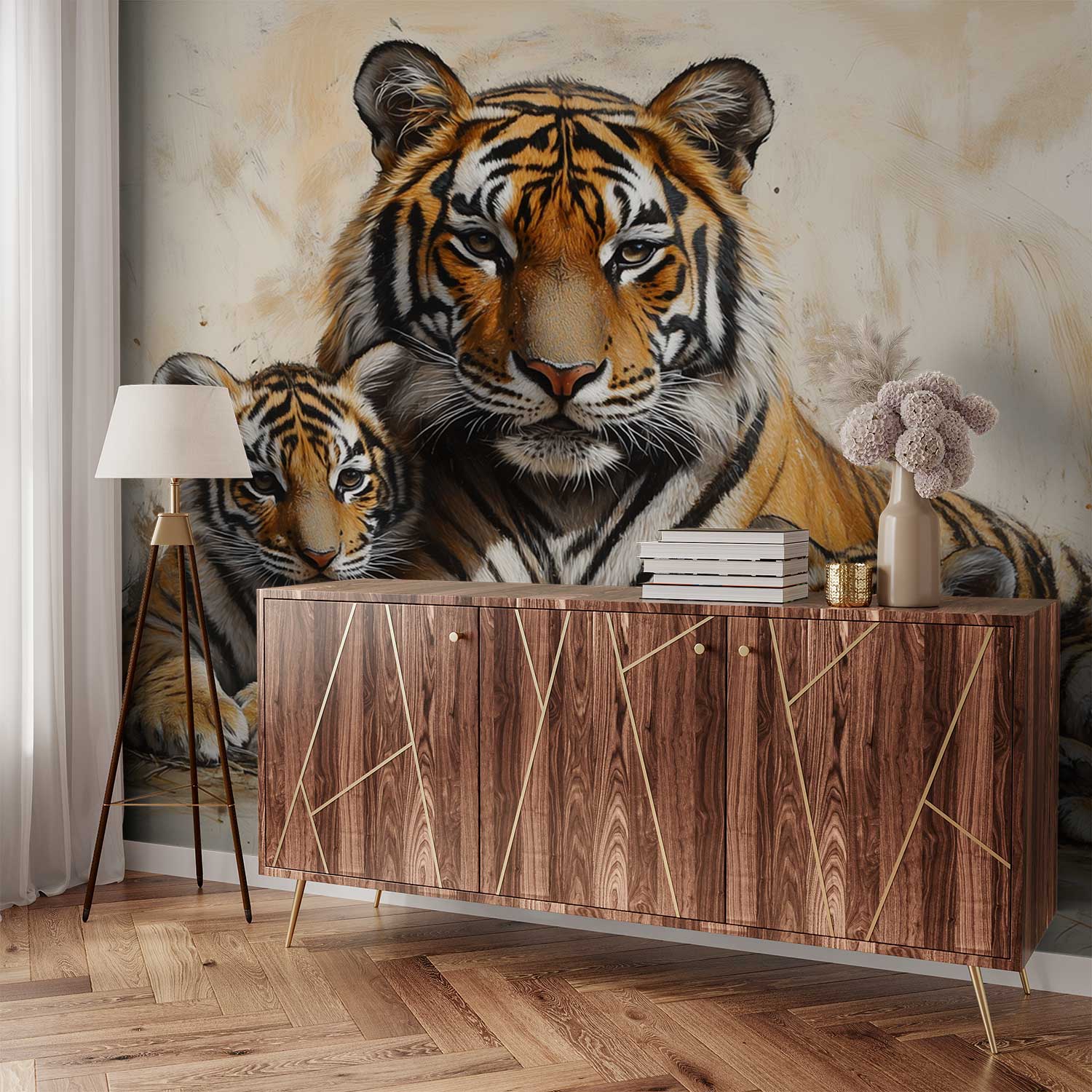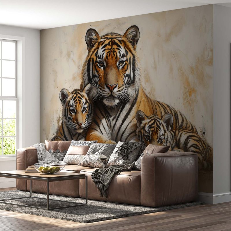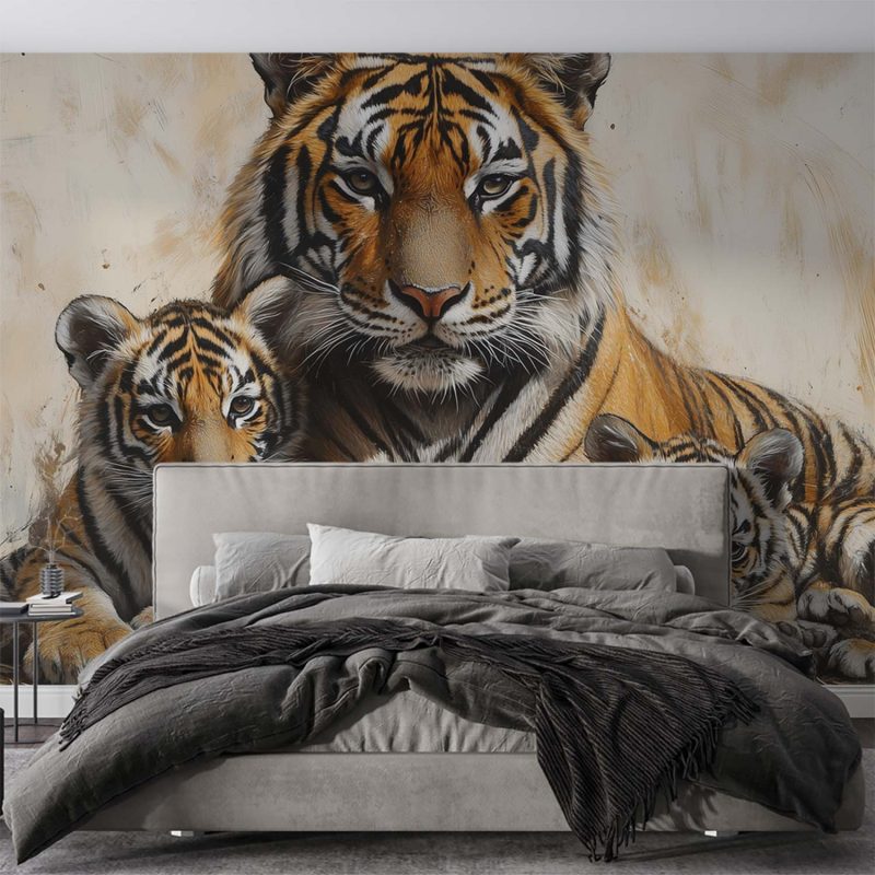 Warme oranje en zwarte tinten vloeien samen in dit tafereel vol tedere bescherming. Een tijgerin kijkt waakzaam over haar speelse welpen, waarbij elke haarstreng tot leven komt. Dit behang brengt de ruige elegantie van de natuur in huis en creëert een aangenaam rustpunt vol emotie in je interieur.