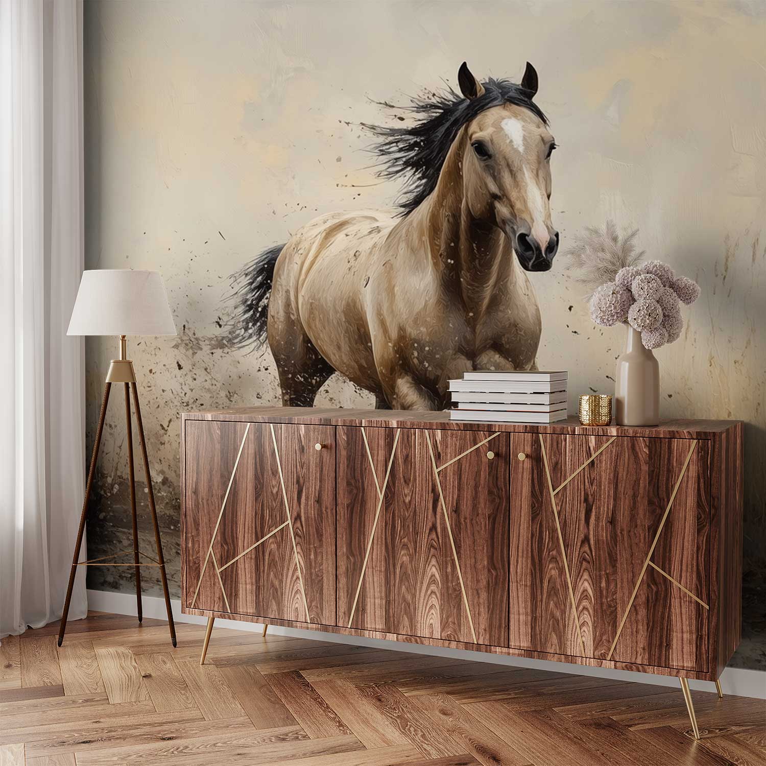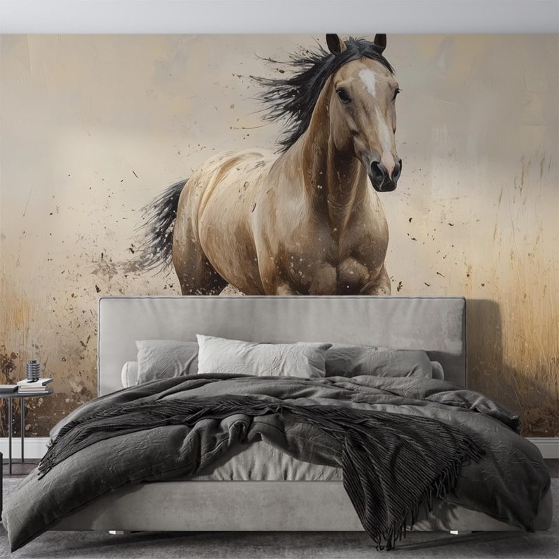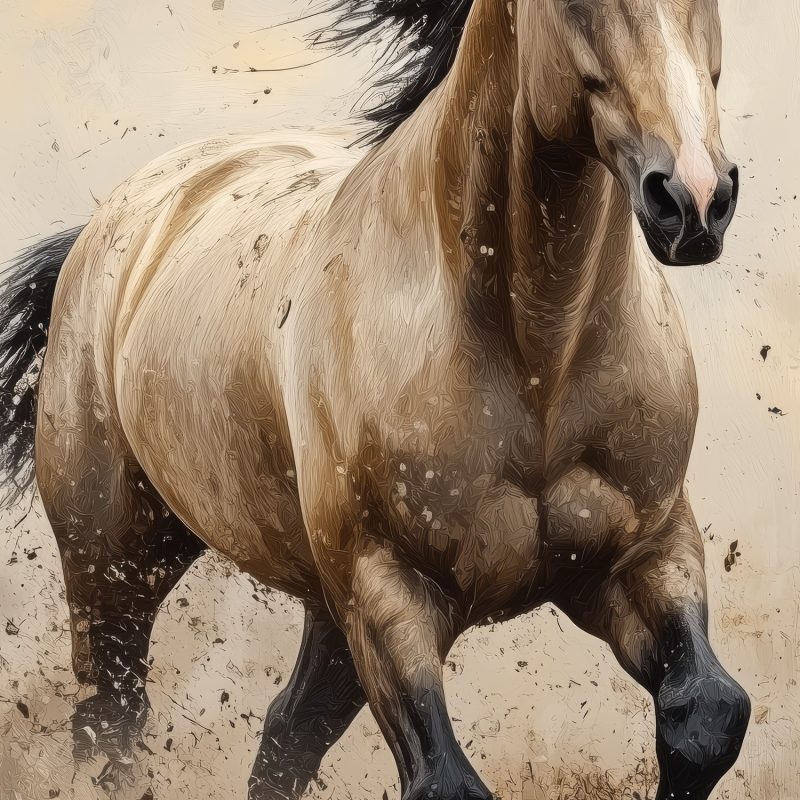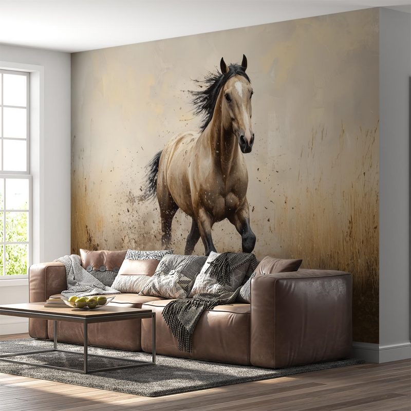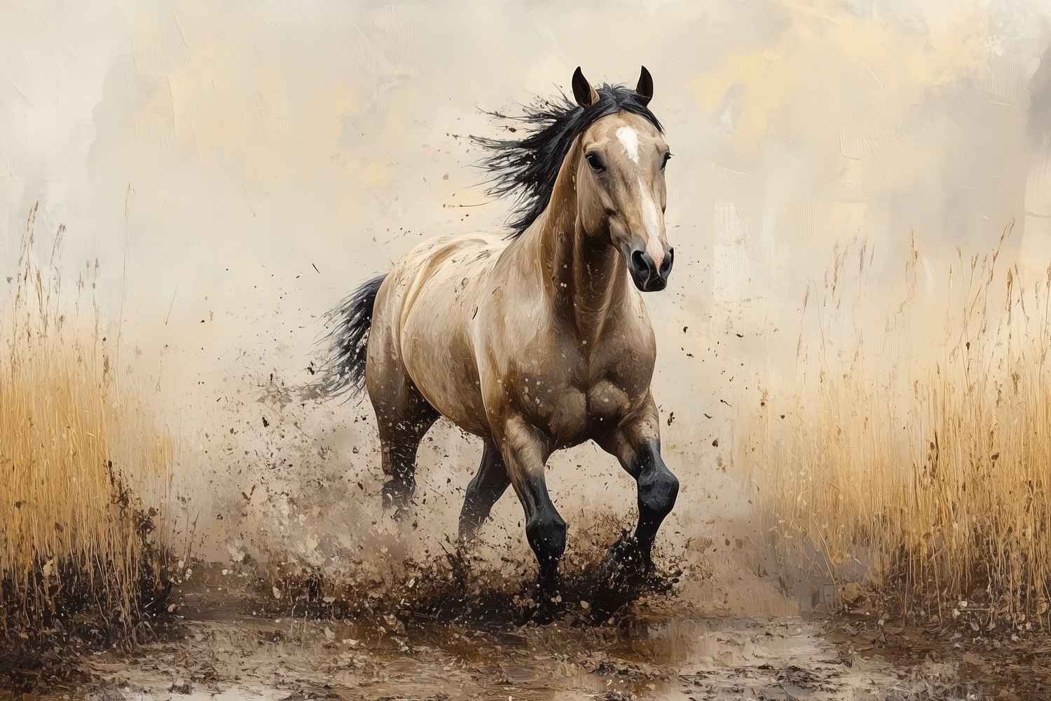 Bruisend van energie galoppeert een krachtig paard door modderige velden. Aardetinten van bruin en grijs vangen de wilde schoonheid van zijn beweging. Dit realistische tafereel brengt dynamische natuur in huis. Perfect voor wie verlangt naar rauwe elegantie en een statement vol levendige energie. Zijn meeslepende aanwezigheid transformeert elke ruimte tot een krachtige, organische omgeving.