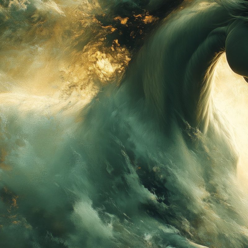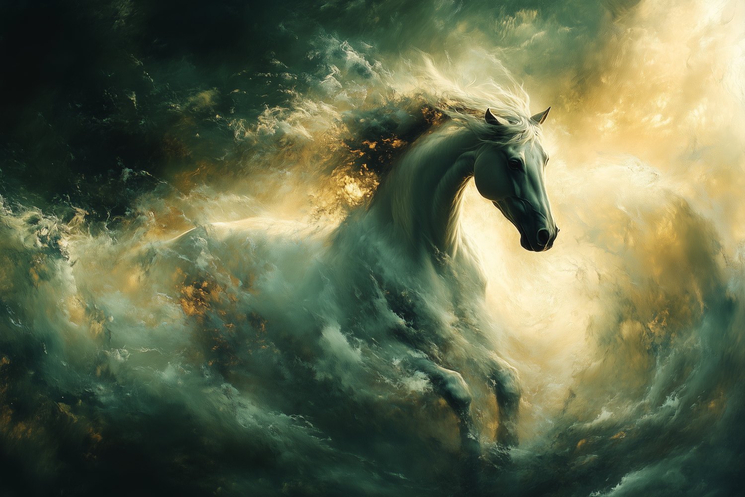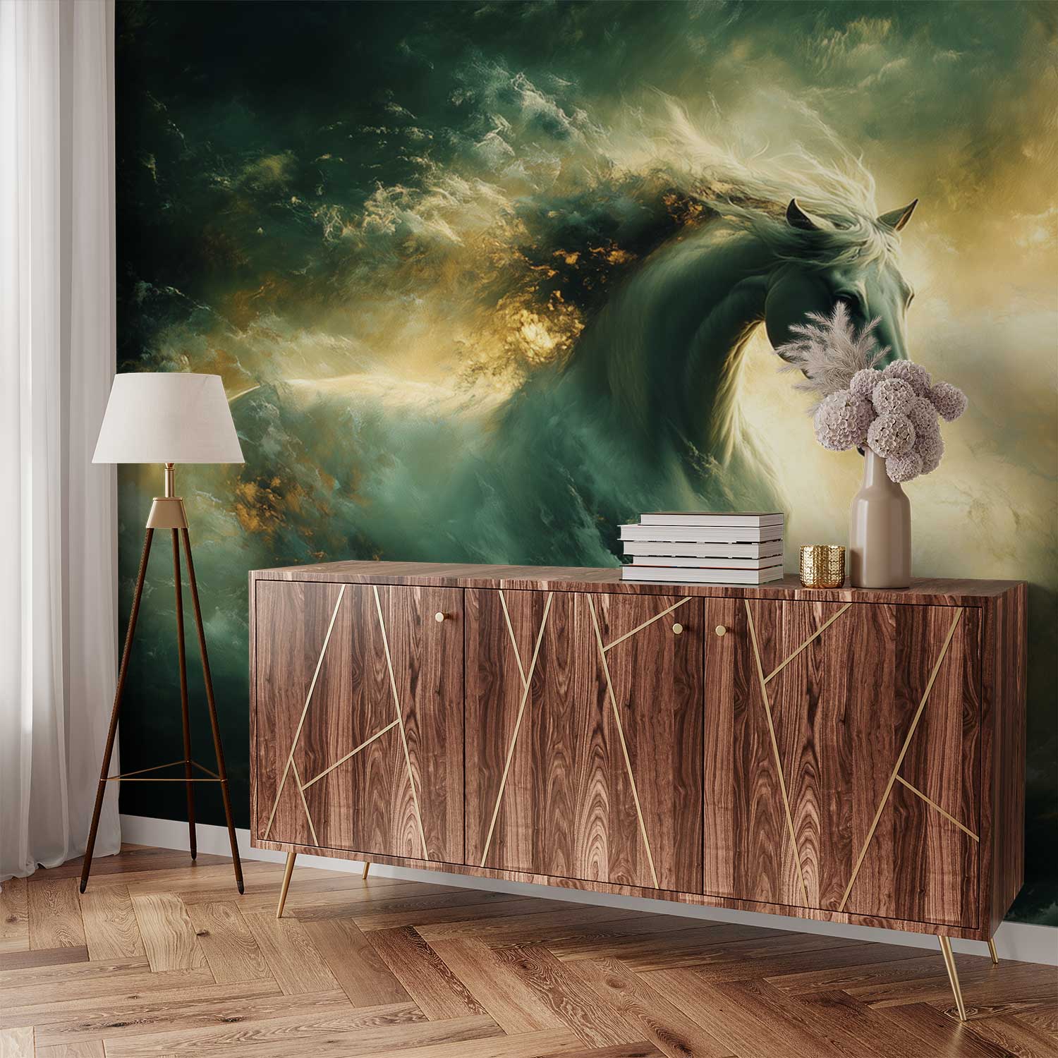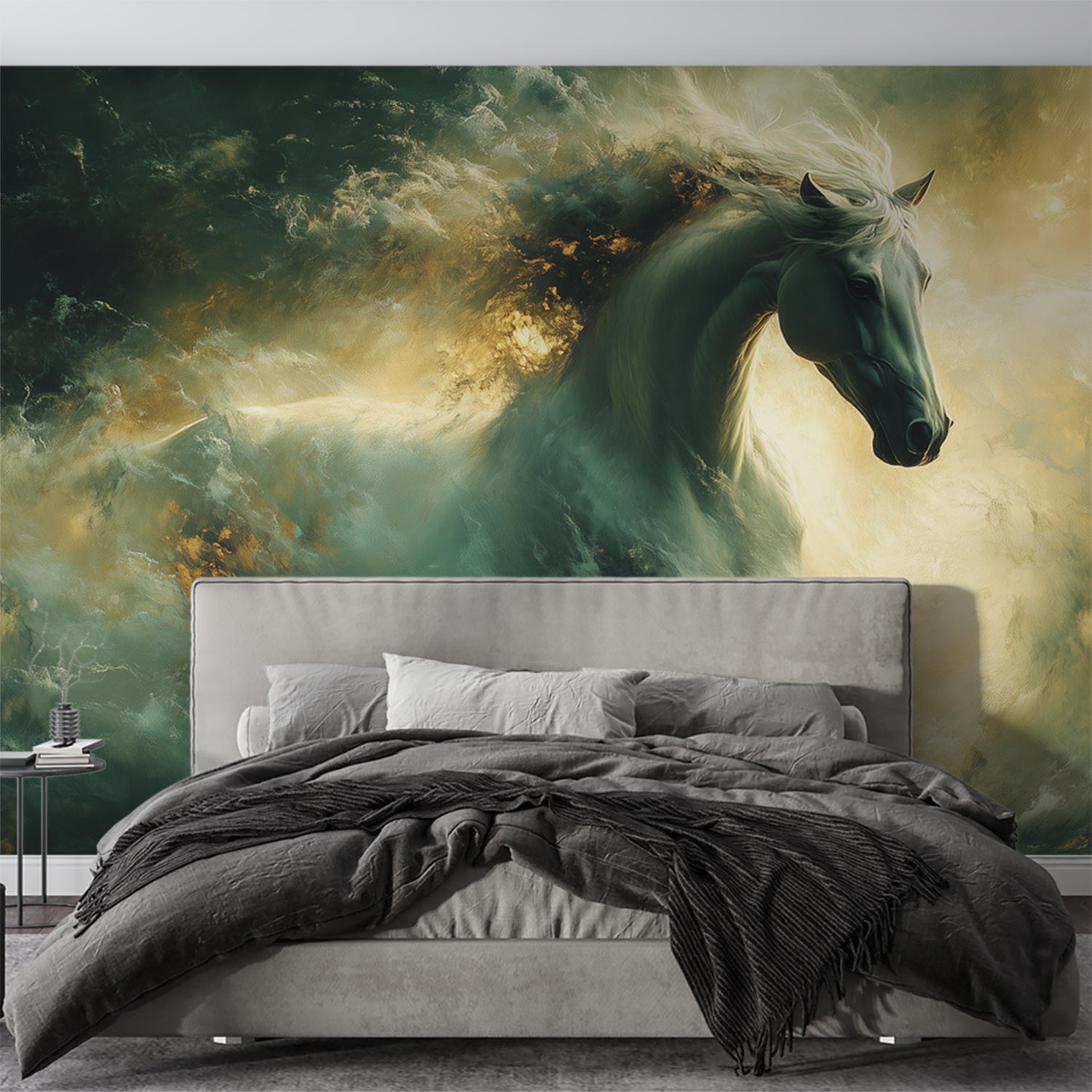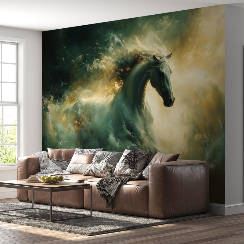Bewegende groene en gele nevels omarmen een krachtig wit paard in volle galop. Zijn dynamische energie straalt vrijheid uit terwijl de mistwerveling een betoverende sfeer creëert. Dit adembenemende tafereel brengt magie en beweging in je ruimte, perfect voor een statementmuur die zowel kracht als elegantie uitstraalt.