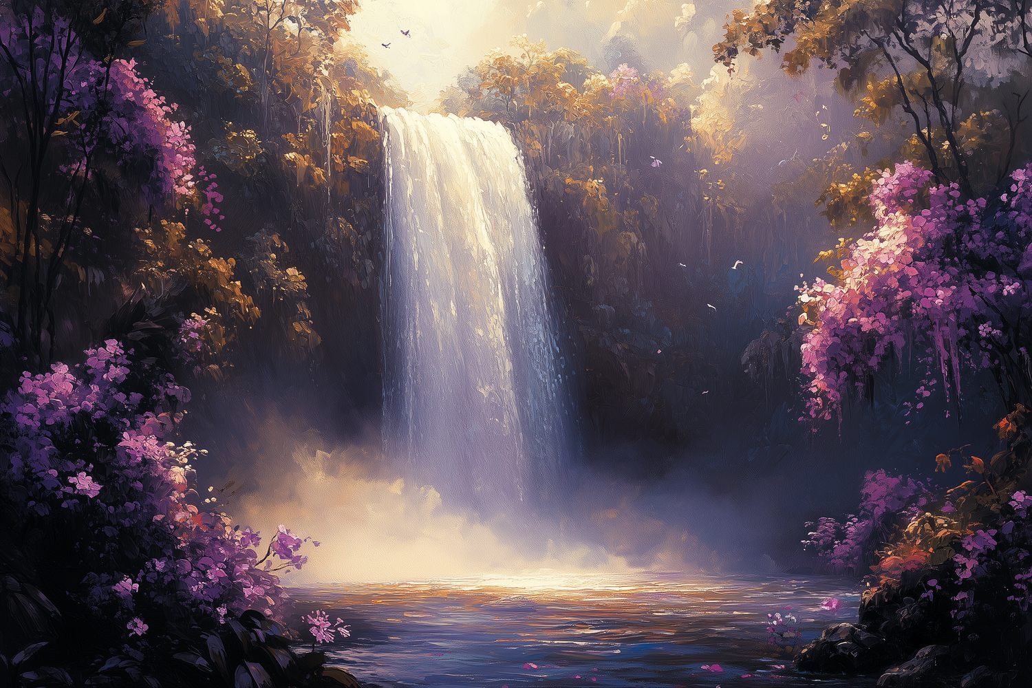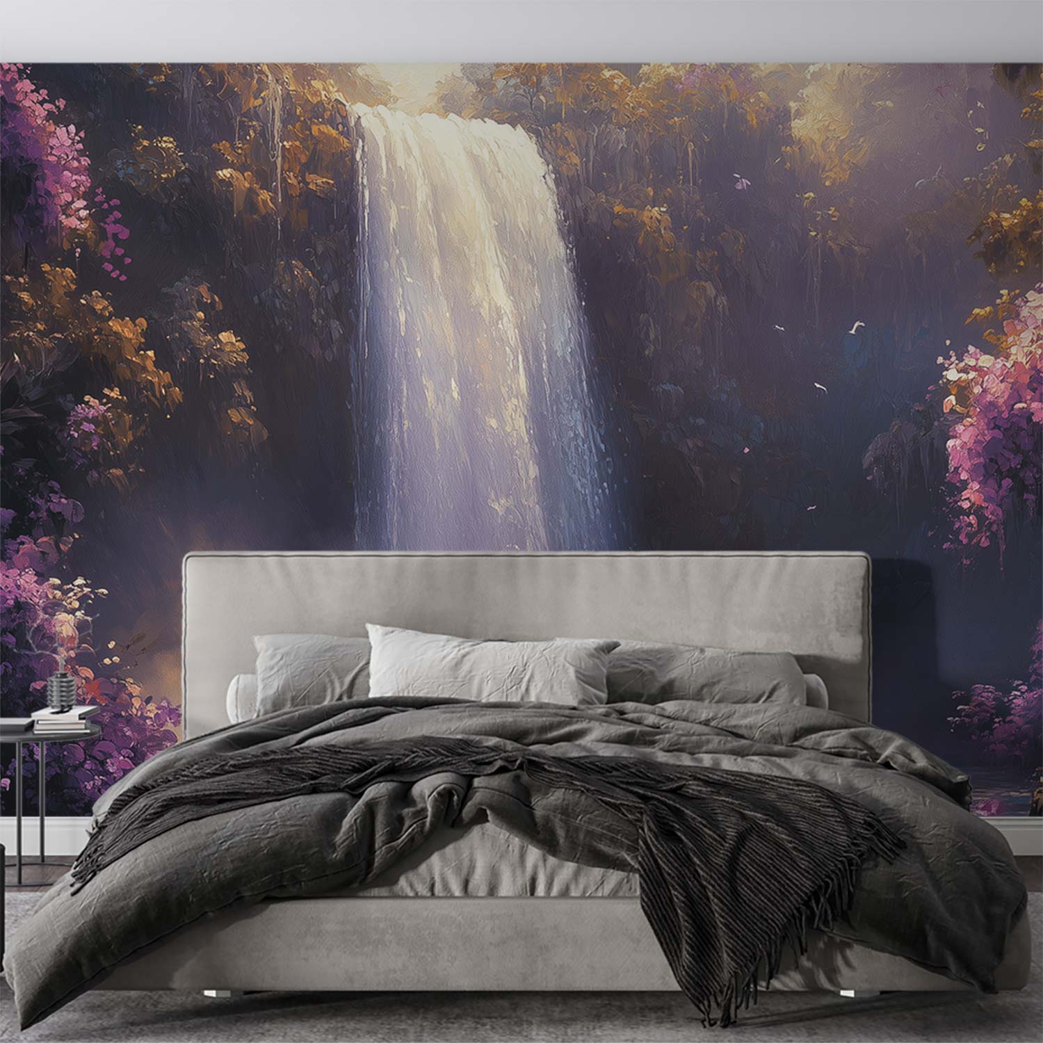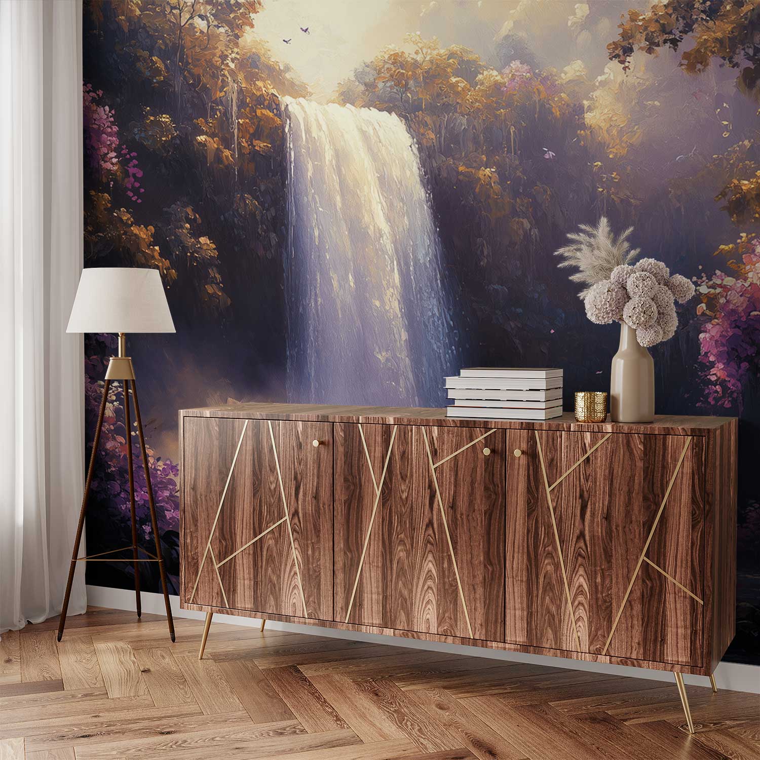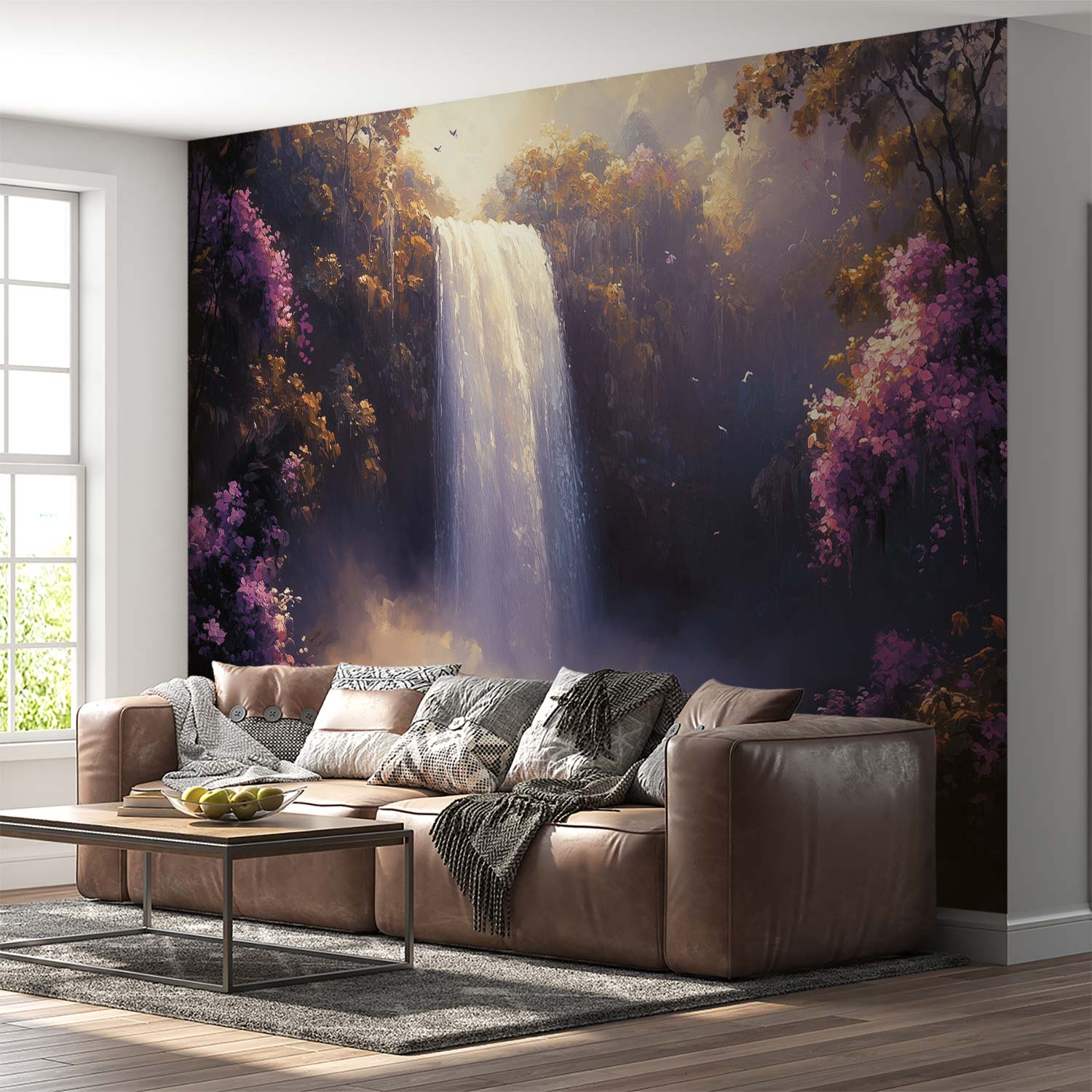 Verfrissende watervalstromen dansen door een weelderig bos, omhuld in een mysterieuze nevel. Levendige tinten groen, blauw en paas creëren een harmonieus spektakel dat de ruimte transformeert tot een oase van rust. Dit krachtige natuurtafereel brengt sereniteit en diepte in je interieur, waardoor elke kamer ademt met kalmerende energie en natuurlijke schoonheid.