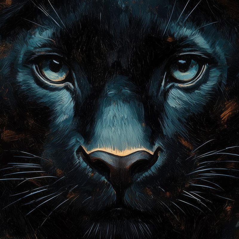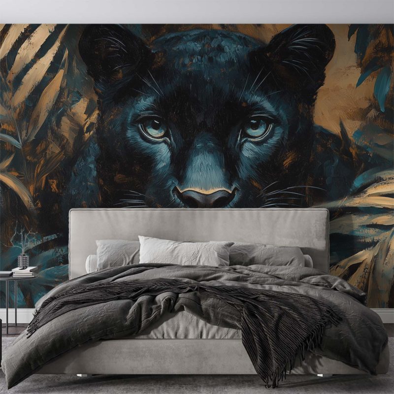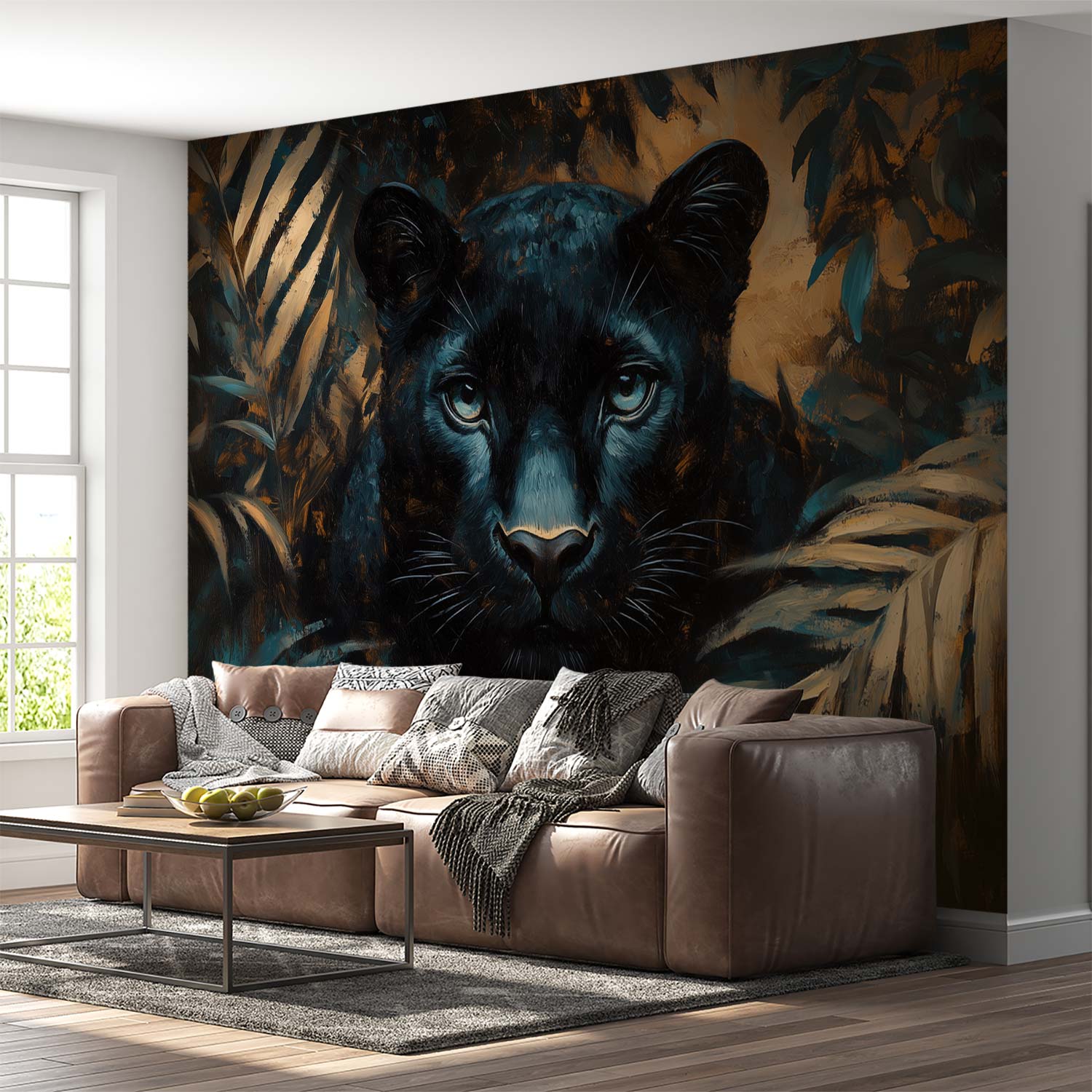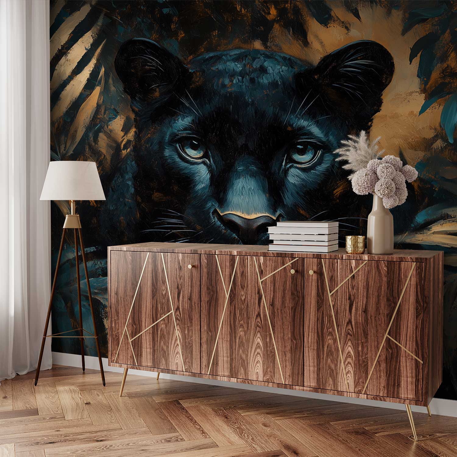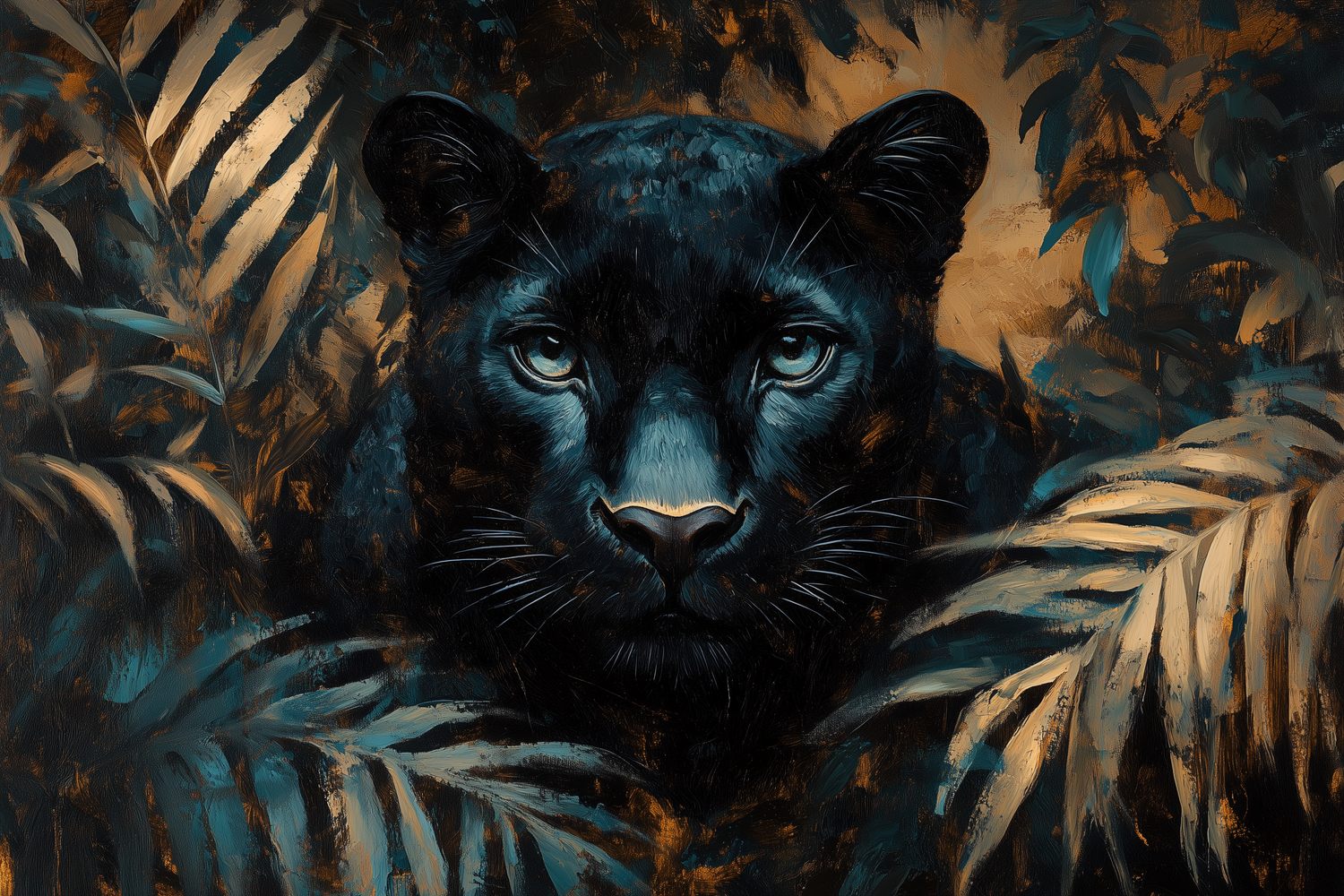 Oogverblindend blauw en groen bladwerk omkranst een zwarte panter met doordringende blik. Zijn donkere silhouet contrasteert prachtig met het levendige tropische gebladerte, vol diepte en intensiteit. Dit krachtige tafereel brengt de wilde schoonheid van de jungle in huis, ideaal als gedurig accent in een modern interieur waar natuur en mysterie samenkomen.