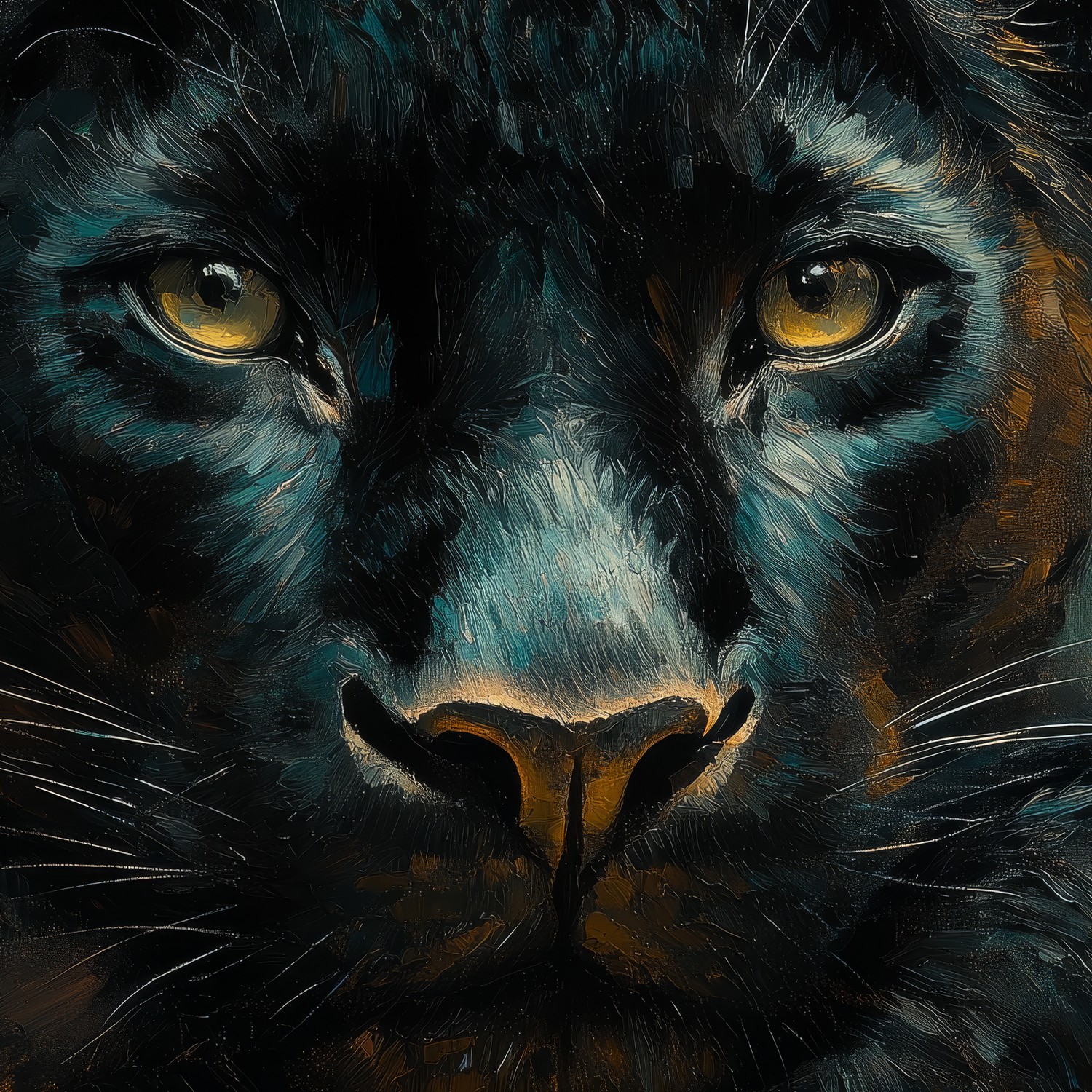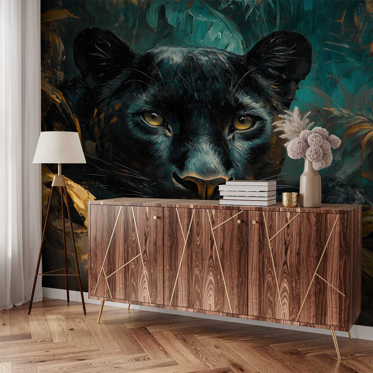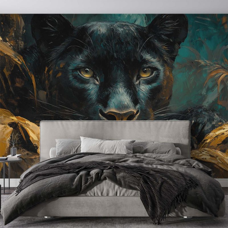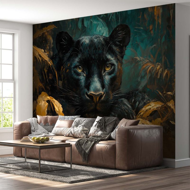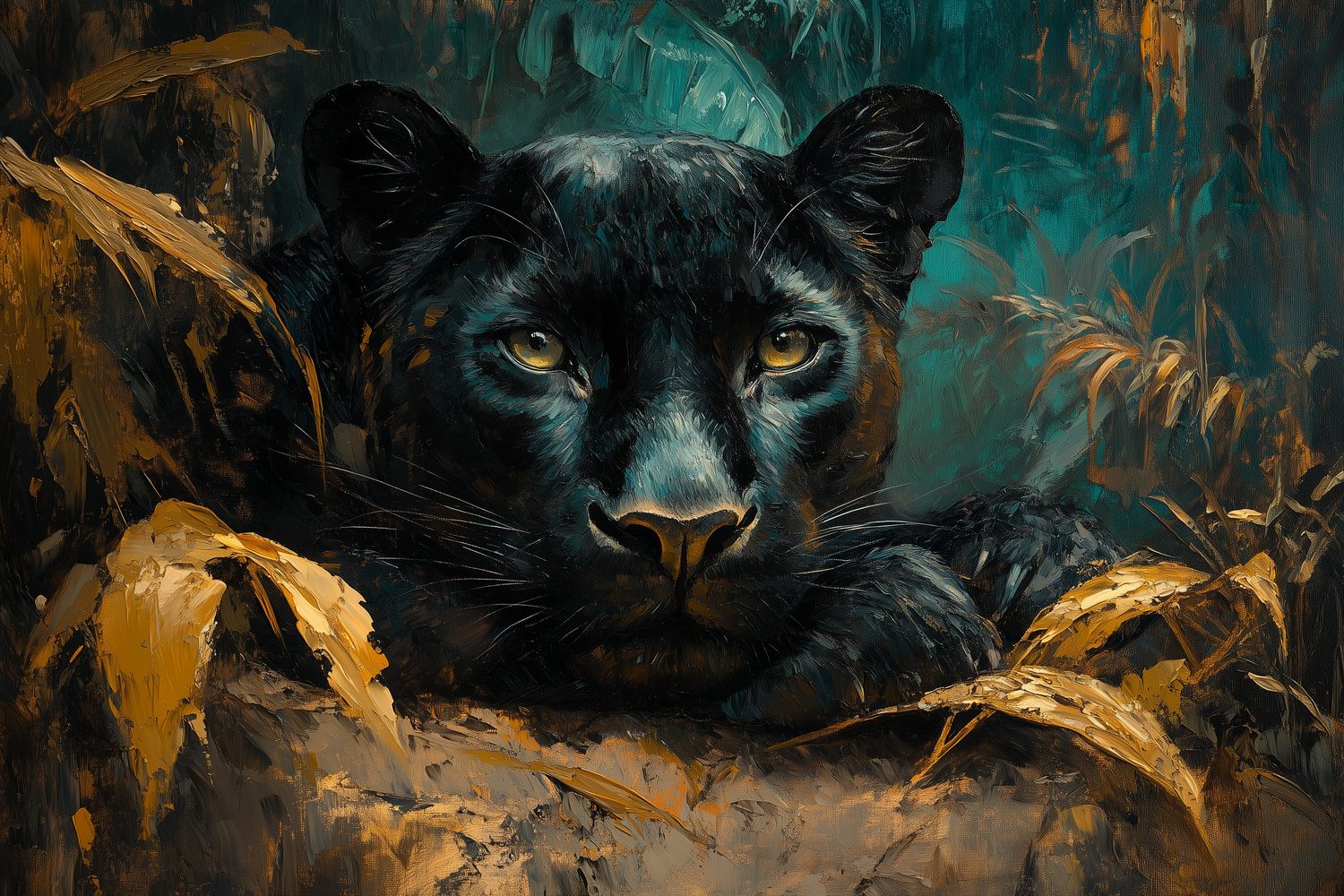 Zachte penseelstreken wekken de mysterieuze schoonheid van een luierende panter tot leven. Zijn doordringende ogen kijken vanuit een weelderige jungle in diepe aardetinten, omhuld door groene en bruine accenten. Dit krachtige, rustige tafereel brengt een wilde elegantie in je ruimte, ideaal als statementwand die zowel avontuur als sereniteit uitstraalt.