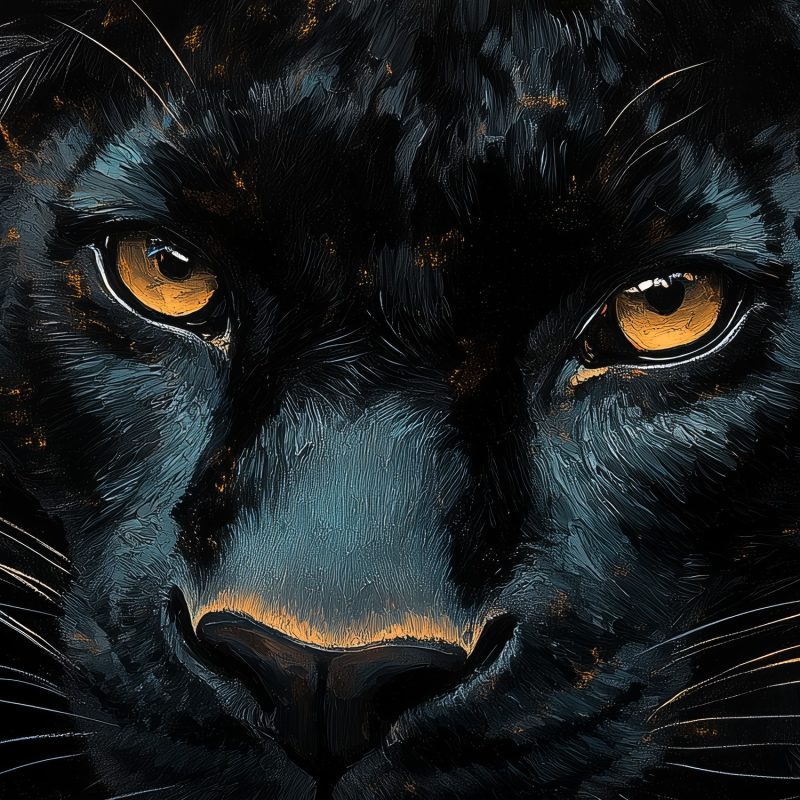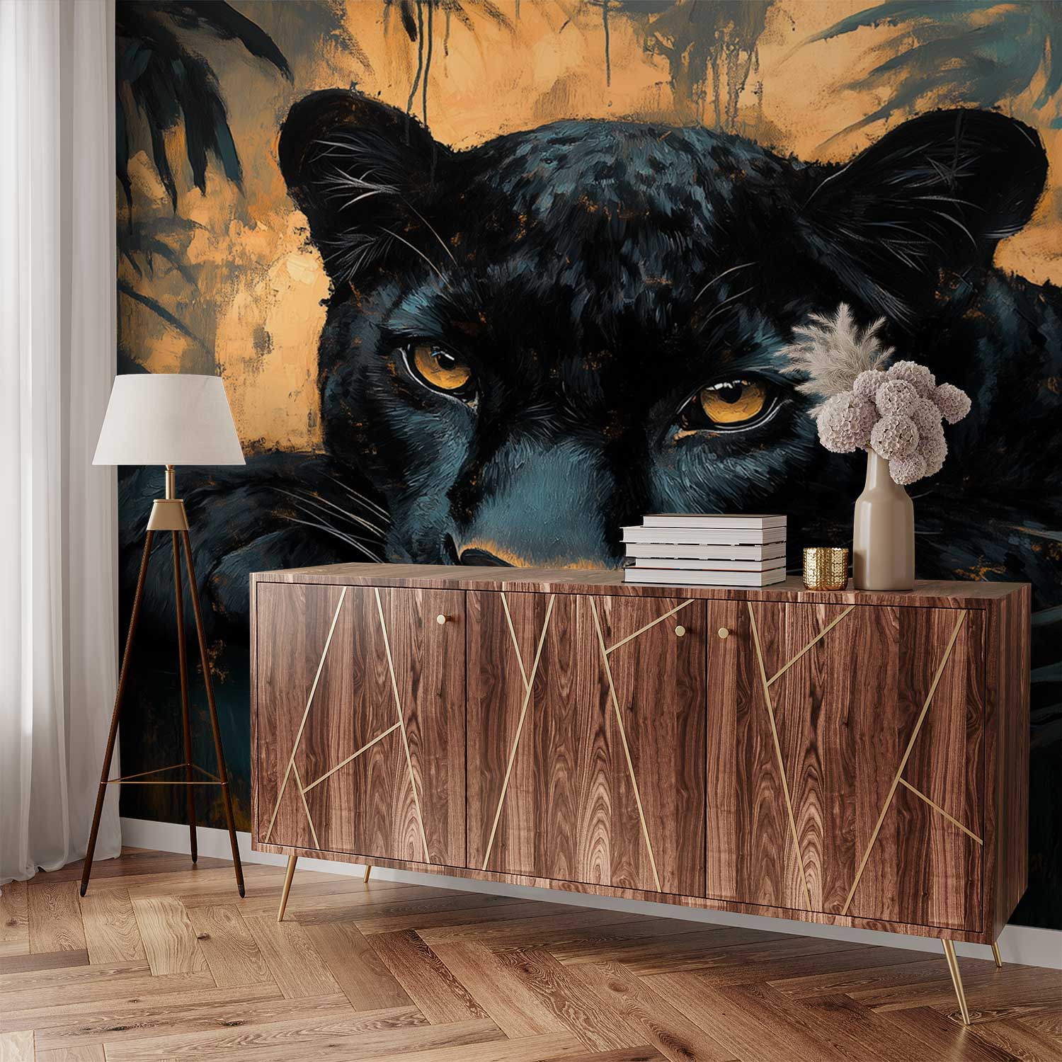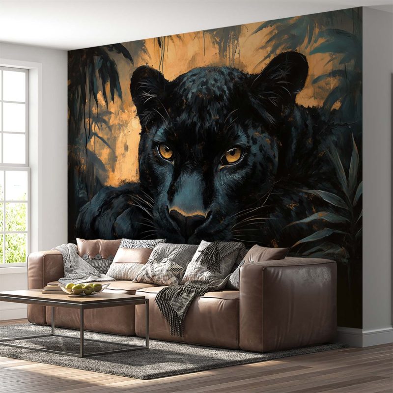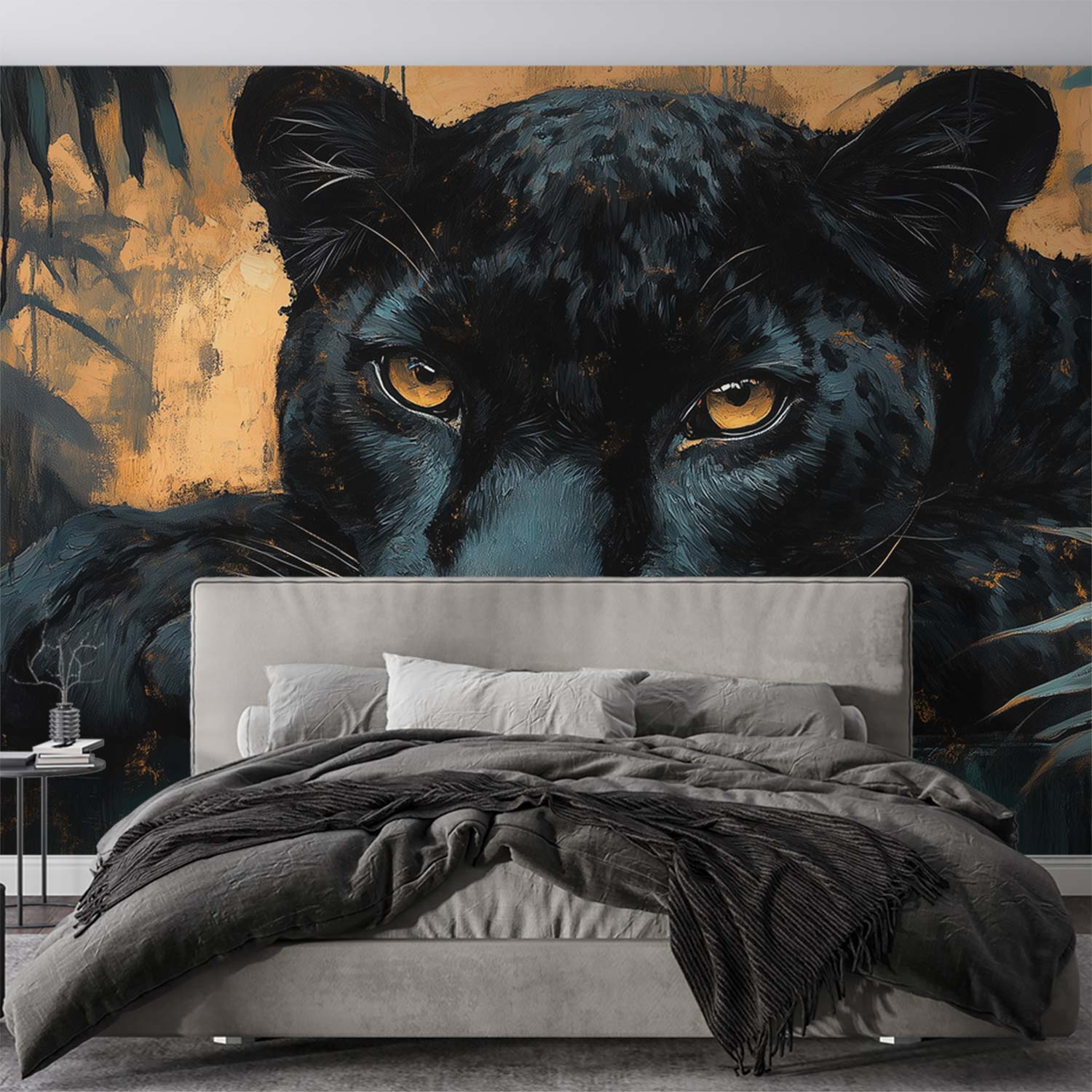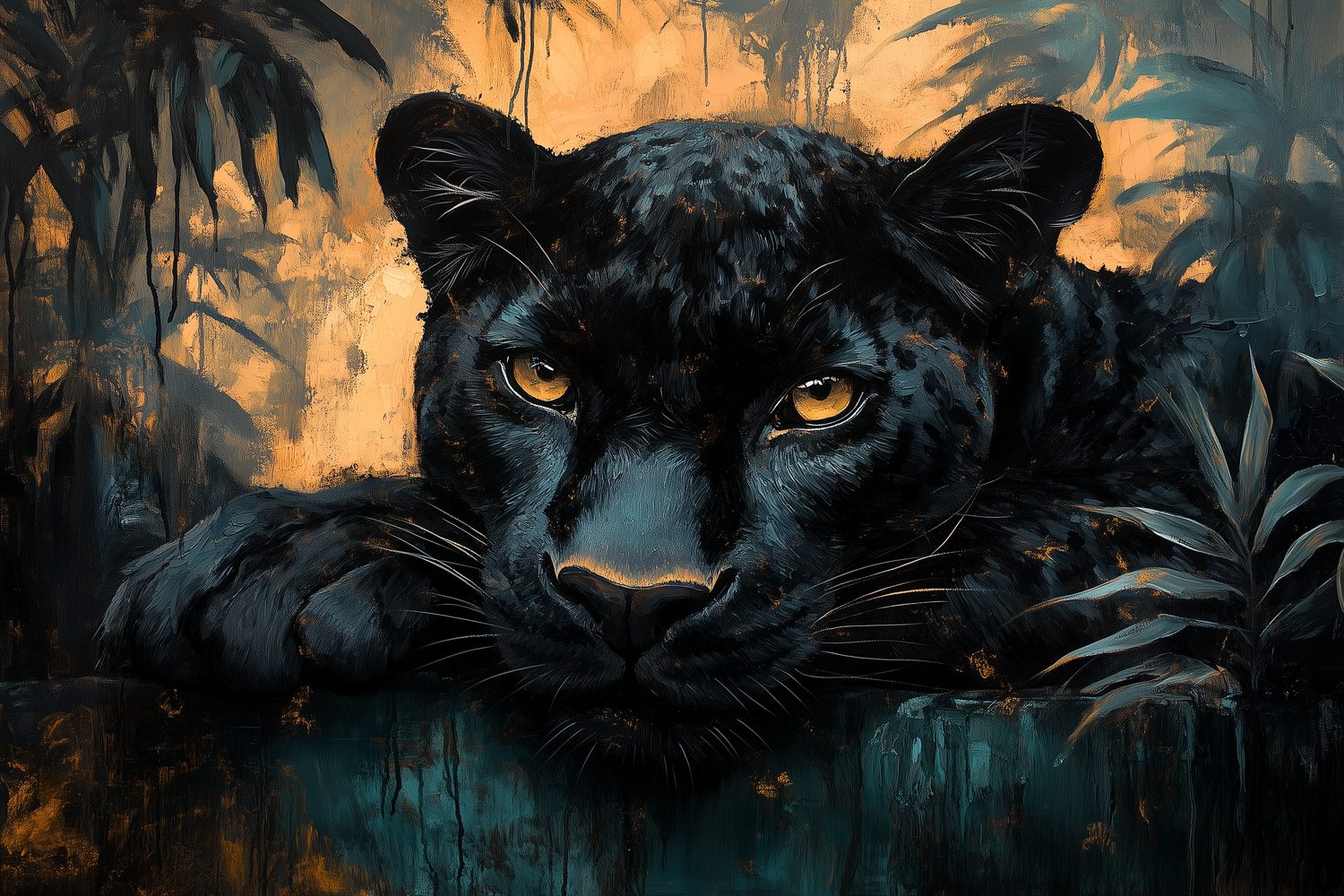Verstilde wildernis ontwaakt in diepe zwarte en groene tinten, waar een luipaard door dicht gebladerte tuurt met fonkelende ogen. Zijn serene kracht en het weelderige oerwoud creëren een hypnotiserende sfeer van mysterie. Dit levendige kunstwerk brengt een magische natuurlijke energie in je ruimte, perfect voor een statement muur die rust en avontuur combineert.