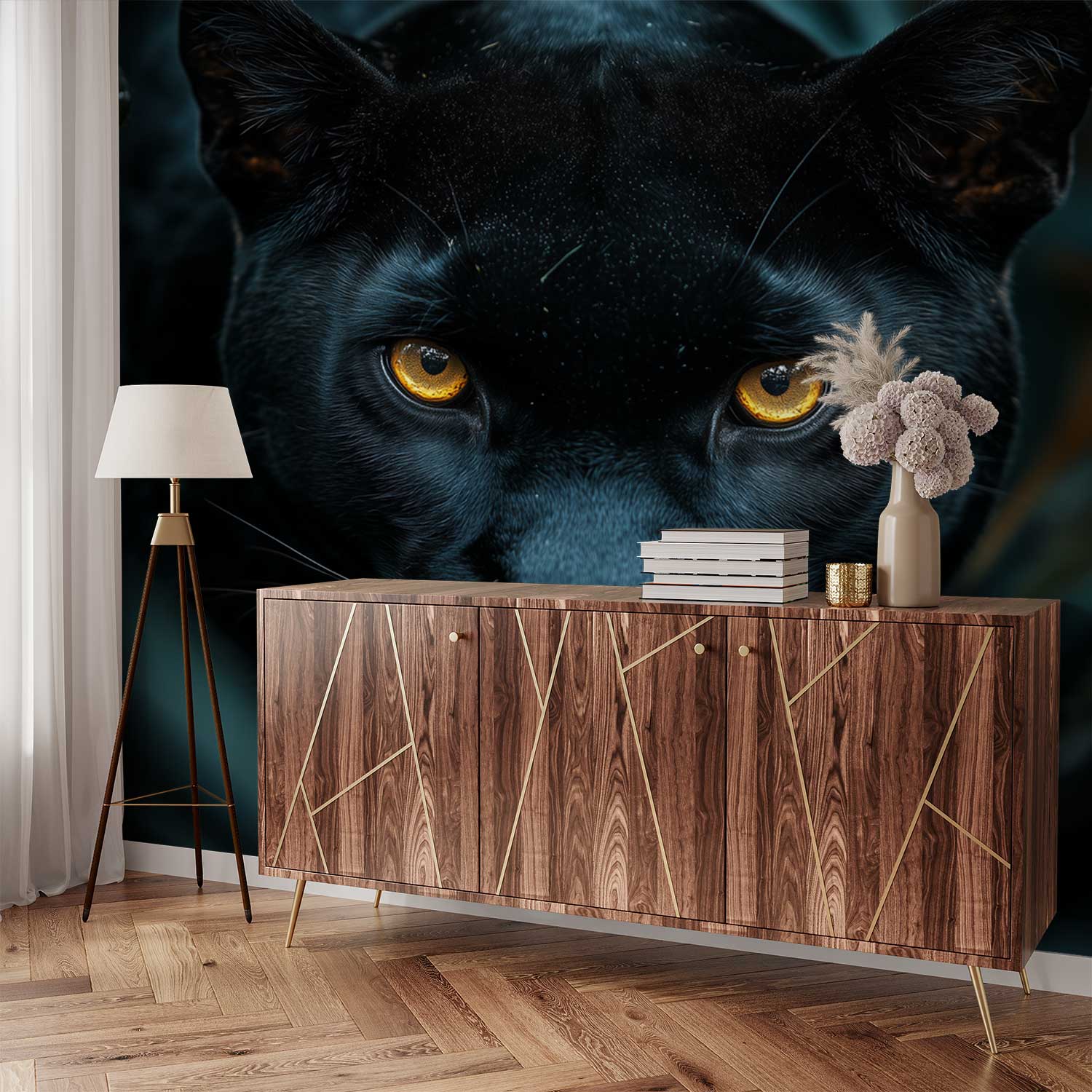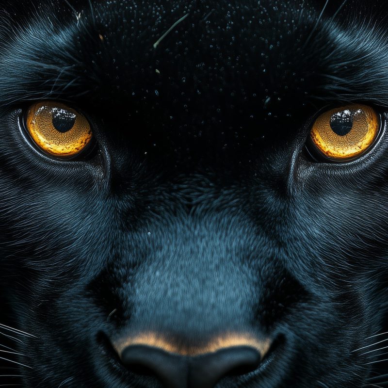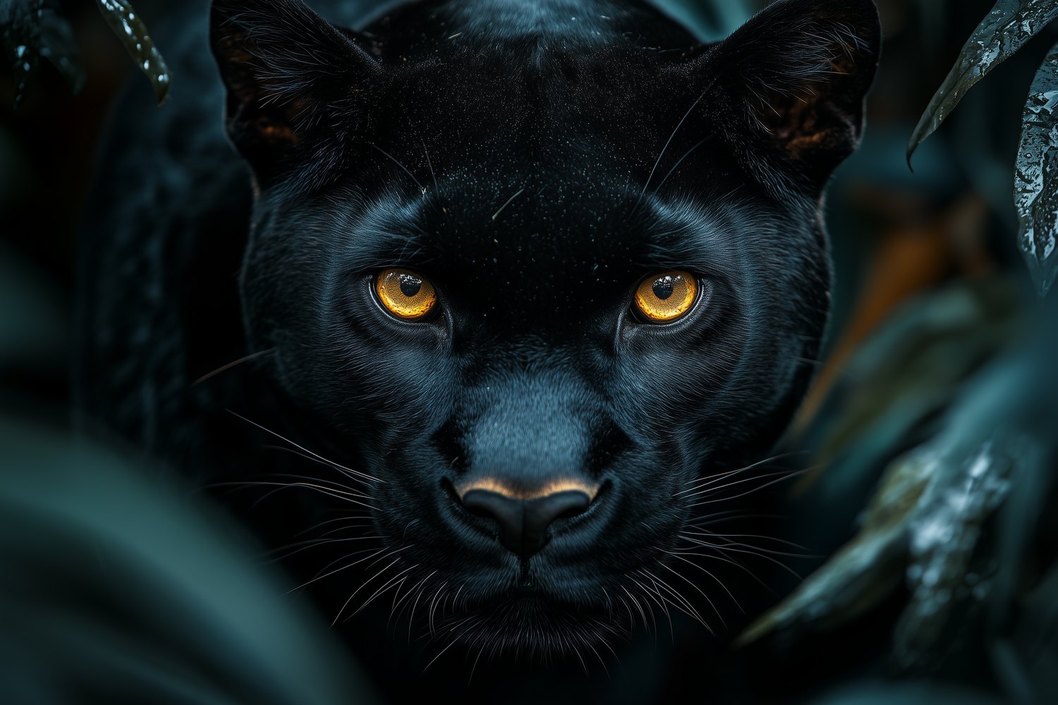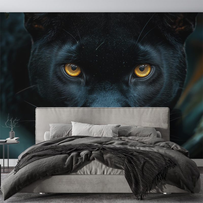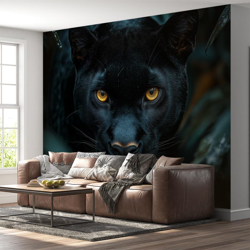 Gouden ogen doordringen het groen, een mysterieus blik vol wilde schoonheid. Deze zwarte panter verschijnt levendig tussen weelderig gebladerte, zijn intense aanwezigheid omgeven door diepe tinten. Rust en kracht vloeien samen in dit adembenemende tafereel. Brengt een vleugje exotische sereniteit en natuurlijke elegantie in je ruimte, ideaal voor een statement muur die zowel intrigeert als kalmeert.