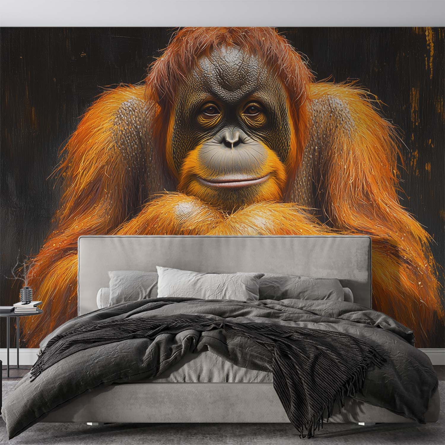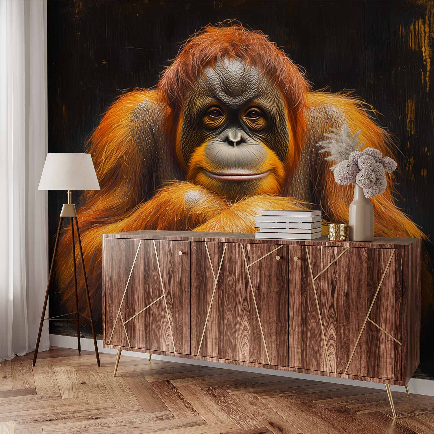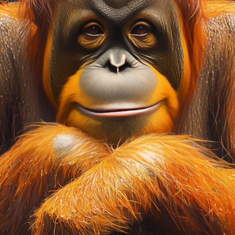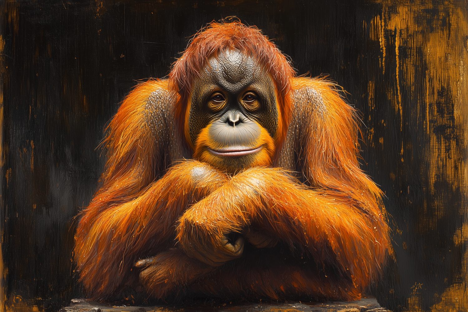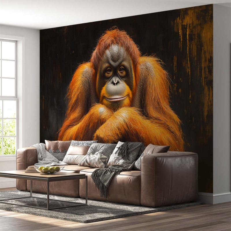 Ontspannen in het donker kruist een orang-oetan zijn armen, zijn levendige oranje vacht straalt rust uit. Deze serene blikvanger brengt harmonie en natuurlijke elegantie in je interieur, perfect voor een statement muur die zowel kalmte als karakter uitstraalt.