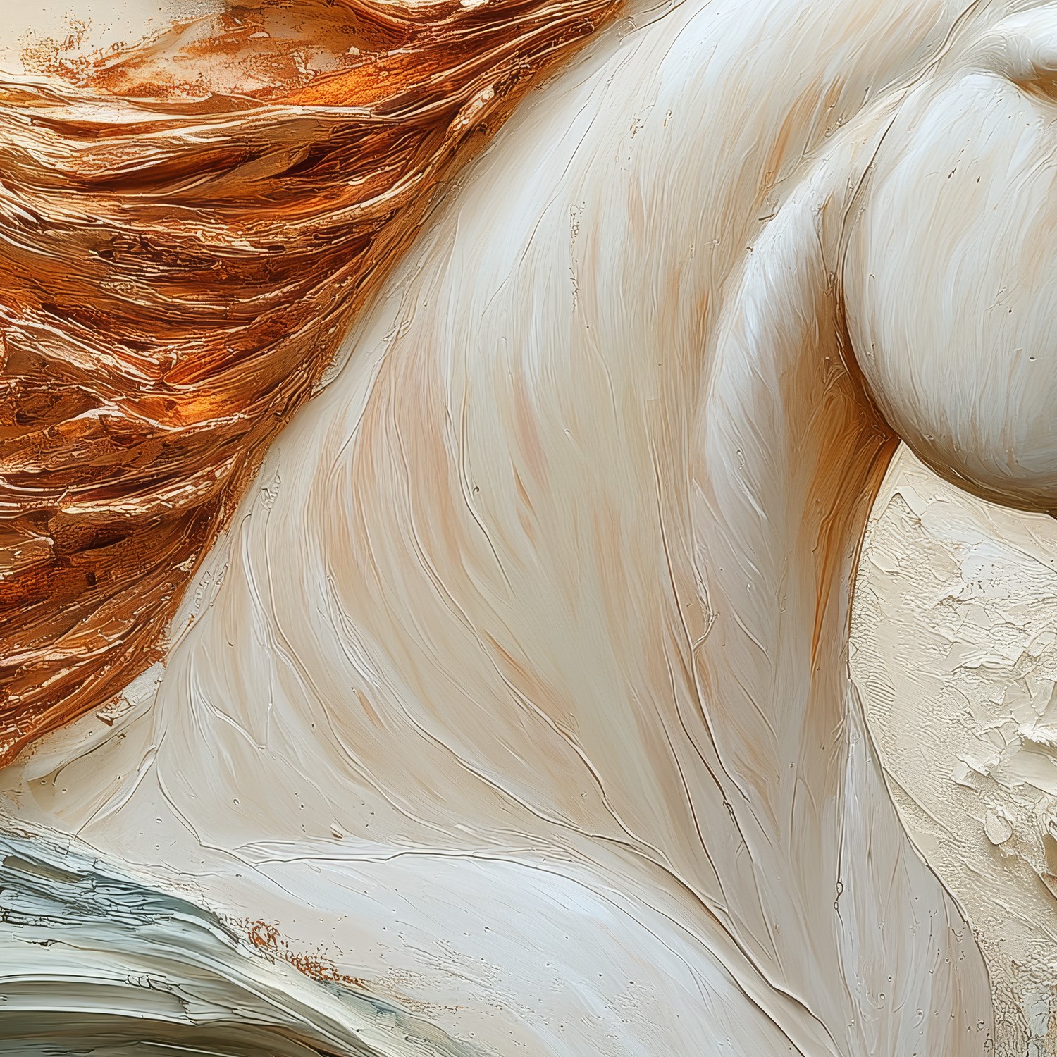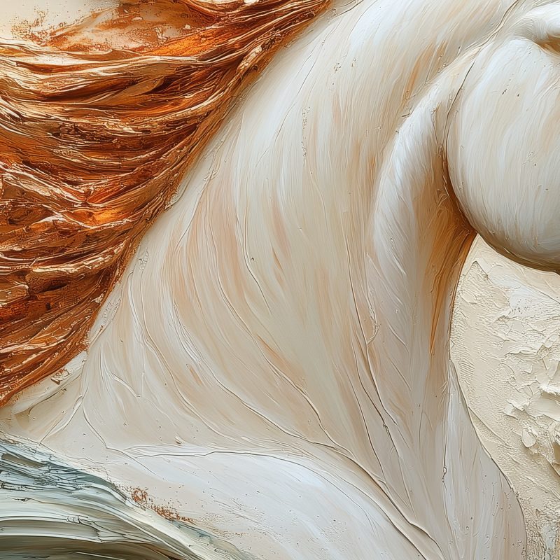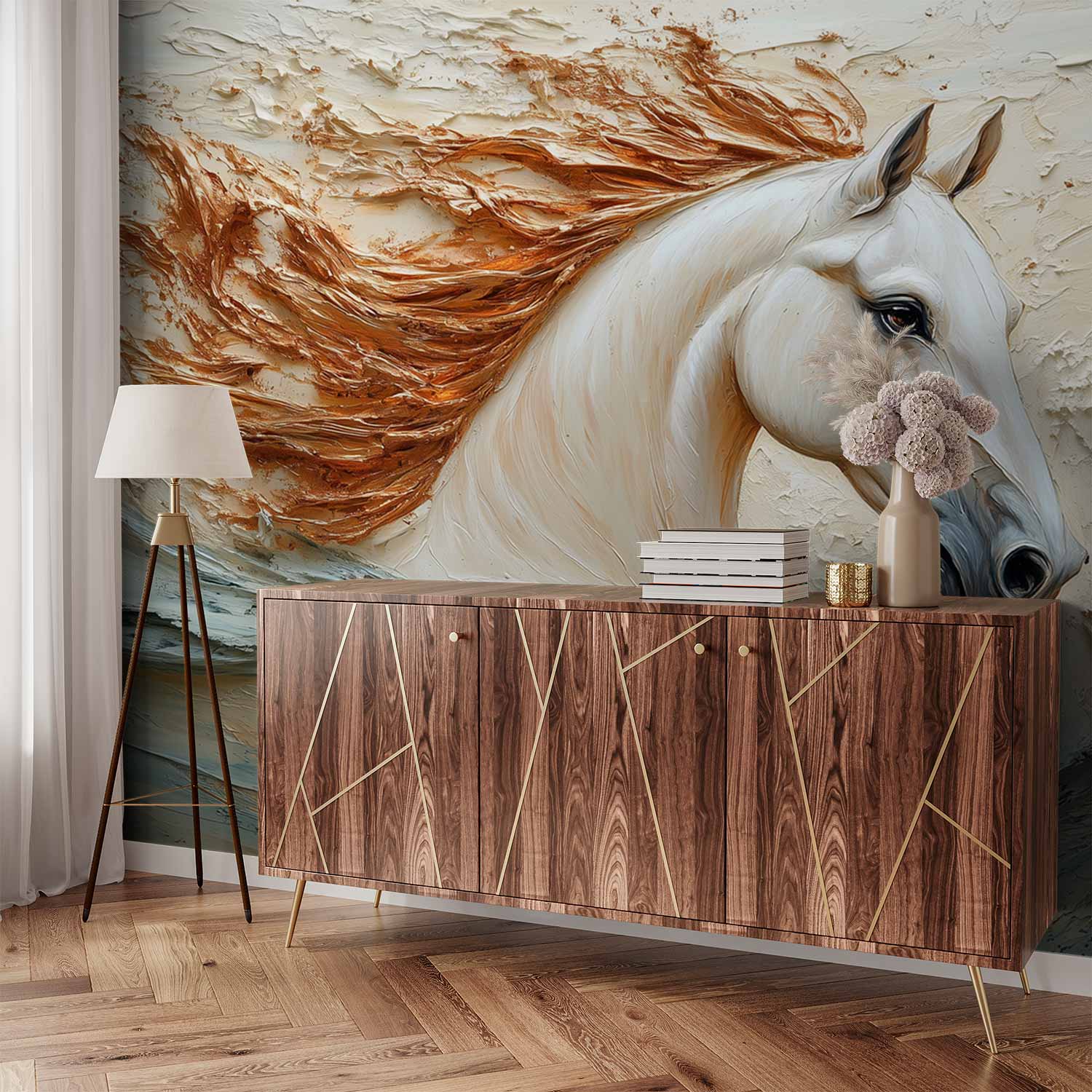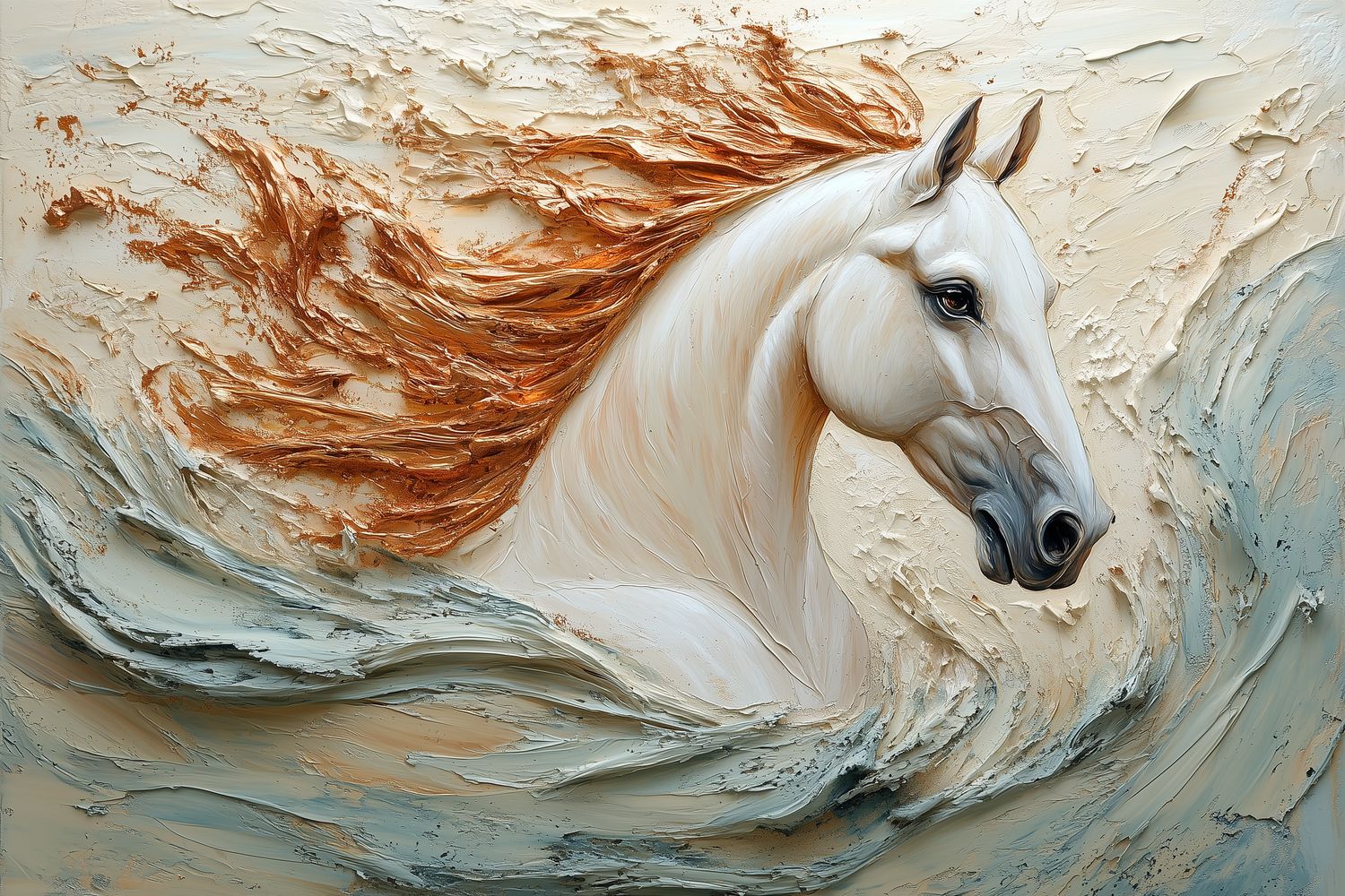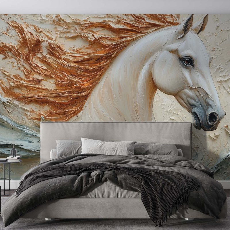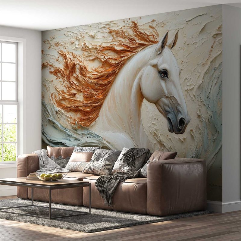 Vurig oranje golft door de witte manen van dit majestueuze paard, vastgelegd in volle beweging. Zijn realistische verschijning baadt in een waterachtige omgeving die rust en energie combineert. Warme tinten creëren een levendig middelpunt voor elke ruimte, waar dynamiek en sereniteit samenkomen. Perfect voor een statement muur die zowel kalmte als passie uitstraalt.