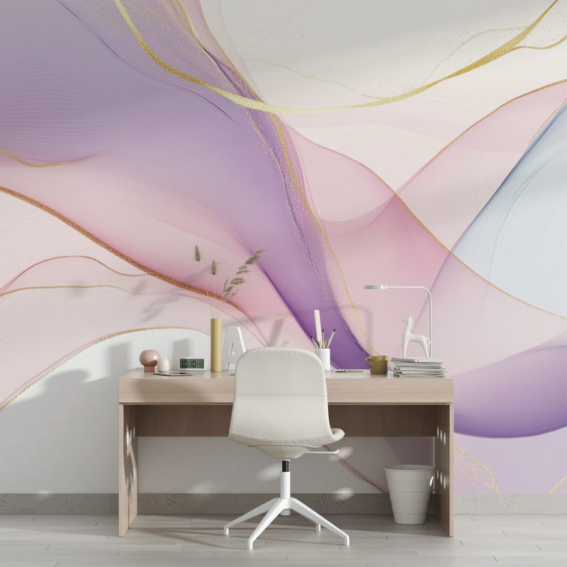 Zachte pasteltinten van roze, paars en blauw dansen elegant in vloeiende lijnen over het behang, verrijkt met luxe gouden accenten. Deze levendige abstractie brengt serene beweging en tijdloze elegantie in je interieur, terwijl de kalmerende kleurenpalet een harmonieuze sfeer creëert. Perfect om elke ruimte te transformeren tot een oase van rust en verfijning.