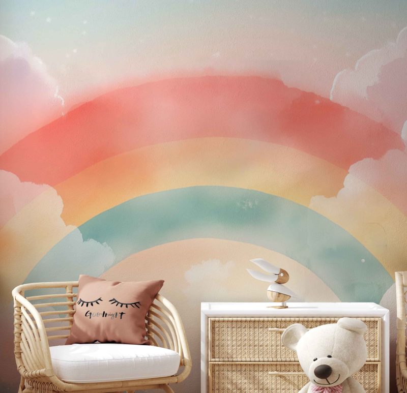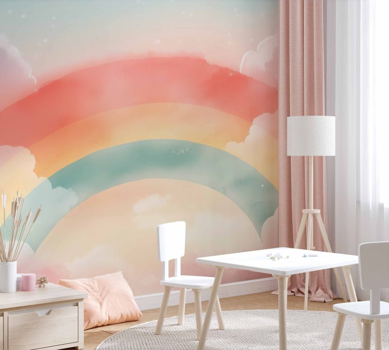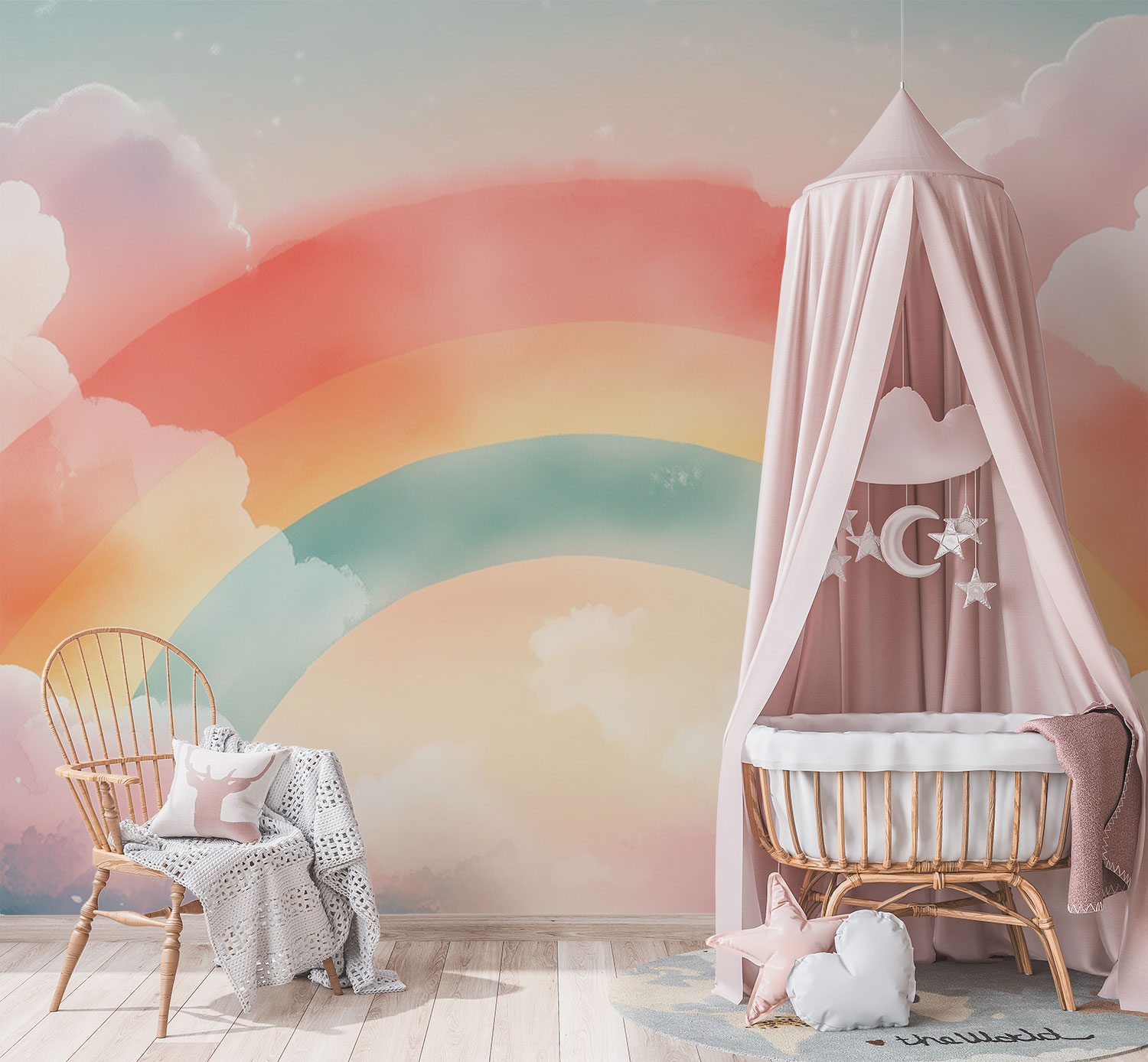 Zachte pastelwolken dansen rond een stralende regenboog die de kamer vult met warm roze, blauw en geel. Dit droomlandschap brengt magische sereniteit en verwondering, perfect om kleine dromers te omringen met vrolijke rust. De harmonieuze compositie wekt een speelse fantasiewereld tot leven waar elk moment tot avontuur wordt.